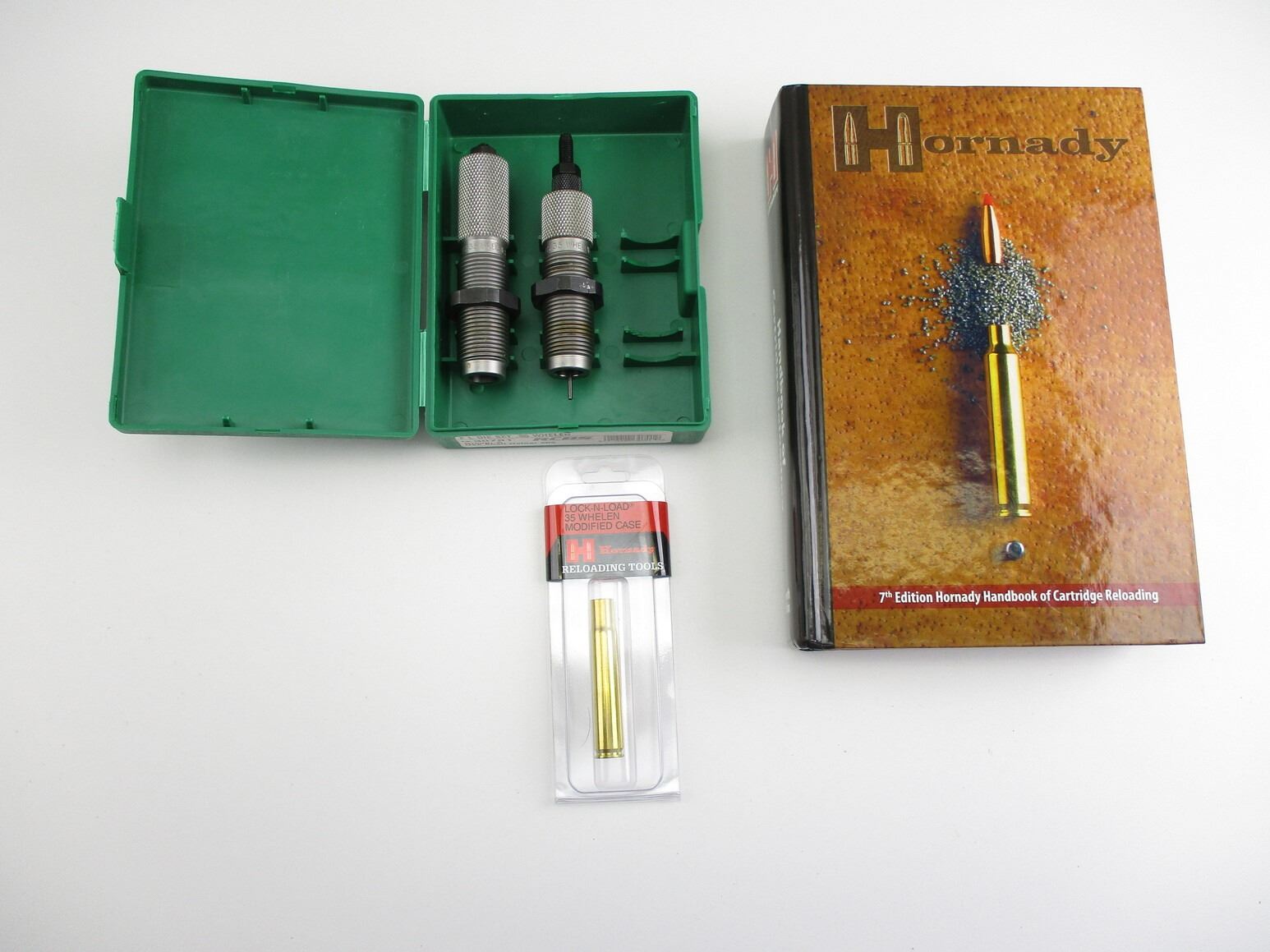 ASSORTED RELOADING ACCESSORIES LOT, LOT INCLUDES; (1) 2-PIECE RCBS .35 WHELEN RELOADING DIES, (1) HORNADY .35 WHELEN LOCK-N-LOAD MODIFIED CASE & (1) "HORNADY HANDBOOK OF CARTRIDGE RELOADING" BOOK, SEVENTH EDITION, HARD COVER. SEE PHOTOS.