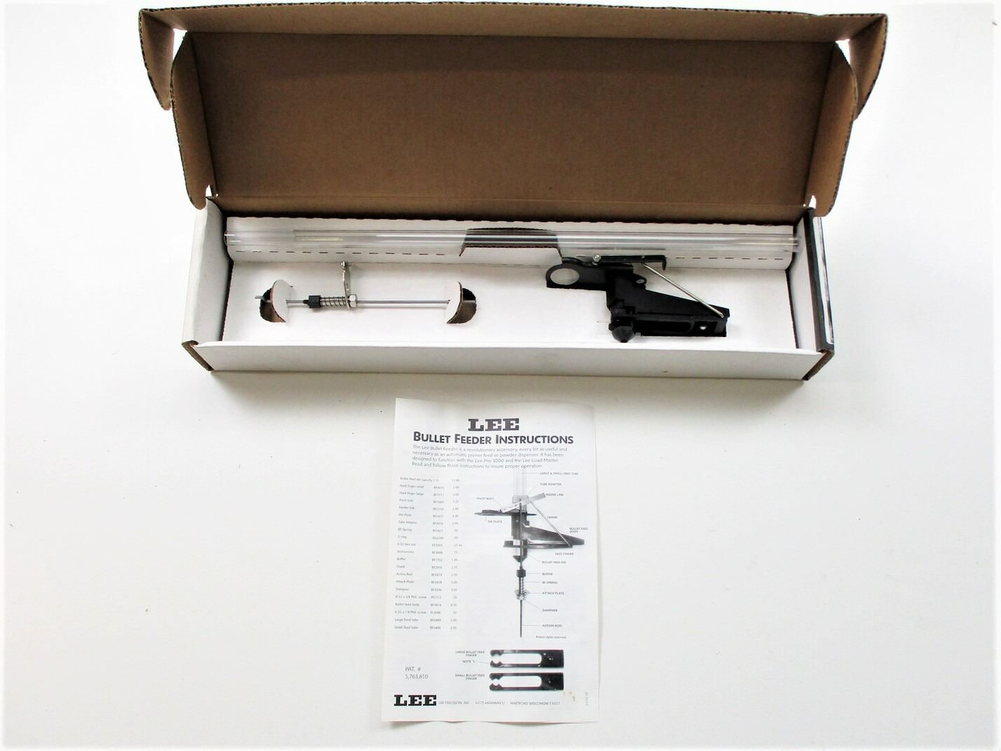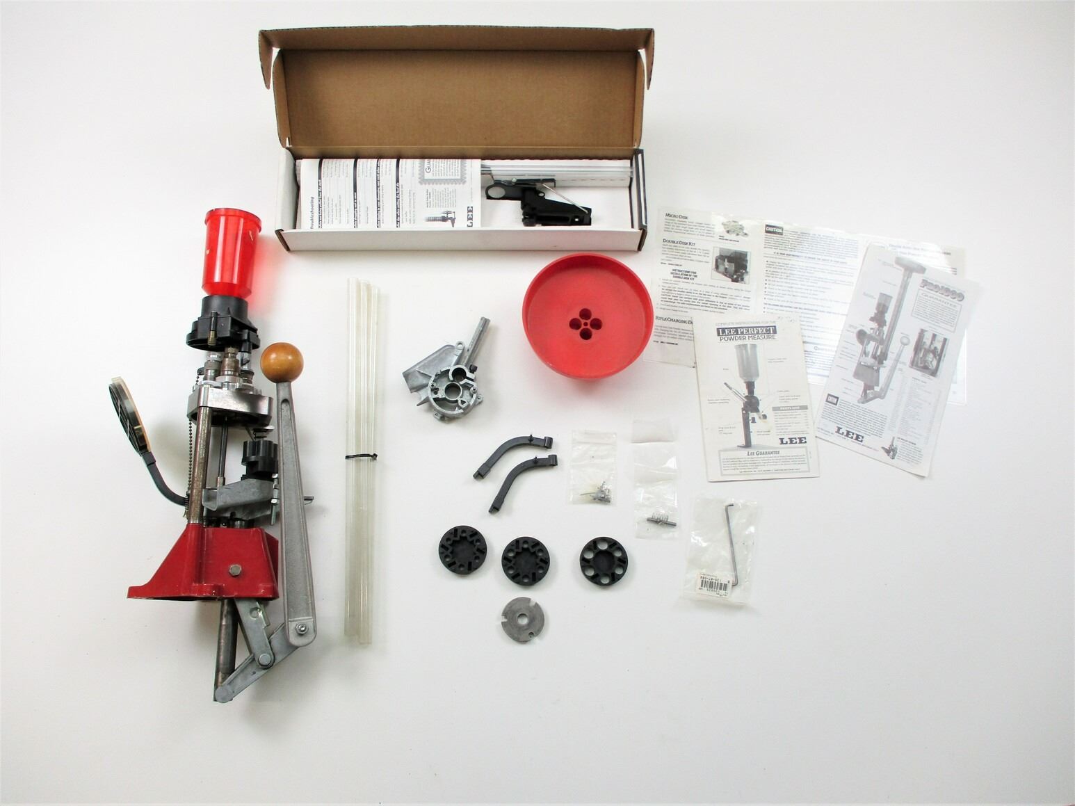 LEE RELOADING PRESS AND ACCESSORIES LOT, LOT INCLUDES; (1) LEE PRO 1000 RELOADING PRESS WITH .45 ACP RELOADING DIES ATTACHED (SOME RUST / CORROSION), MAY REQUIRE ADJUSTMENTS AND/OR MAY NOT BE COMPLETE, (1) LEE BULLET FEEDER KIT, MAY NOT BE COMPLETE, EXTRA TURRETS, BULLET FEED TUBES, ETC. SEE PHOTOS.
