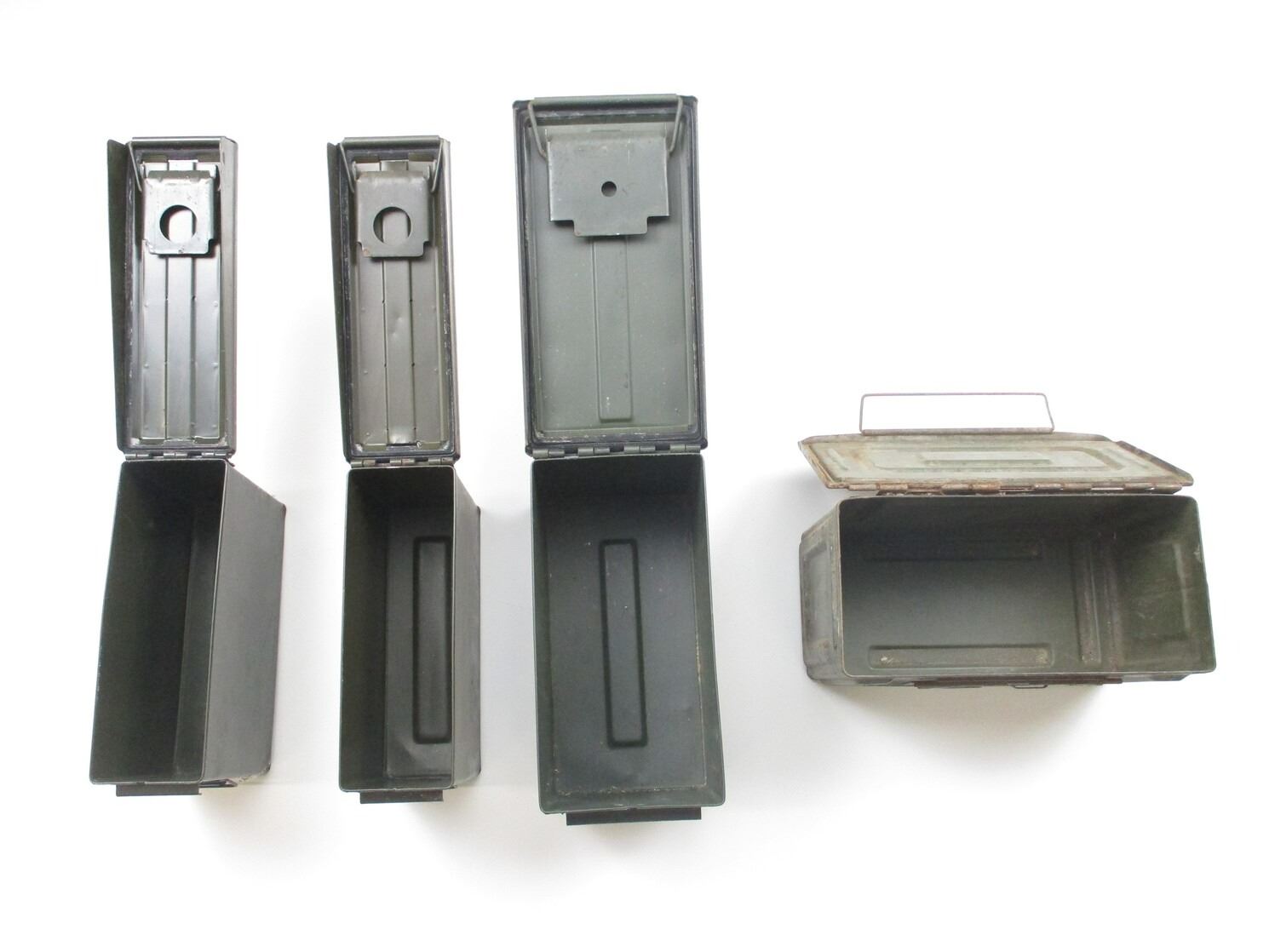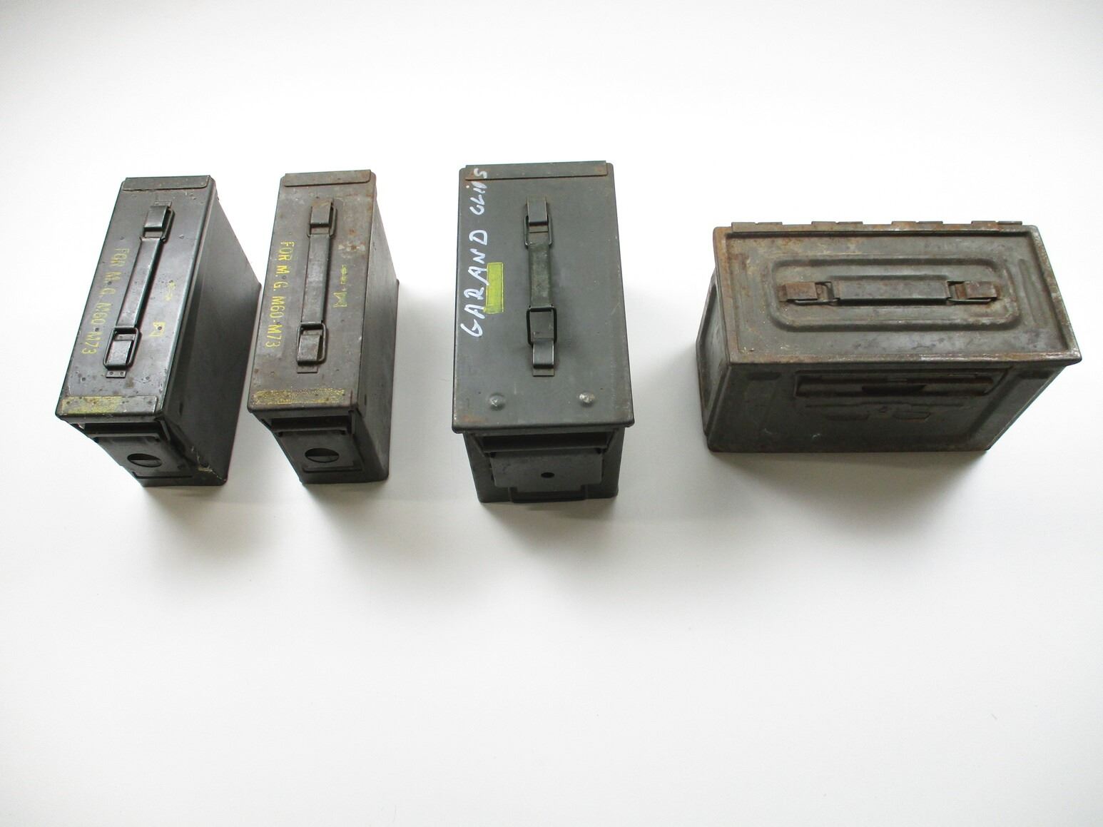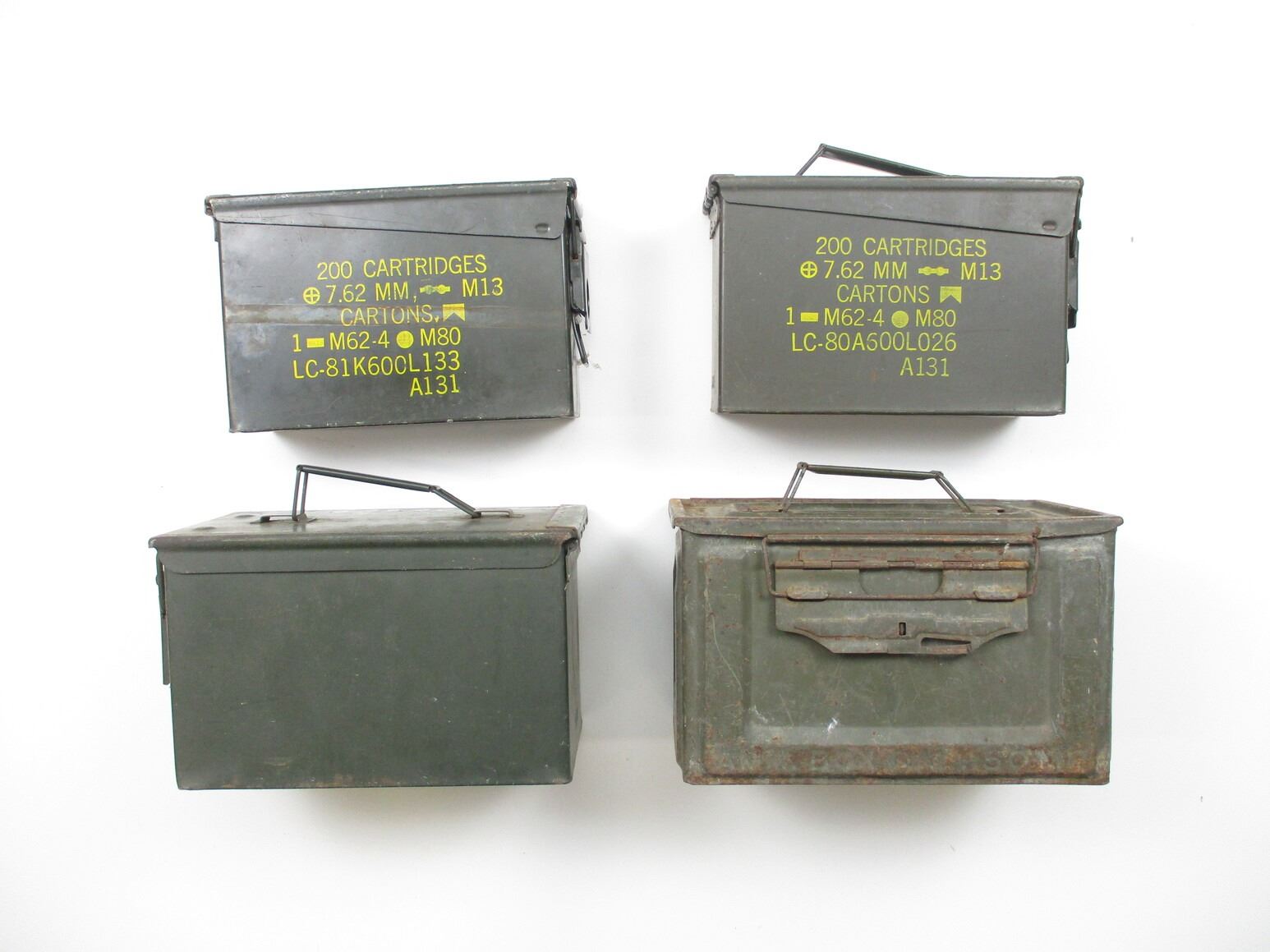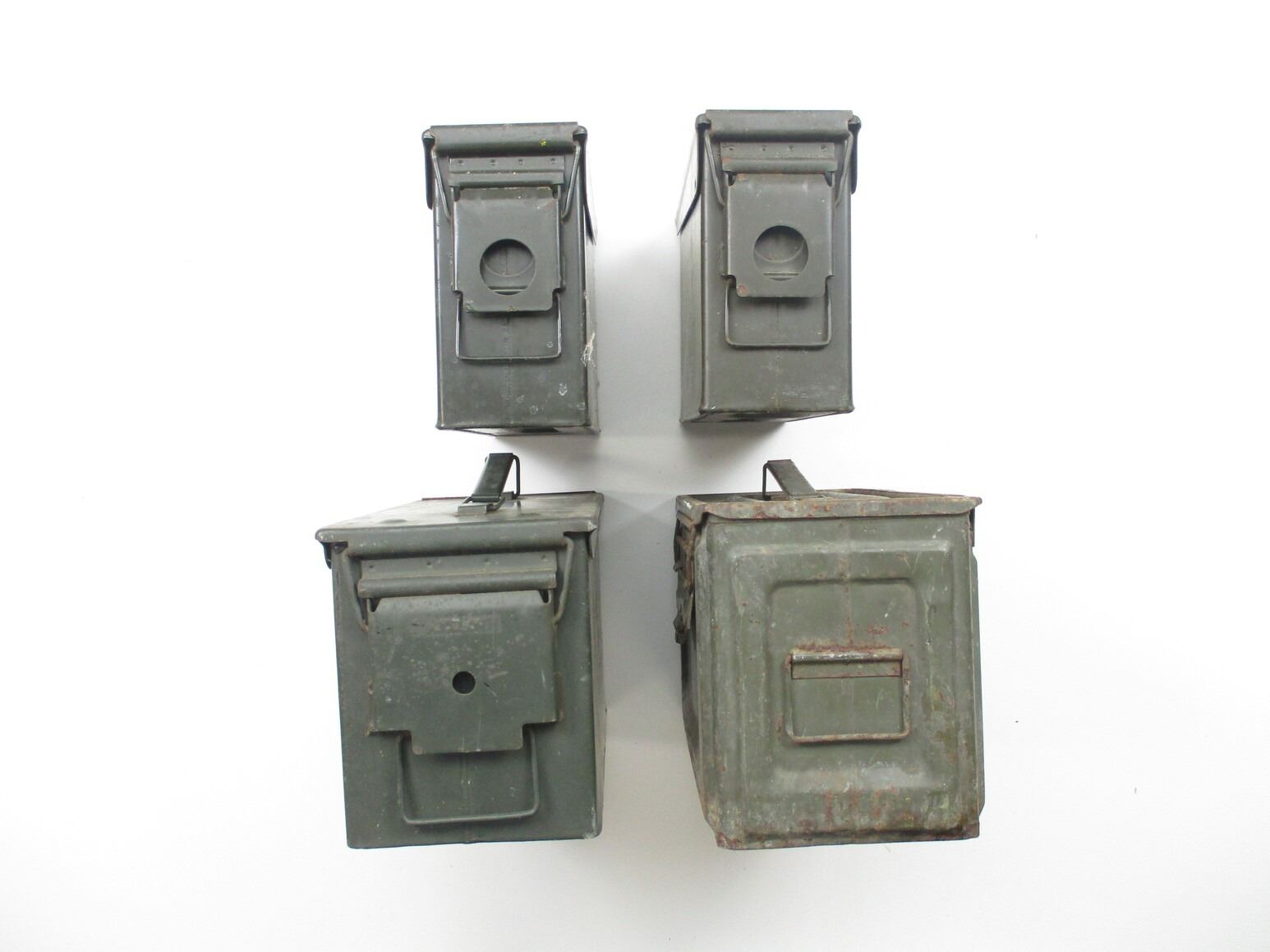 METAL AMMO TIN LOT, LOT INCLUDES; (1) GREEN METAL AMMO TIN, VARIOUS MARKINGS, APPROX. 11 3/4" x 6 1/8" x 7 1/4", (1) GREEN METAL AMMO TIN, VARIOUS MARKINGS, APPROX. 12 1/8" x 6 1/8" x 7 1/4" & (2) GREEN METAL AMMO TINS, VARIOUS MARKINGS, APPROX. 10 1/4" X 3 3/4" X 7 1/8". SEE PHOTOS.