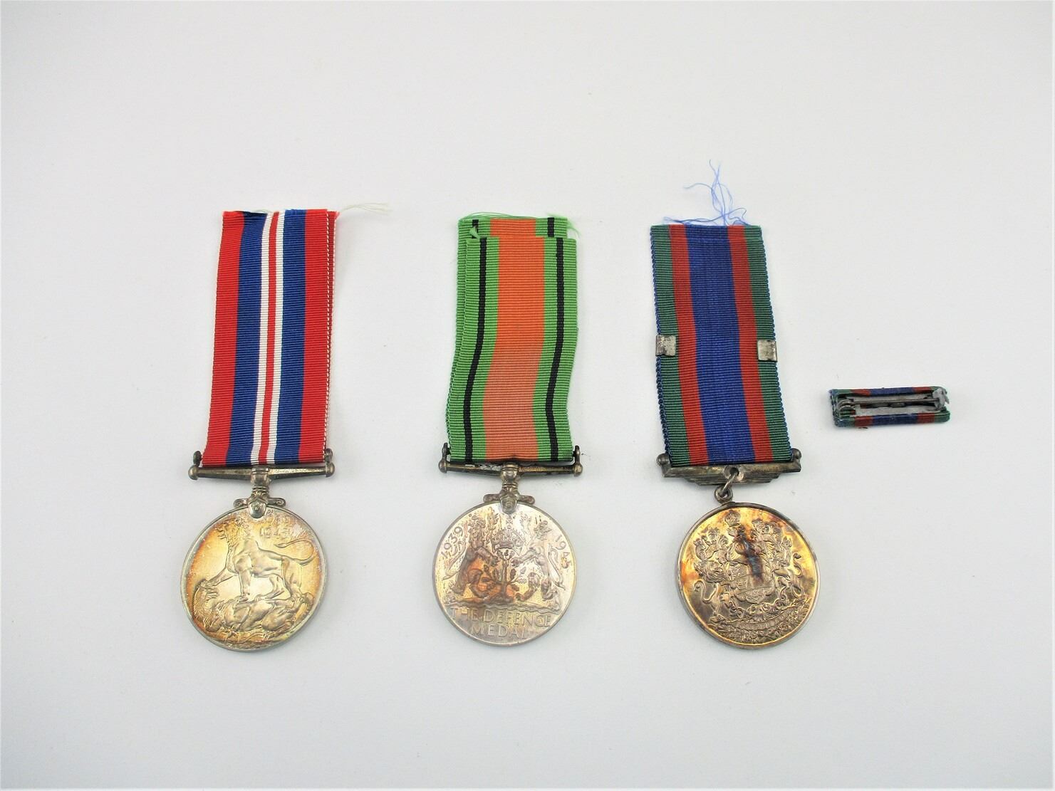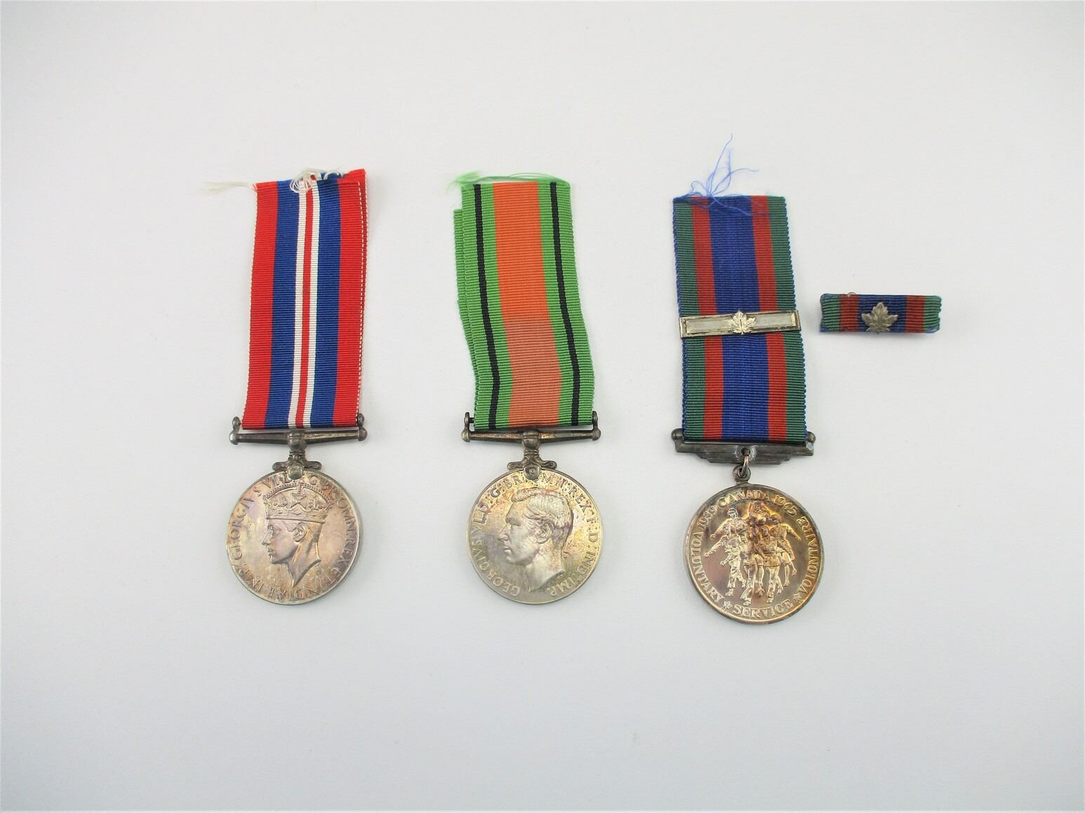 WWII CANADIAN / BRITISH MEDAL LOT, LOT INCLUDES; (1) WAR MEDAL 1939-1945 WITH RIBBON, AWARDED FOR SERVING FULL-TIME IN THE ARMED FORCES OR THE MERCHANT NAVY FOR AT LEAST 28 DAYS BETWEEN SEPTEMBER 3, 1939 & SEPTEMBER 2, 1945, CUPRO-NICKEL METAL, (1) CANADIAN VOLUNTEER SERVICE MEDAL WITH RIBBON, AWARDED TO PERSONS OF ANY RANK WHO VOLUNTARILY SERVED ON ACTIVE SERVICE & HONOURABLY COMPLETED EIGHTEEN MONTHS TOTAL VOLUNTARY SERVICE FROM SEPTEMBER 3, 1939 TO MARCH 1, 1947 & (1) 1939-1945 DEFENCE MEDAL WITH RIBBON, AWARDED FOR BOTH NON-OPERATIONAL MILITARY & CERTAIN TYPES OF CIVILIAN WAR SERVICE DURING WWII. SEE PHOTOS.