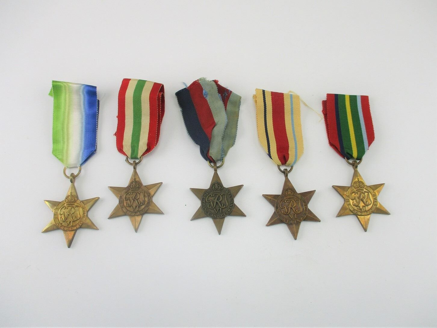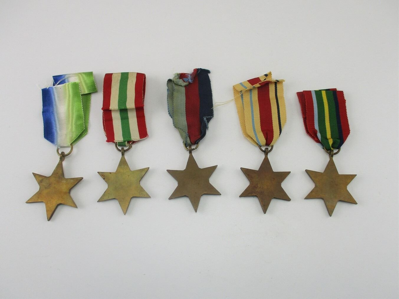 WWII ALLIED CAMPAIGN STAR LOT, LOT INCLUDES; (1) ATLANTIC, (1) PACIFIC, AFRICA, (1) ITALY AND FRANCE & (1) GERMANY, ALL WITH RIBBONS, ALL ORIGINAL. SEE PHOTOS.