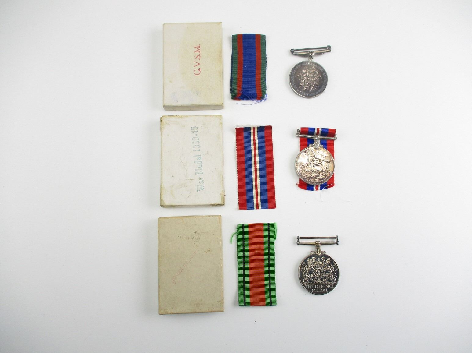 WWII CANADIAN / BRITISH MEDAL LOT, LOT INCLUDES; (1) WAR MEDAL 1939-1945 WITH RIBBON, AWARDED FOR SERVING FULL-TIME IN THE ARMED FORCES OR THE MERCHANT NAVY FOR AT LEAST 28 DAYS BETWEEN SEPTEMBER 3, 1939 & SEPTEMBER 2, 1945, CUPRO-NICKEL METAL, (1) CANADIAN VOLUNTEER SERVICE MEDAL WITH RIBBON, AWARDED TO PERSONS OF ANY RANK WHO VOLUNTARILY SERVED ON ACTIVE SERVICE & HONOURABLY COMPLETED EIGHTEEN MONTHS TOTAL VOLUNTARY SERVICE FROM SEPTEMBER 3, 1939 TO MARCH 1, 1947 & (1) 1939-1945 DEFENCE MEDAL WITH RIBBON, AWARDED FOR BOTH NON-OPERATIONAL MILITARY & CERTAIN TYPES OF CIVILIAN WAR SERVICE DURING WWII. SEE PHOTOS.