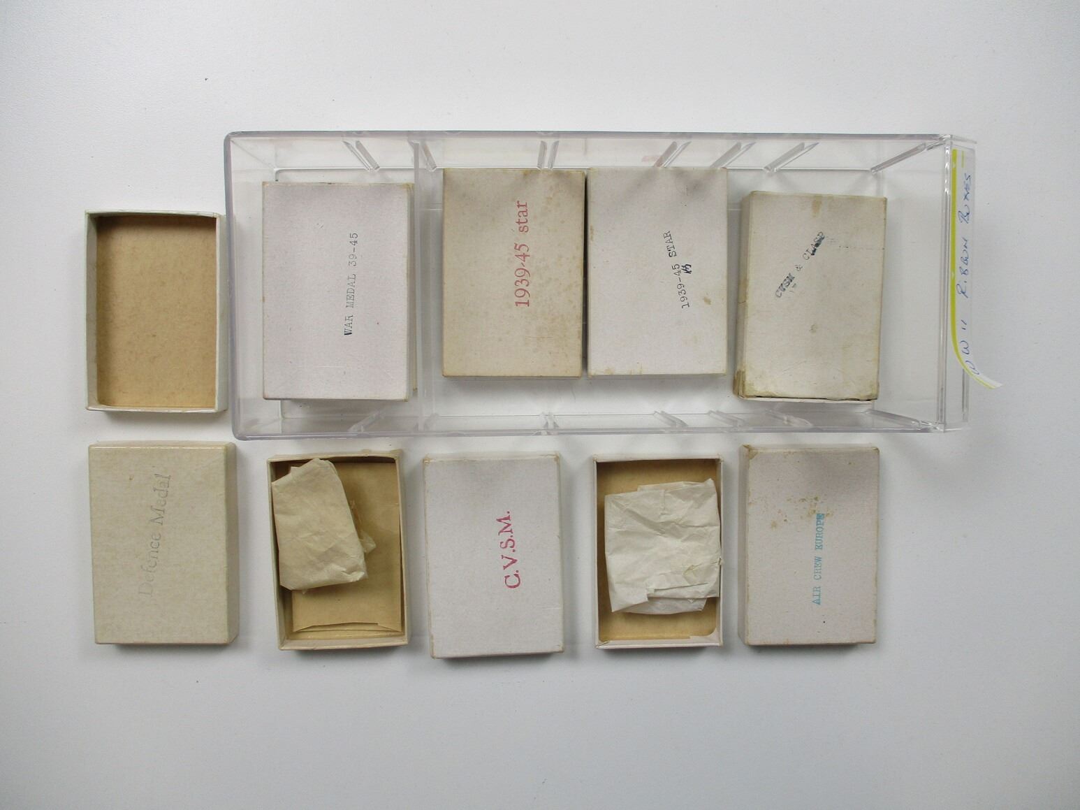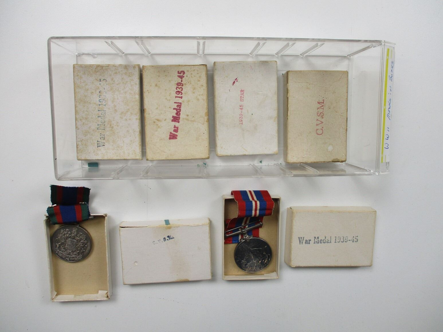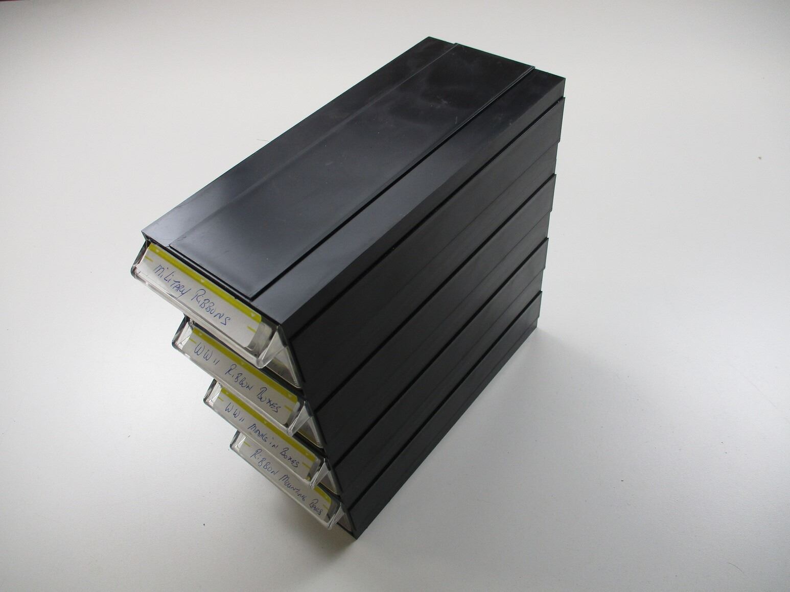 WWII / POST-WAR MEDALS, RIBBONS, BOXES, ETC. LOT, LOT INCLUDES; (8) EMPTY BOXES FOR VARIOUS WWII MEDALS, (1) 1939-45 STARS, (3) WAR MEDALS 1939-45, (2) CVSM'S ALL IN BOXES WITH RIBBONS, VARIOUS RIBBON ROLLS, WWII AND LATER, WWII AND LATER RIBBON BARS, VARIOUS SIZES, ETC. LOT ALSO INCLUDES JOBMATE UTILITY DRAWER SET OF 4. MEASURES APPROX. 9.75" L X 4.5" W X 10" H.
