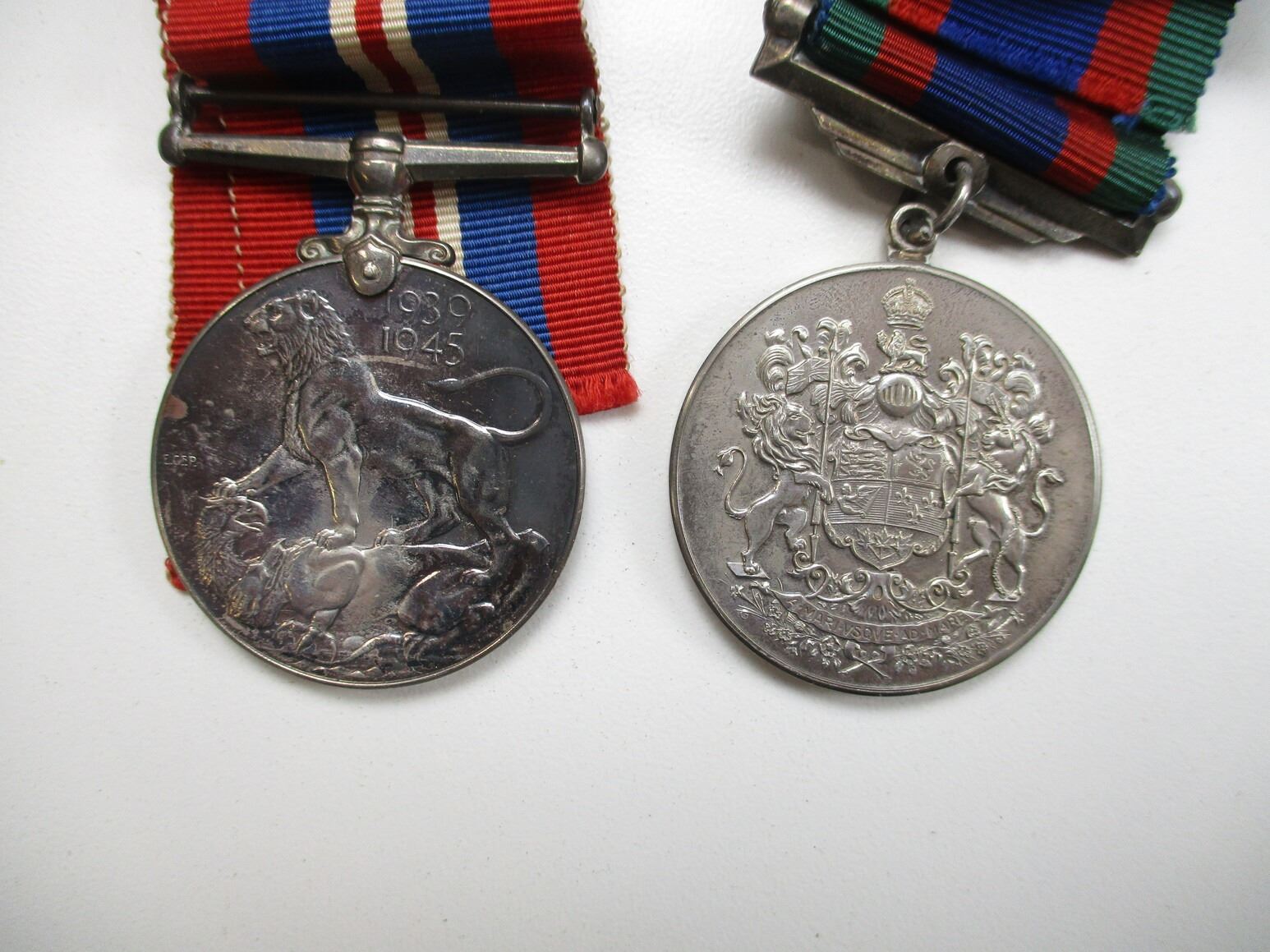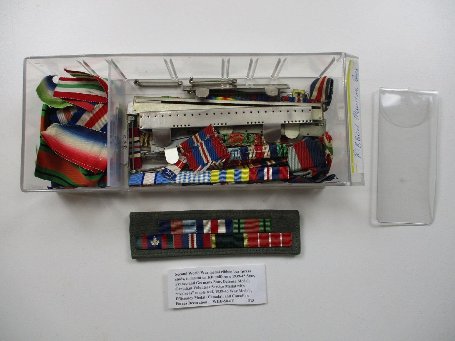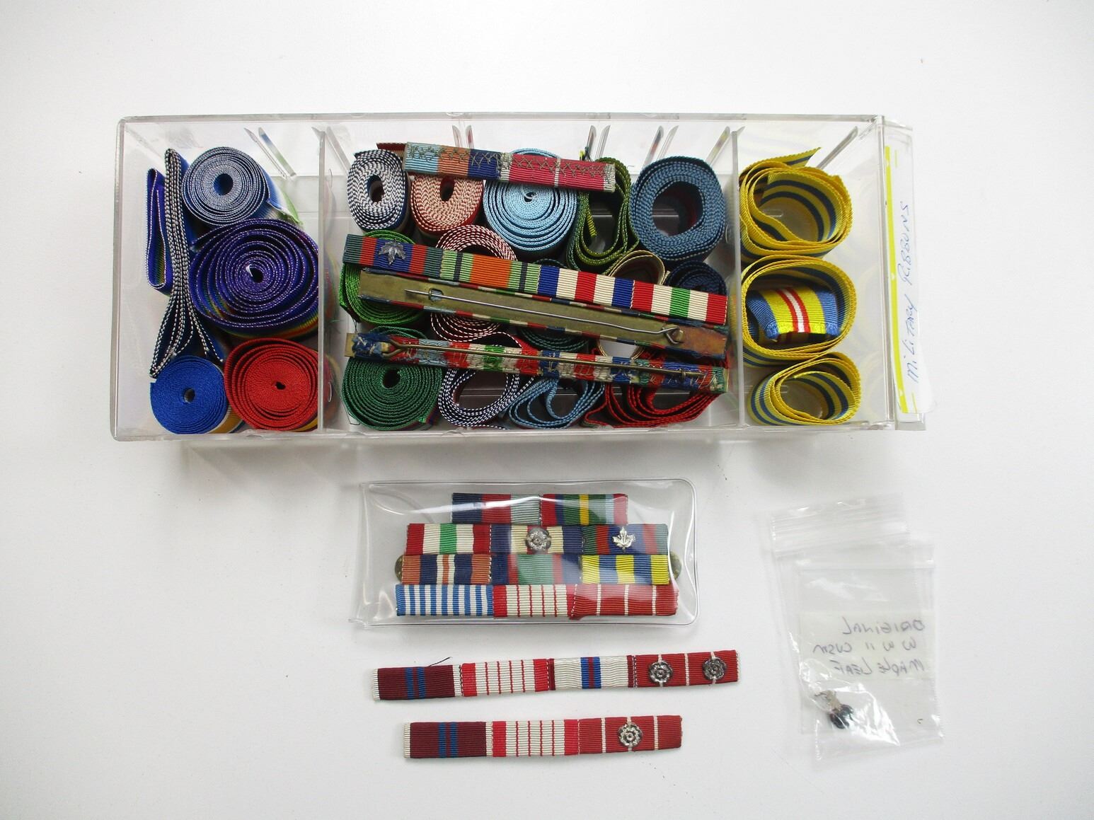 WWII / POST-WAR MEDALS, RIBBONS, BOXES, ETC. LOT, LOT INCLUDES; (8) EMPTY BOXES FOR VARIOUS WWII MEDALS, (1) 1939-45 STARS, (3) WAR MEDALS 1939-45, (2) CVSM'S ALL IN BOXES WITH RIBBONS, VARIOUS RIBBON ROLLS, WWII AND LATER, WWII AND LATER RIBBON BARS, VARIOUS SIZES, ETC. LOT ALSO INCLUDES JOBMATE UTILITY DRAWER SET OF 4. MEASURES APPROX. 9.75" L X 4.5" W X 10" H.