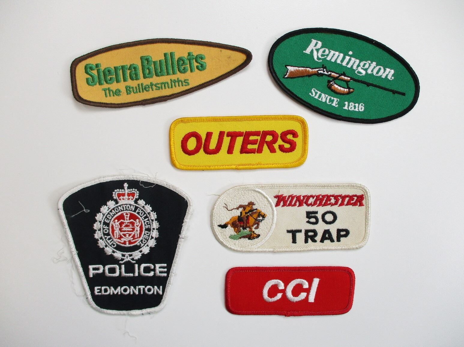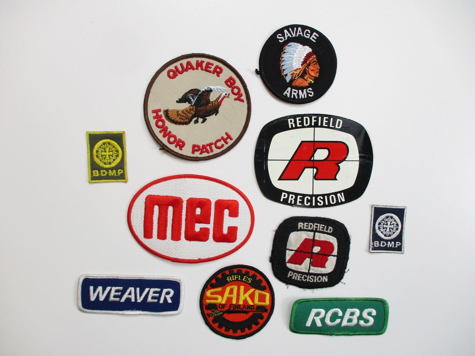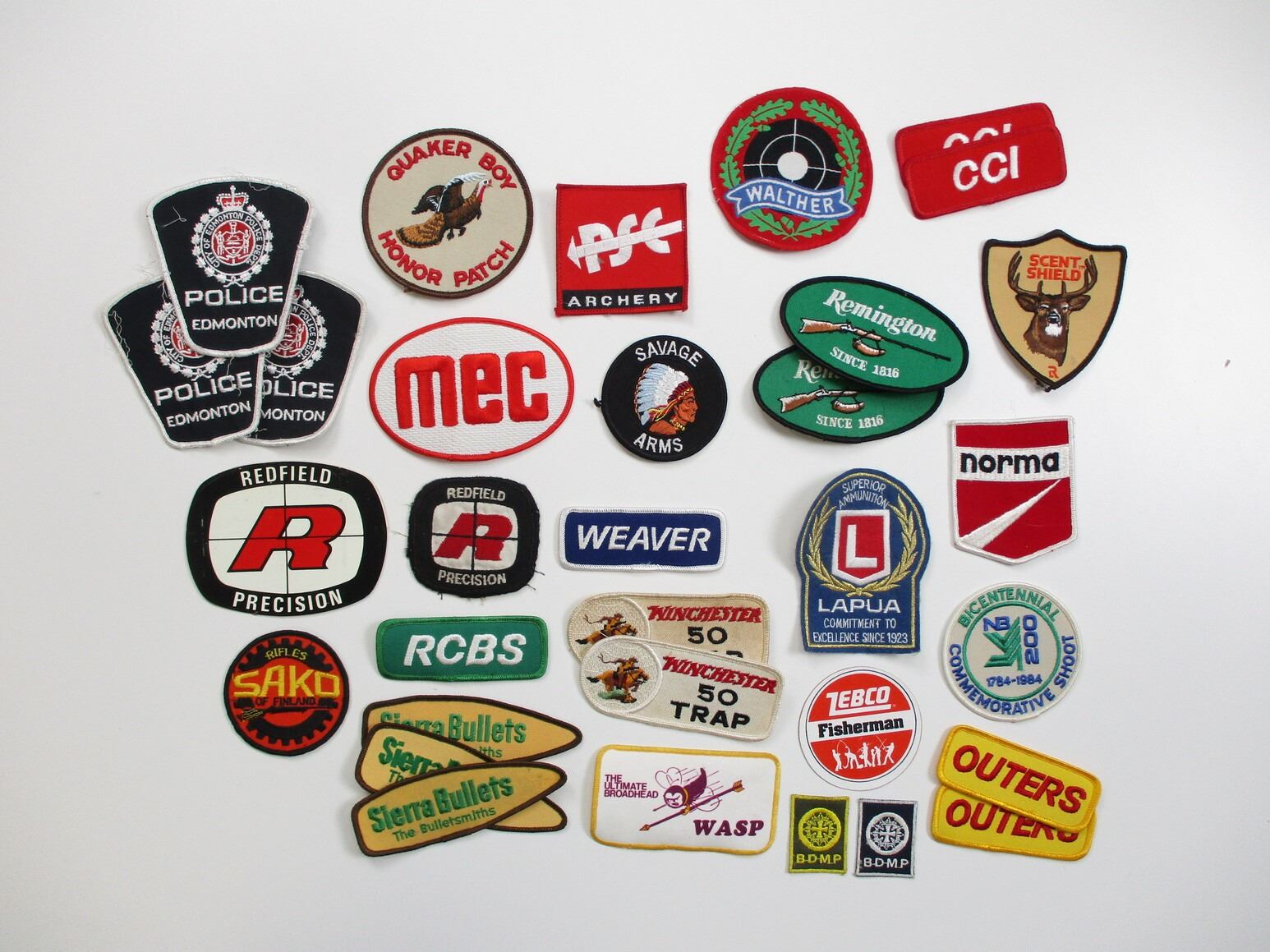 ASSORTED SHOOTING PATCH, ETC. LOT, LOT INCLUDES; CLOTH PATCHES, STICKERS, ETC., MARKED: OUTERS, RCBS, SIERRA BULLETS, MEC, WEAVER, WALTHER, CCI, WINCHESTER, ETC. SEE PHOTOS.