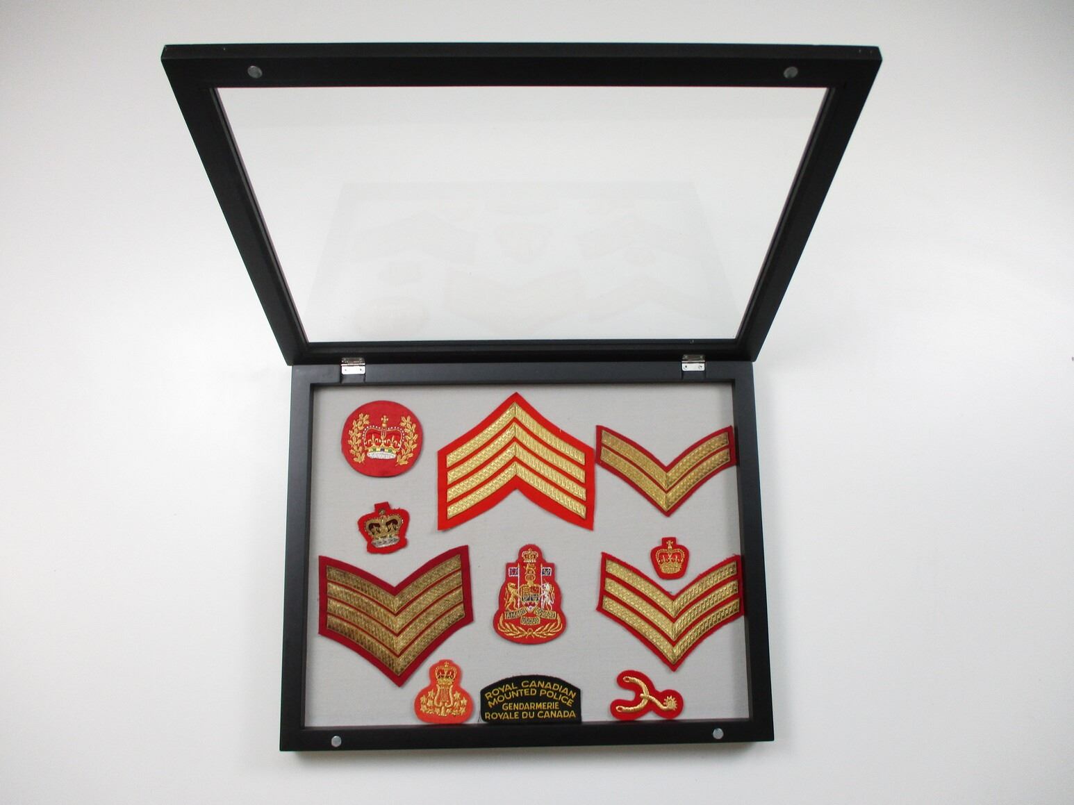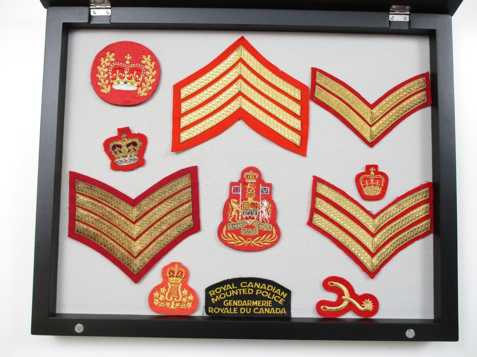 RCMP BADGE LOT, (11) ROYAL CANADIAN MOUNTED POLICE BADGES WITH DISPLAY CASE, INCLUDES; RANKS, TRADE, ETC., VARIOUS YEARS, CASE IS APPROX. 19.5" X 15.5" X 2". SEE PHOTOS. *NO GUARANTEE ON GLASS FOR SHIPPING*