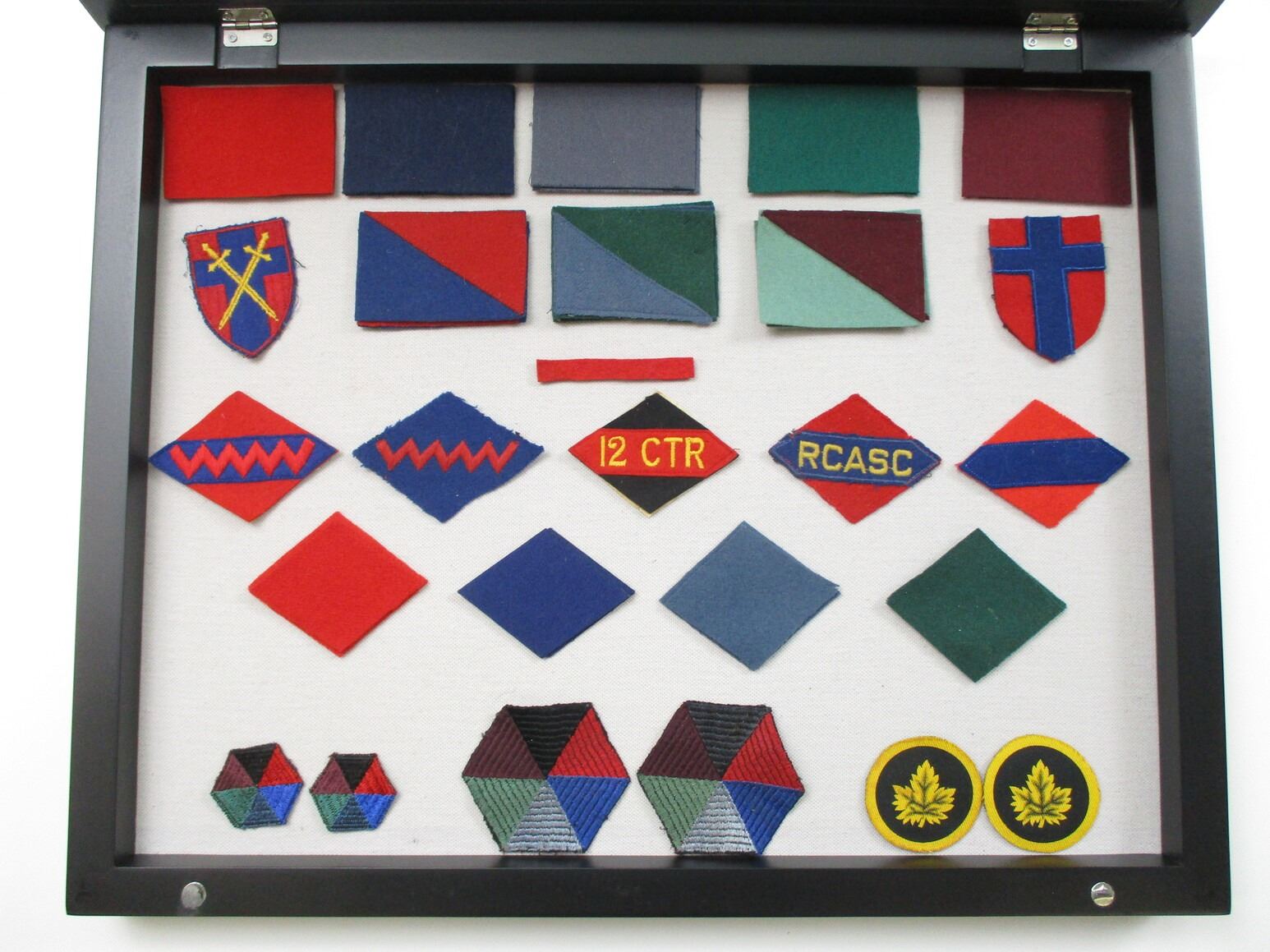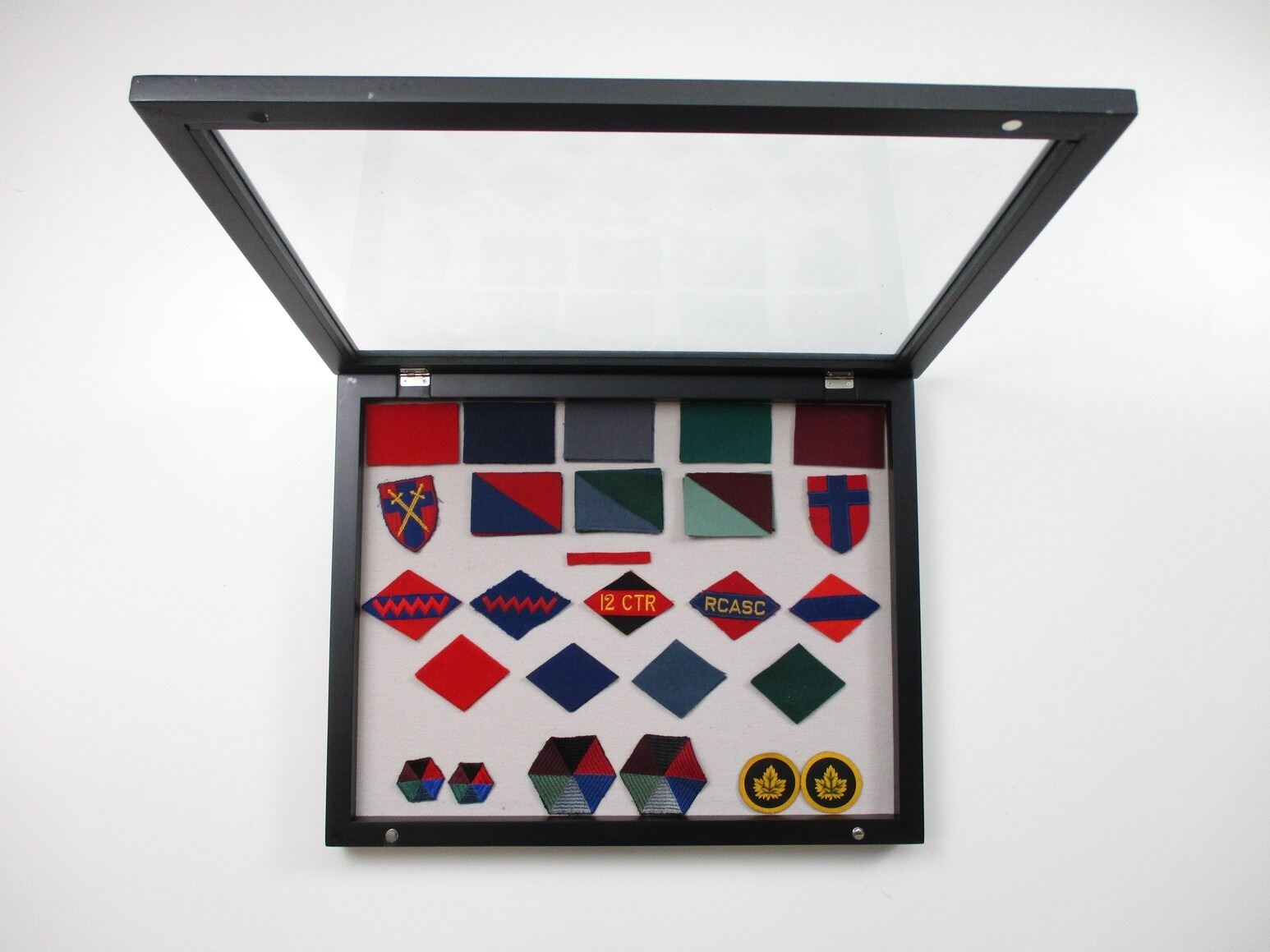 WWII ERA CANADIAN MILITARY BADGE LOT, (38) BADGES WITH DISPLAY CASE, INCLUDES; FORMATION (1ST, 2ND, 4TH & 5TH DIVISIONS), 1ST & 2ND ARMOURED DIVISION, HQ, ETC., CASE IS APPROX. 19.5" X 15.5" X 2". SEE PHOTOS. *NO GUARANTEE ON GLASS FOR SHIPPING*