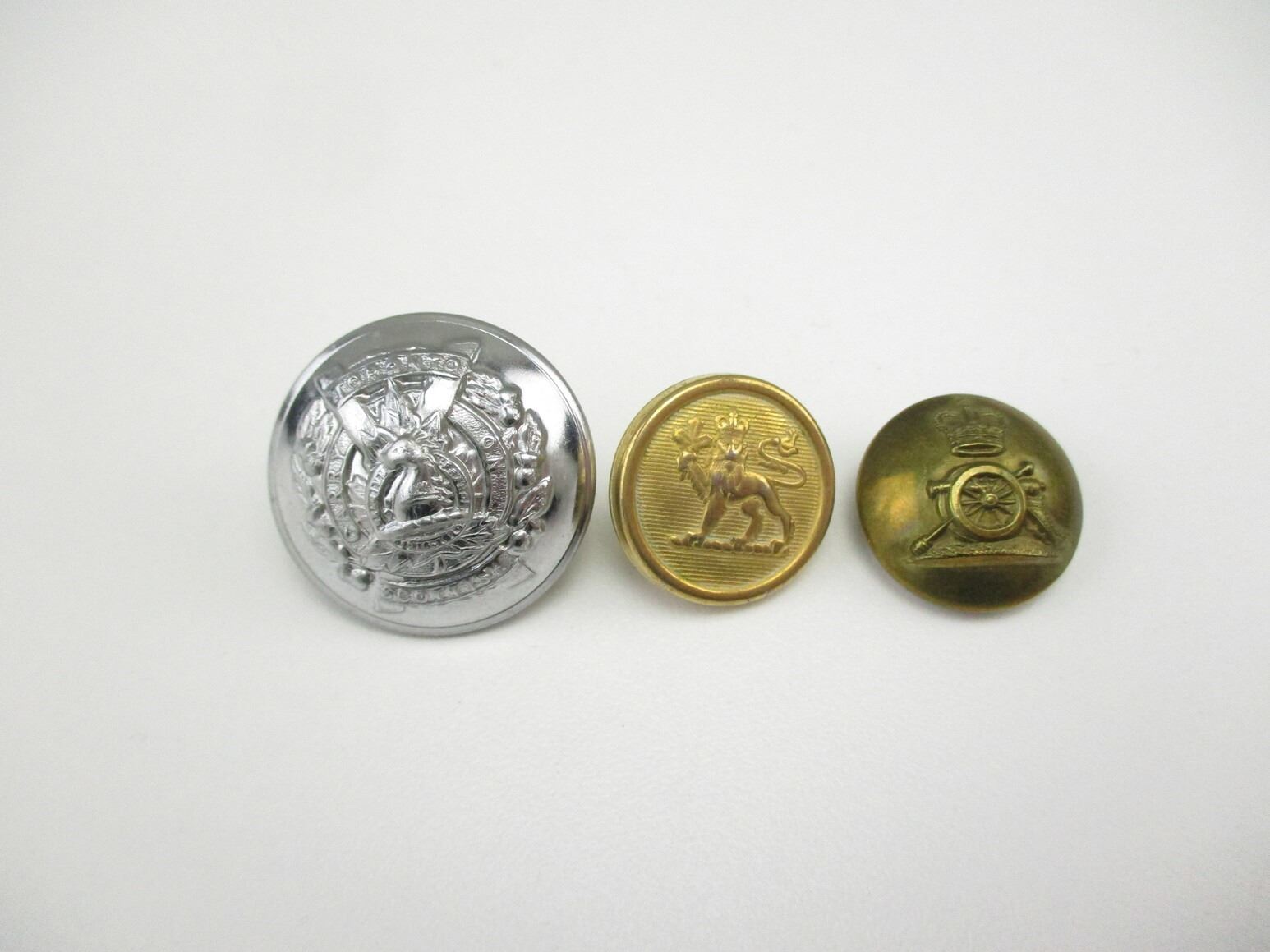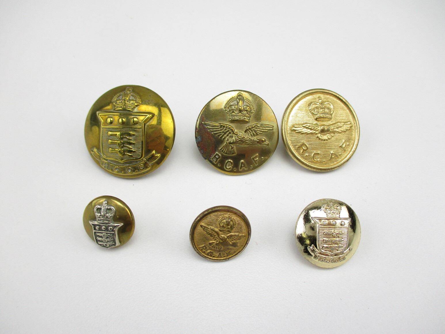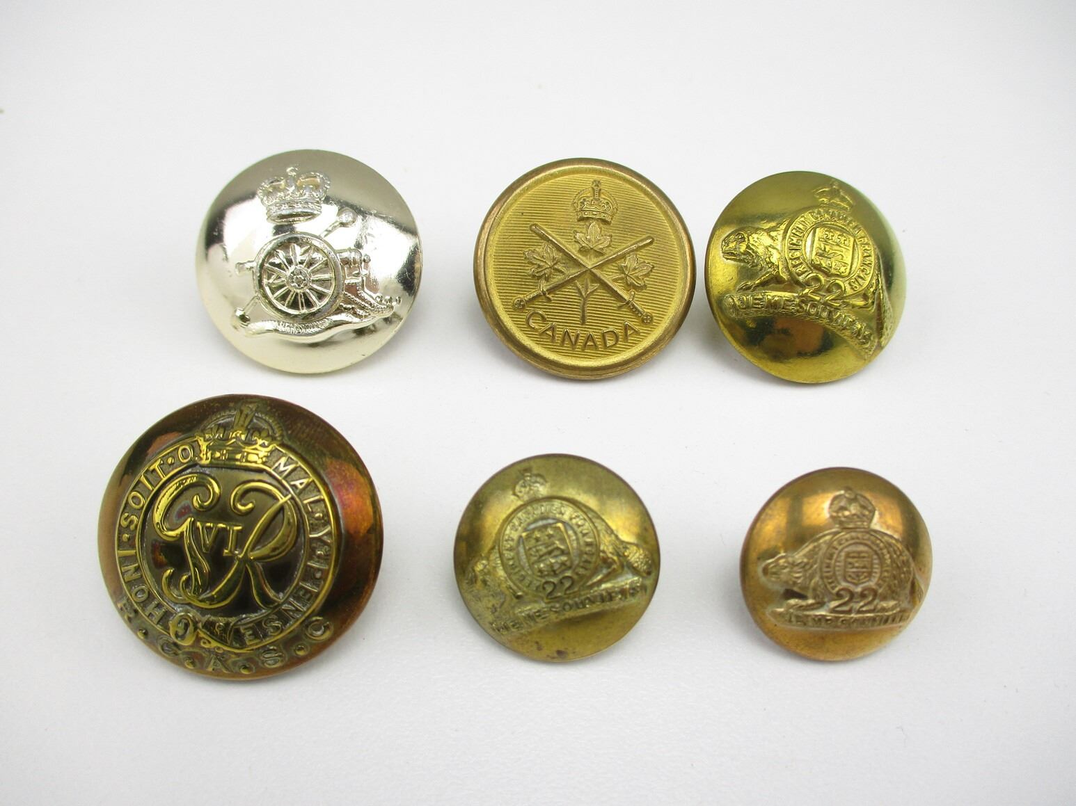 ASSORTED MILITARY RANK PIPS / BUTTONS, ETC. LOT, LOT INCLUDES; WWI / WWII TYPES, CANADIAN / BRITISH / ETC., CLOTH & METAL TYPES, ETC., MILITARY BUTTONS OF VARIOUS SIZES / UNITS / TRADES / ETC. SEE PHOTOS.