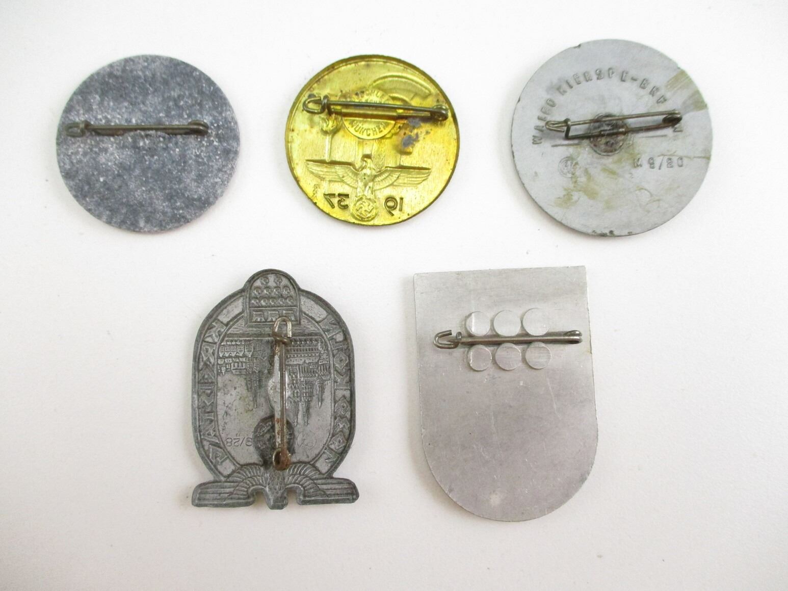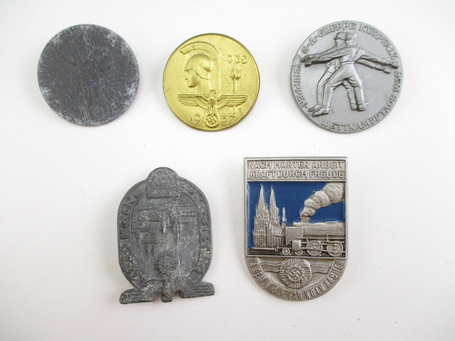 PRE-WWII GERMAN NSDAP TINNY LOT, LOT INCLUDES; (1) KUNST 1933-1937, (1) KURPFAIZ SA 1935, (1) KUNST TAG DER DEUTSCHEN 1939, (1) KOLN KREISTAG 1939 & (1) KOLN AACHEN, CONSIGNOR STATES: "100% GUARANTEED ORIGINAL". SEE PHOTOS.