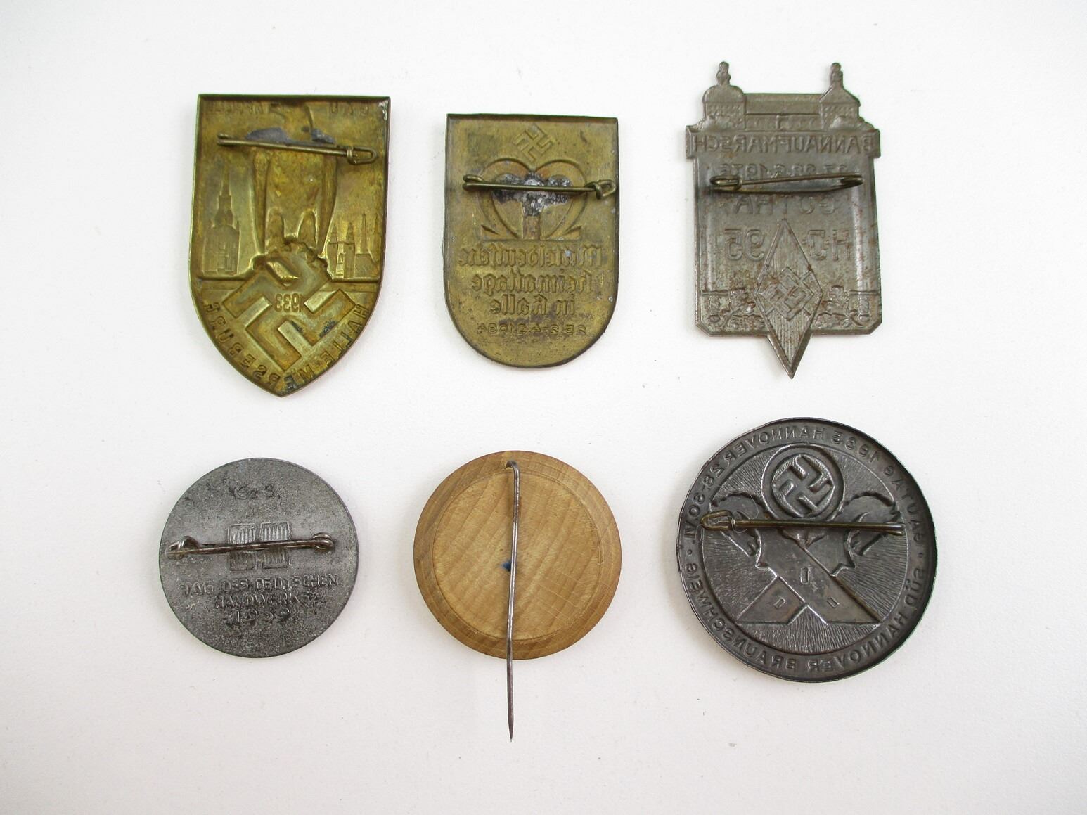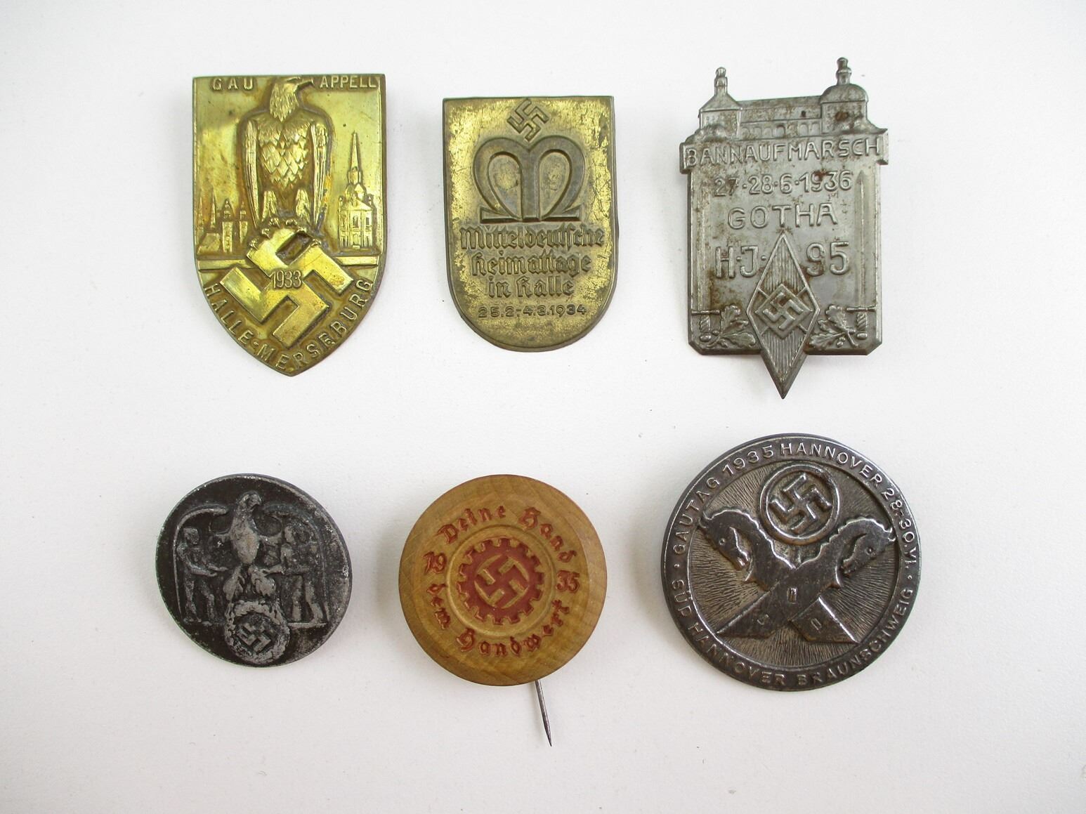 PRE-WWII GERMAN NSDAP TINNY LOT, LOT INCLUDES; (1) HALTE GAU 1933, (1) HALTE 1934, (1) HANDWERK 1935, (1) HANNOVER 1935, (1) GOTHA HJ 1936 & (1) HANDWERK 1939, CONSIGNOR STATES: "100% GUARANTEED ORIGINAL". SEE PHOTOS.