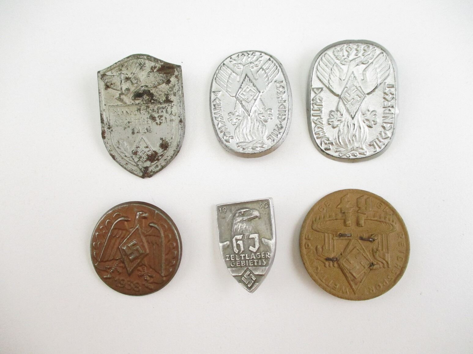 PRE-WWII GERMAN NSDAP TINNY LOT, LOT INCLUDES; (2) JUGEND 1935, (1) HJ ZELTLAGER 1935, (1) HJ 1938, (1) HJ BANN-UNTERGAU 1938 & (1) HJ REICHSPORT 1939, CONSIGNOR STATES: "100% GUARANTEED ORIGINAL". SEE PHOTOS.