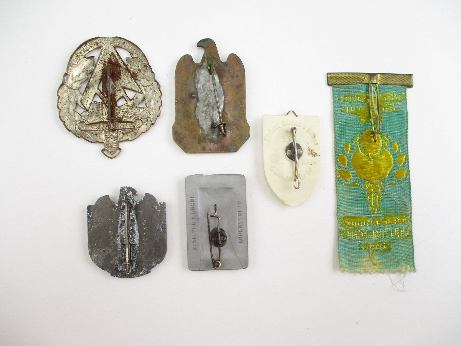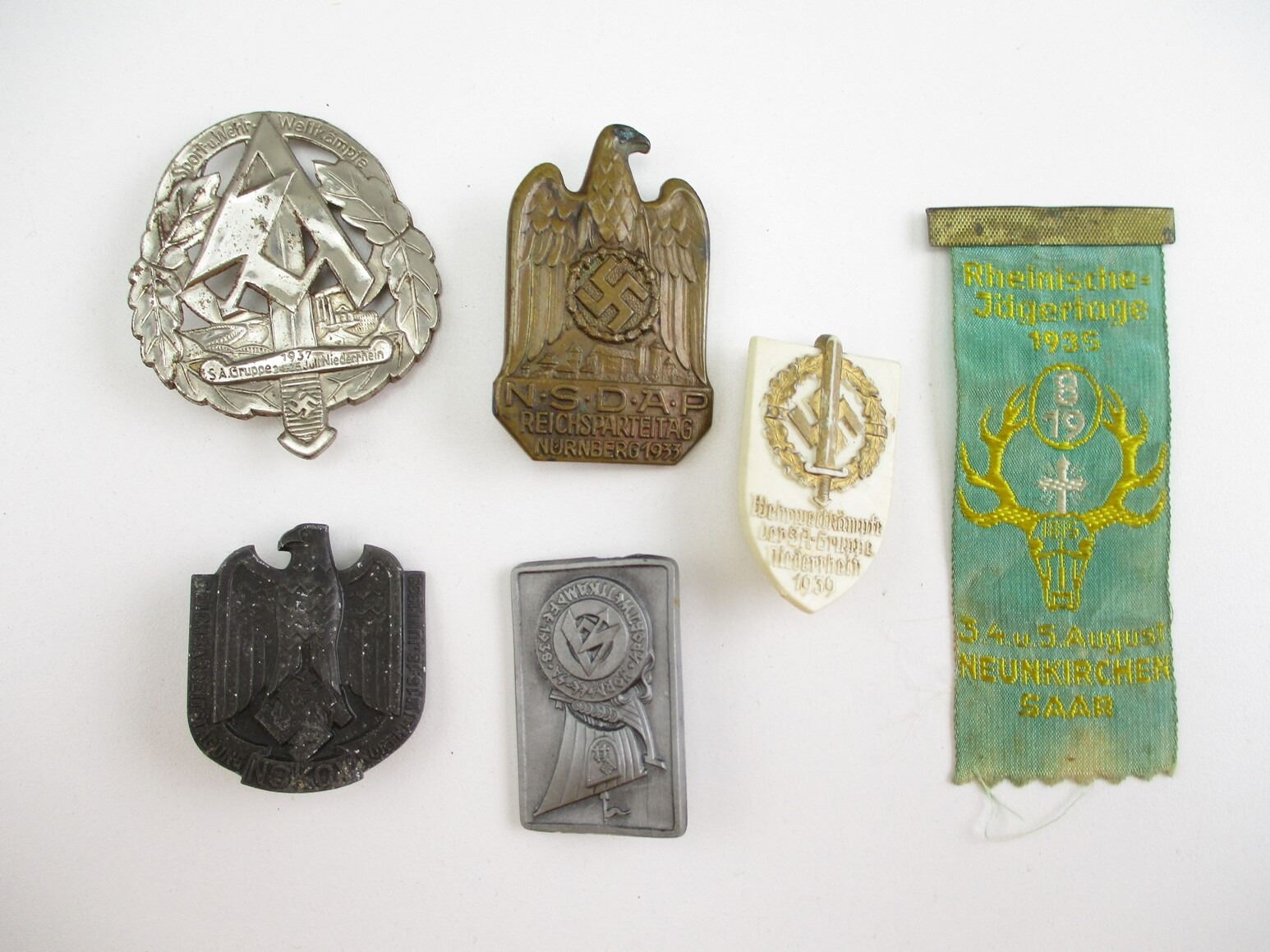 PRE-WWII GERMAN NSDAP TINNY LOT, LOT INCLUDES; (1) NURNBERG NSDAP 1933, (1) NEUNKIRCHEN 1935, (1) NIEDERRHEIN SA 1935, (1) NIEDERRHEIN SA 1937, (1) NORDSEE SA 1938 & (1) NORTHERN NSKOV 1939, CONSIGNOR STATES: "100% GUARANTEED ORIGINAL". SEE PHOTOS.