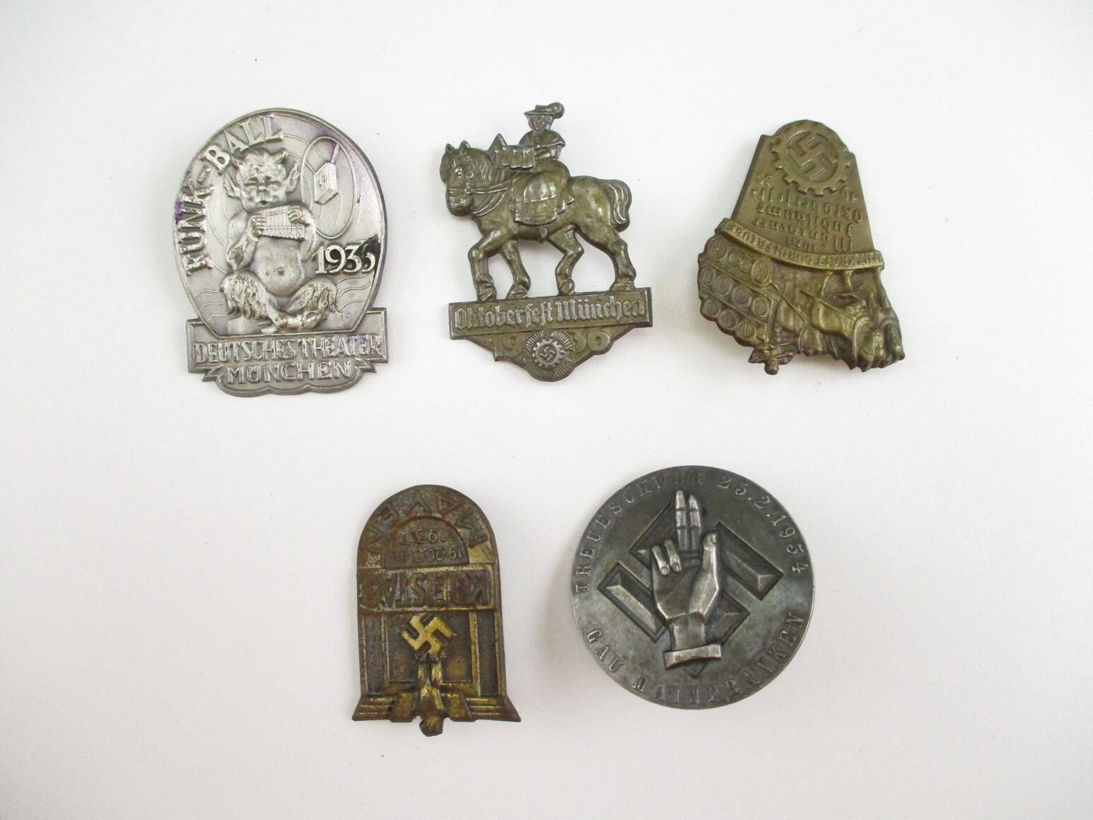PRE-WWII GERMAN NSDAP TINNY LOT, LOT INCLUDES; (1) MAINFRANKEN GAU 1934, (1) MUNCHEN FUNK BALL 1935, MUNCHEN OCTOBERFEST 1935, (1) MUNCHEN OCTOBERFEST 1936 & (1) MAYEN KREISTAG 1937, CONSIGNOR STATES: "100% GUARANTEED ORIGINAL". SEE PHOTOS.