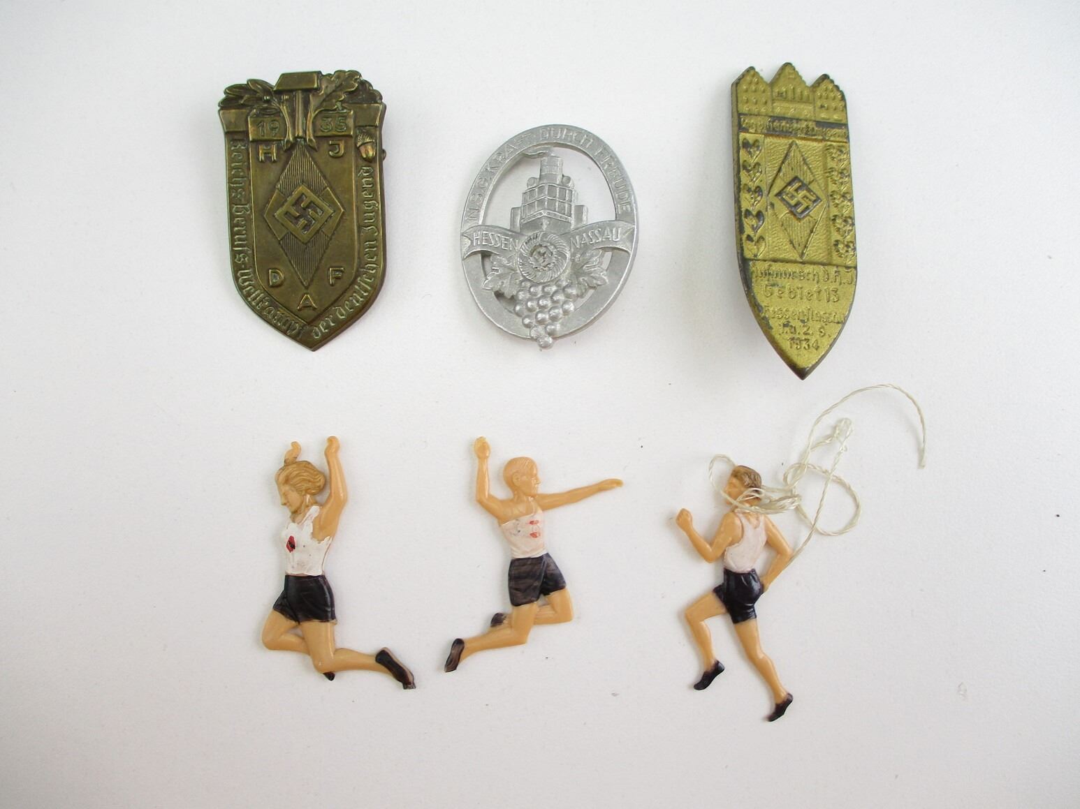 PRE-WWII GERMAN NSDAP TINNY LOT, LOT INCLUDES; (1) HJ 0011, (1) HJ 0012, (1) HJ 0016, (1) HESSEN NASSAU, (1) HESSEN 1934 & (1) JUGEND HJ/DAF 1935, CONSIGNOR STATES: "100% GUARANTEED ORIGINAL". SEE PHOTOS.