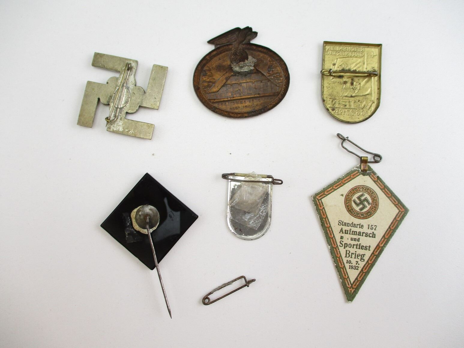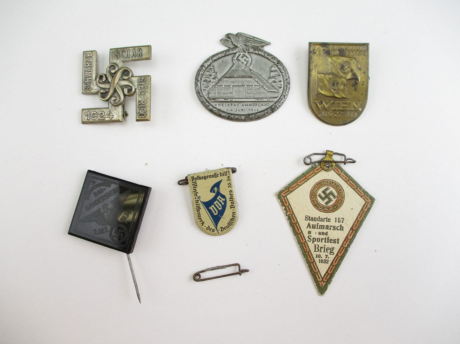 PRE-WWII GERMAN NSDAP TINNY LOT, LOT INCLUDES; (1) SCHWARZE, SCHAR, SIEGFRIED 1924, (1) SPORTFEST BREIG 1932, (1) DEUTFCHEN DOLKES 33/34, (1)BAD - GANDERSHEIM 1934, (1) KREISTAG AMMERLAND 1939 & (1) REICHSKLEIN CARTNERTAG 1939, CONSIGNOR STATES: "100% GUARANTEED ORIGINAL". SEE PHOTOS.