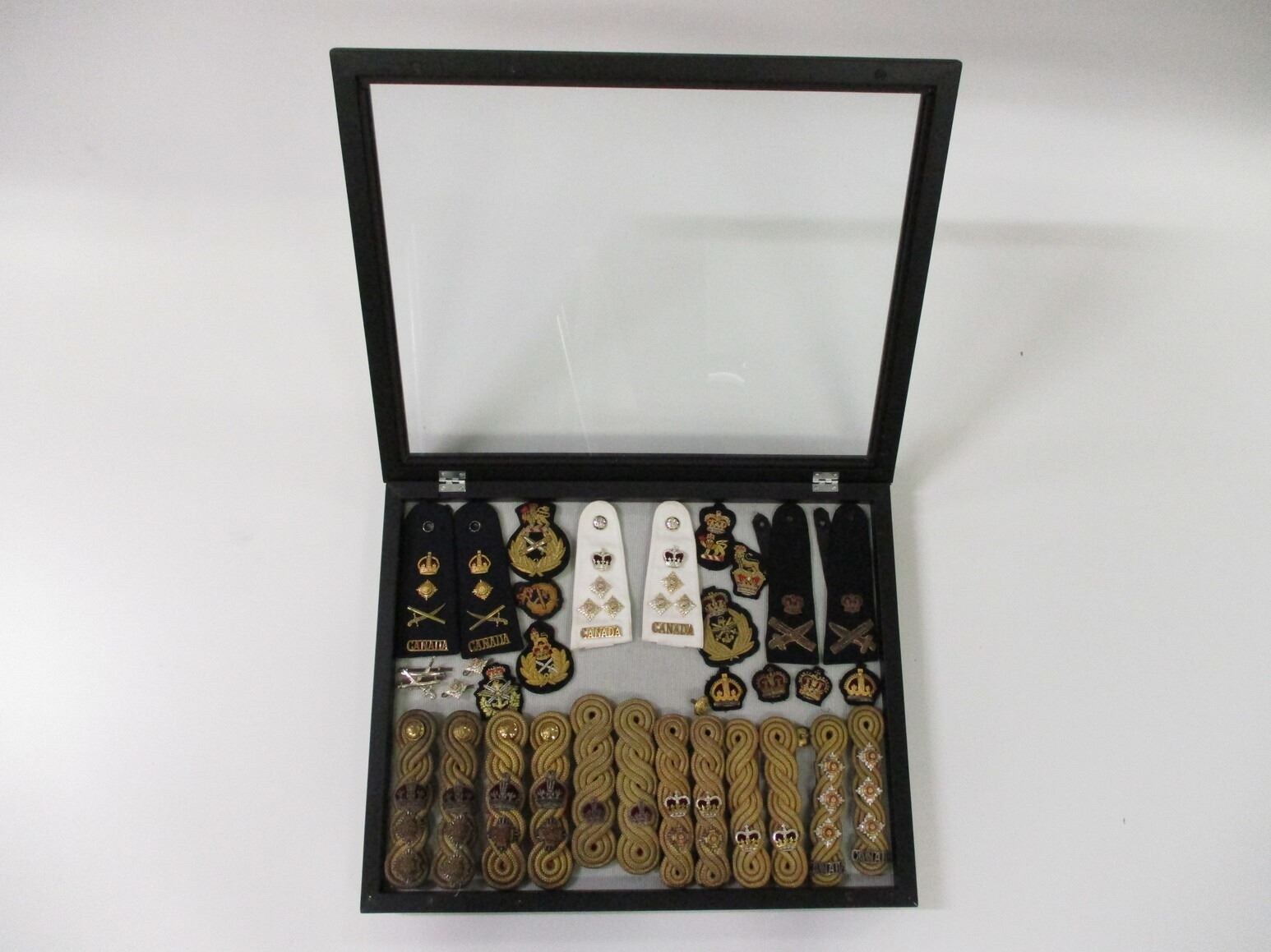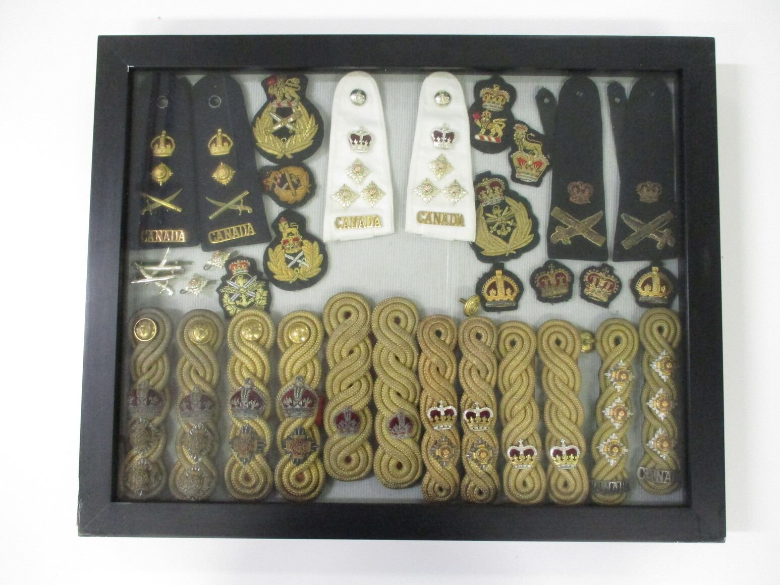 ASSORTED CANADIAN MILITARY BADGES LOT, APPROX. (29) BADGES INCLUDING; NAVY, AIRFORCE AND ARMY BADGES. OFFICERS RANK PIPS, WIRE BULLION, THREAD CAP BADGES, SHOULDER BOARDS. RCR, RCA, SEAFORTH HIGHLANDERS BUTTONS ON SOME, CASE IS APPROX. 19.5" X 15.5" X 2". SEE PHOTOS. *NO GUARANTEE ON GLASS FOR SHIPPING*