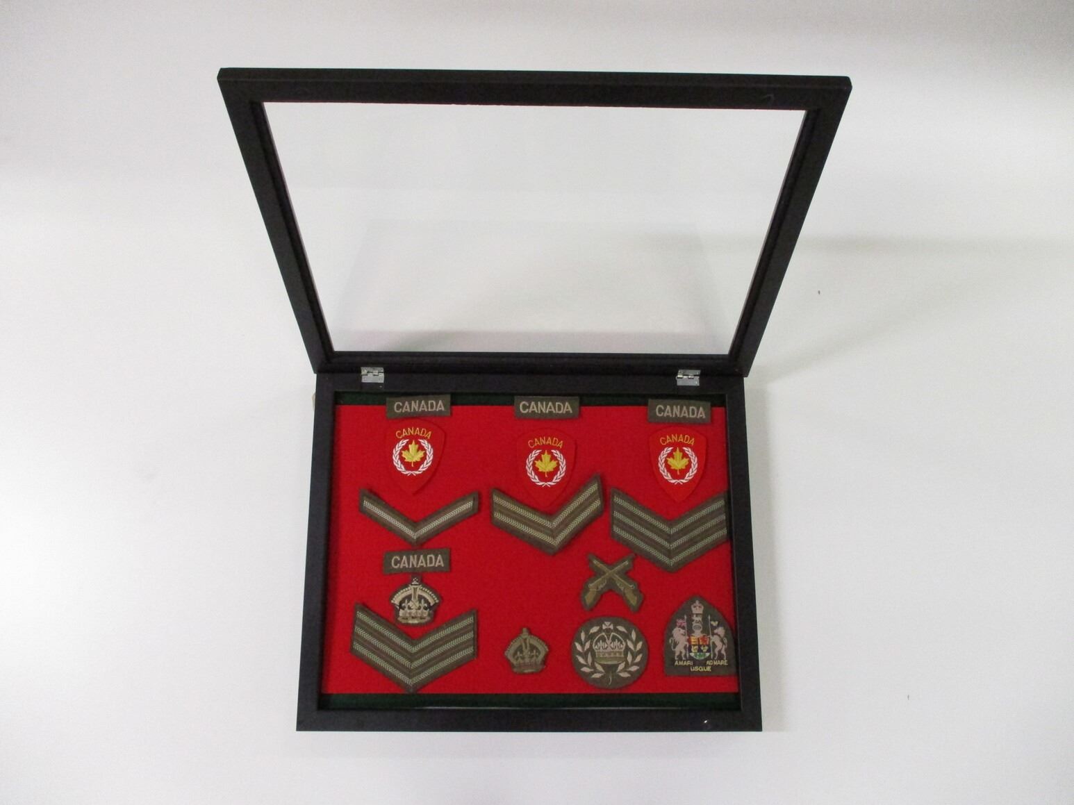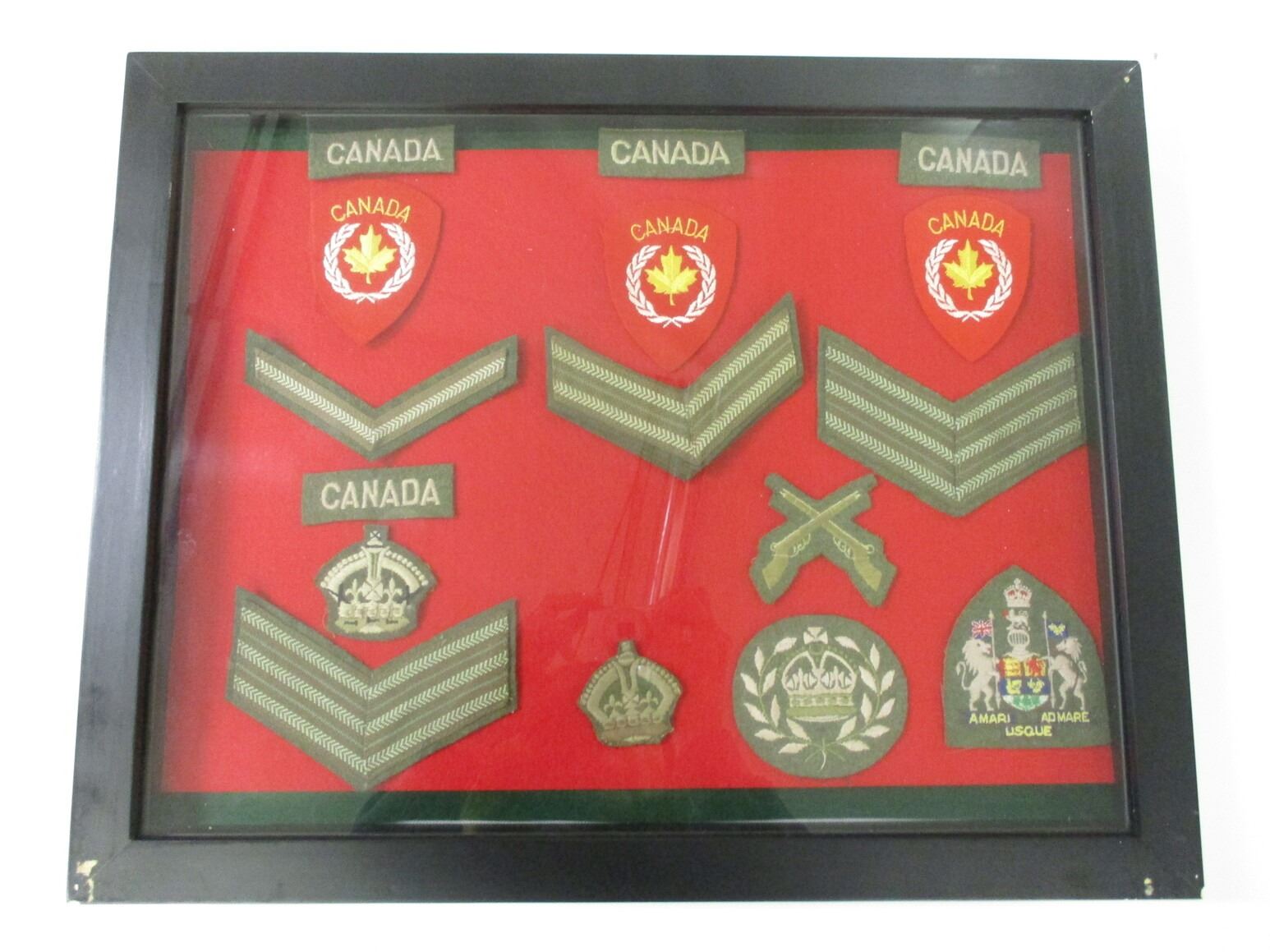 1950'S CANADIAN MILITARY BADGES LOT, (17) BADGES INCLUDING; 25TH DIVISION BADGES, CANADA SHOULDER TILES, PRIVATE, CORPORAL, SERGEANT, WARRANT OFFICER 1ST, 2ND, 3RD CLASS, ETC., CASE IS APPROX. 19.5" X 15.5" X 2". SEE PHOTOS. *NO GUARANTEE ON GLASS FOR SHIPPING*