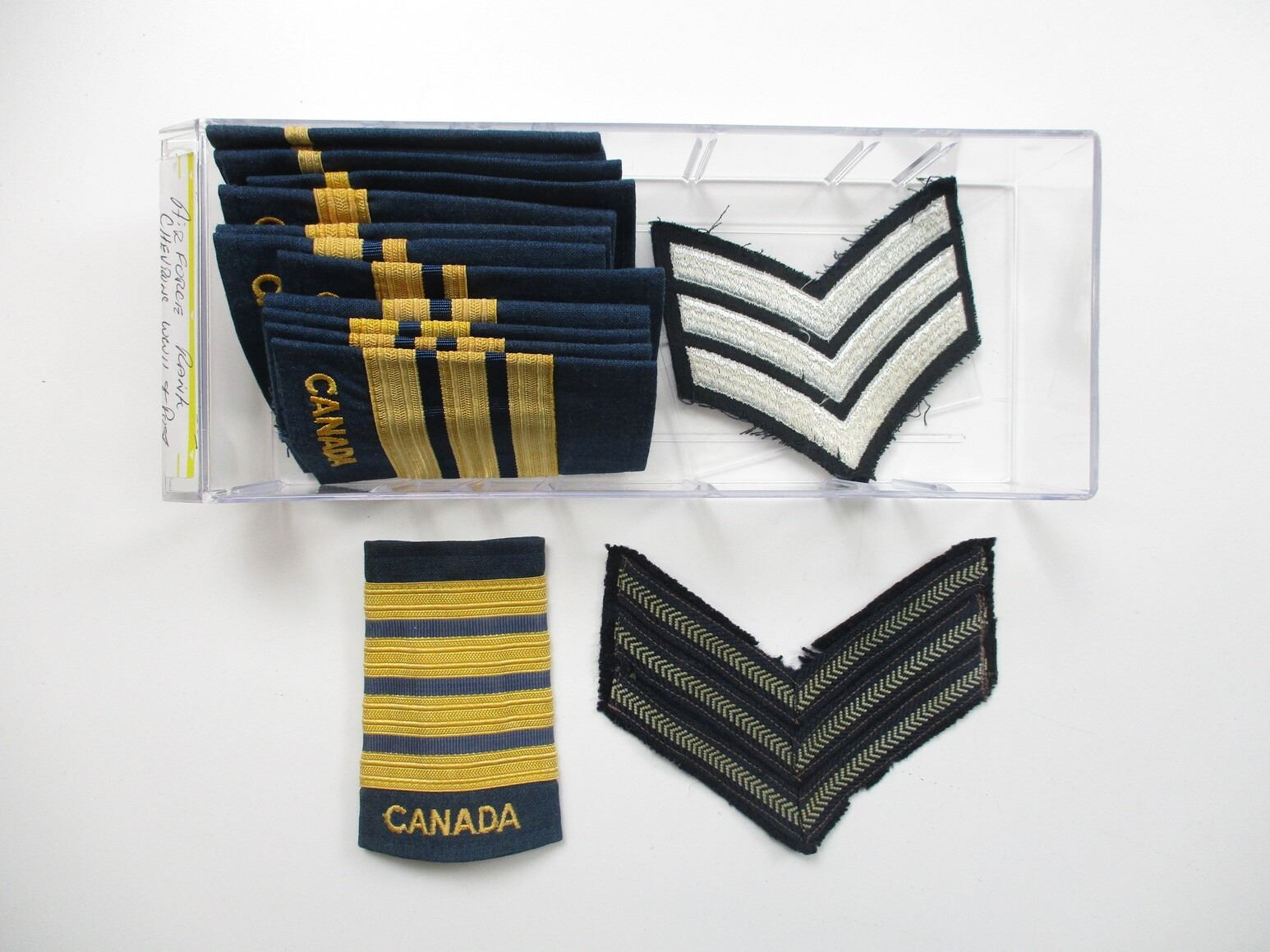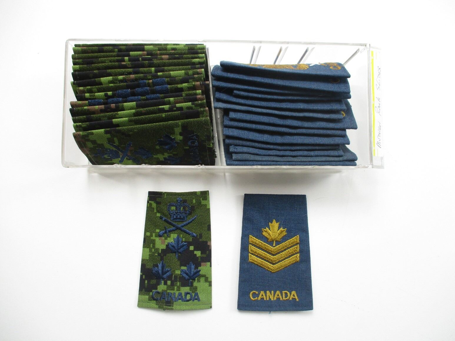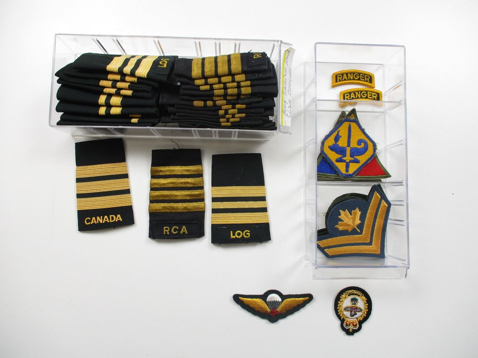 CANADIAN MILITARY BADGES LOT, LOT INCLUDES; (94) BADGES, ETC., RANK, CANADA MARKED. ARMY, AIRFORCE, RCN, DRESS, COMBAT, ETC. MAY CONTAIN SOME FOREIGN BADGES. LOT ALSO INCLUDES JOBMATE UTILITY DRAWER SET OF 8. MEASURES APPROX. 9.75" L X 4.5" W X 20" H.