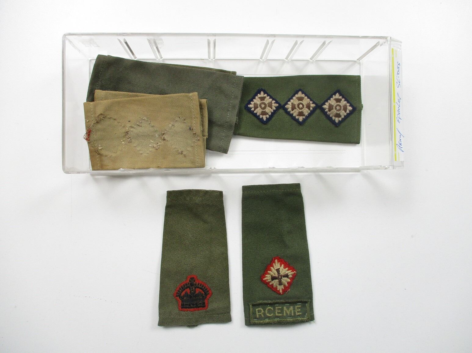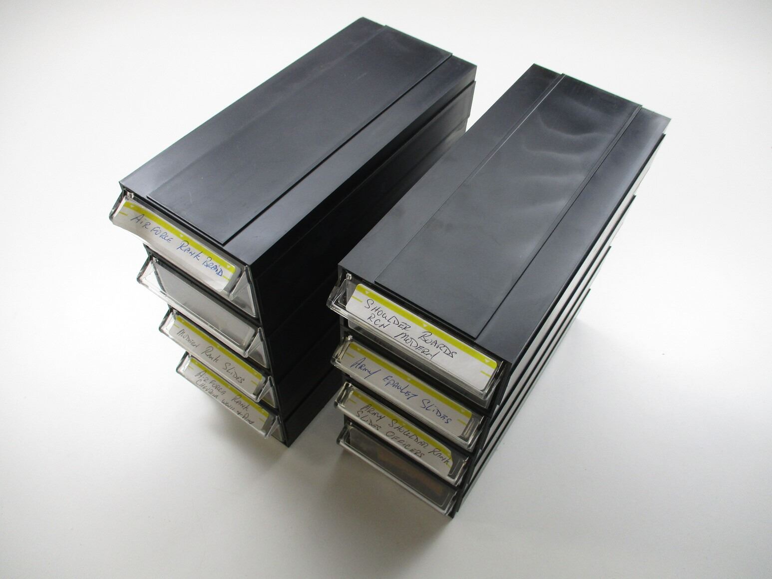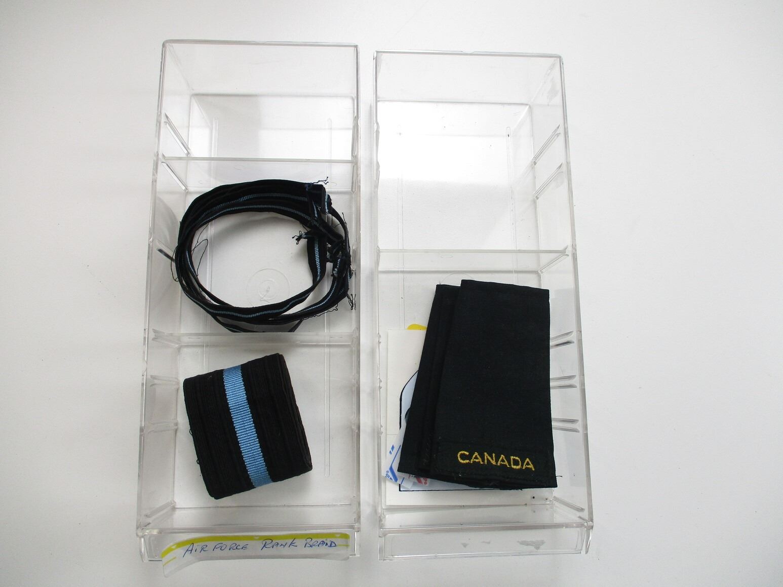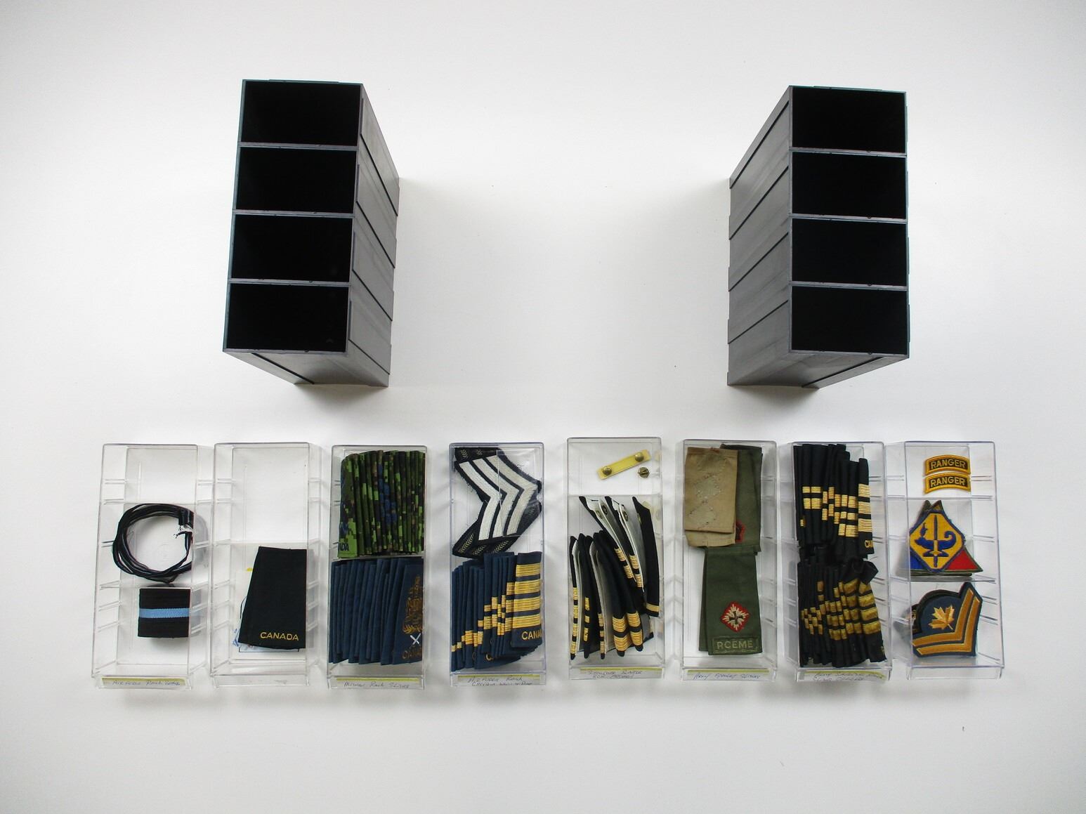 CANADIAN MILITARY BADGES LOT, LOT INCLUDES; (94) BADGES, ETC., RANK, CANADA MARKED. ARMY, AIRFORCE, RCN, DRESS, COMBAT, ETC. MAY CONTAIN SOME FOREIGN BADGES. LOT ALSO INCLUDES JOBMATE UTILITY DRAWER SET OF 8. MEASURES APPROX. 9.75" L X 4.5" W X 20" H.