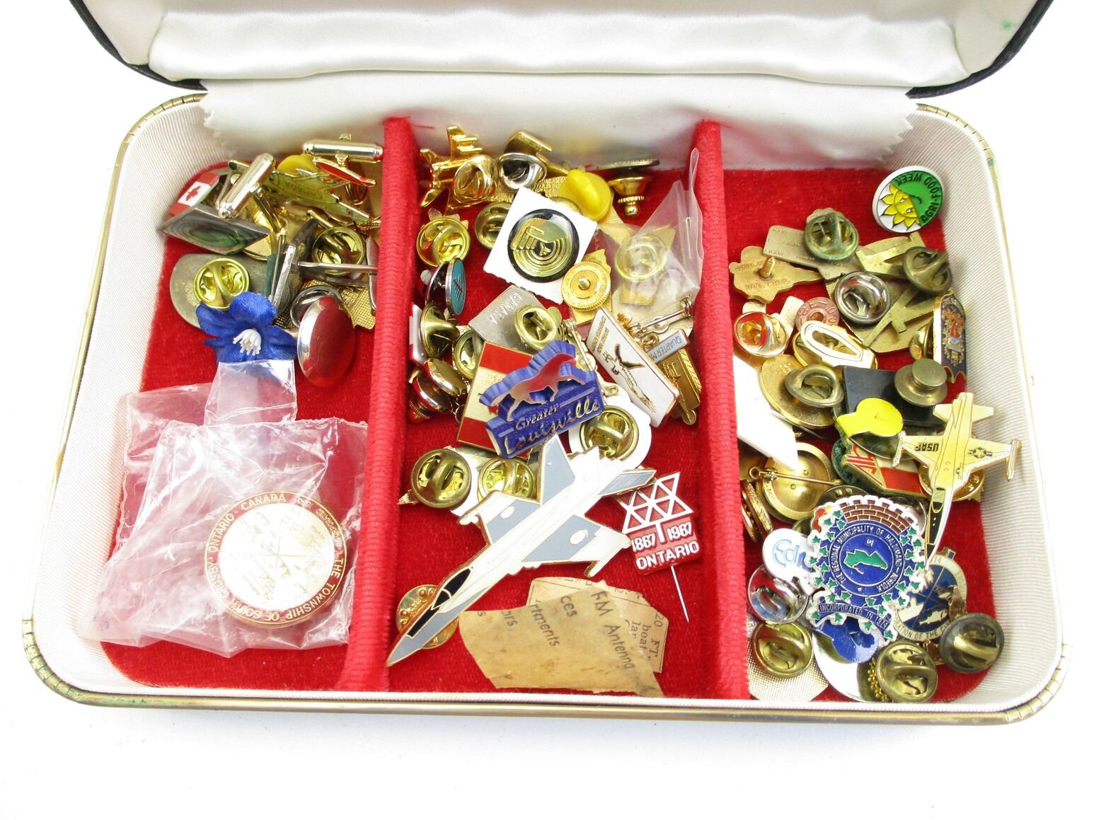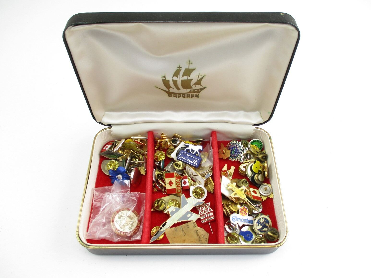 ASSORTED PIN / BADGES, CUFFLINKS LOT, APPROX. (65) INCLUDING; CANADIAN FLAGS, JETS, PROVINCIAL, EUROPEAN, SPORTING EVENTS, CITIES, ETC. LOT INCLUDES BOX MEASURING APPROX. 7" L X 4.74" W X 1.5" DEEP.