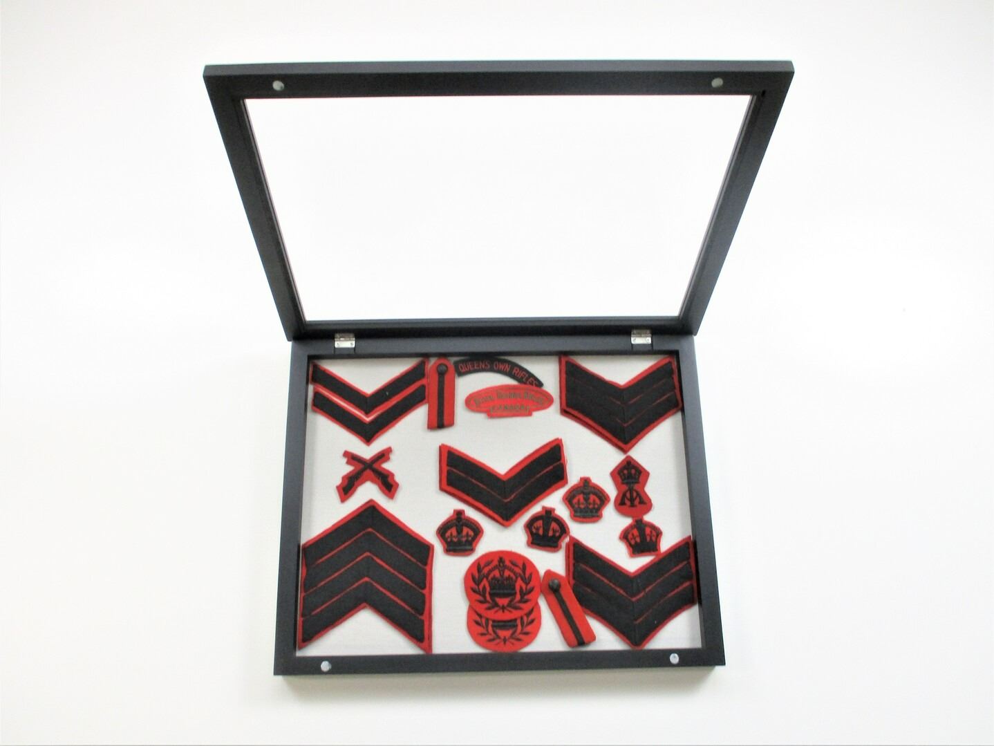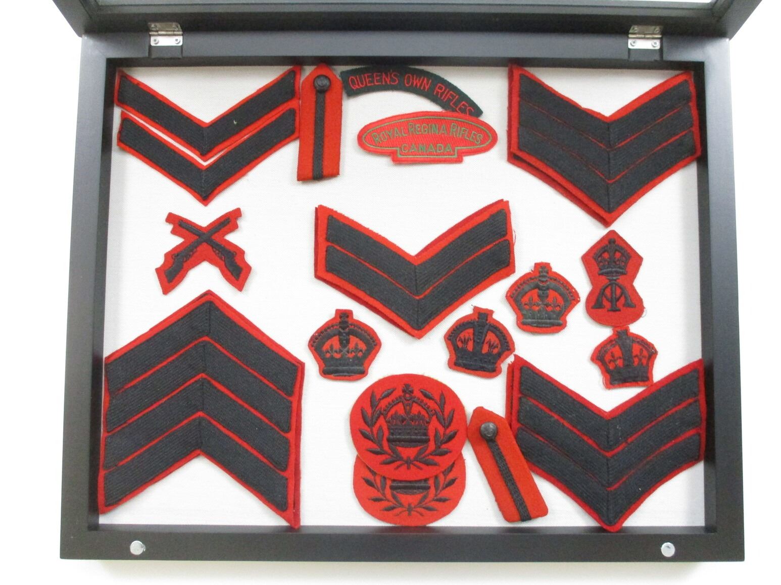 CANADIAN MILITARY BADGE LOT, APPROX. (21) BADGES INCLUDING; QUEEN'S OWN RIFLES & ROYAL REGINA RIFLES, VARIOUS RANK / TRADE /ETC., CORPORAL, SERGEANT, WARRANT OFFICER, OFFICER'S, ETC., CASE IS APPROX. 19.5" X 15.5" X 2". SEE PHOTOS. *NO GUARANTEE ON GLASS FOR SHIPPING*