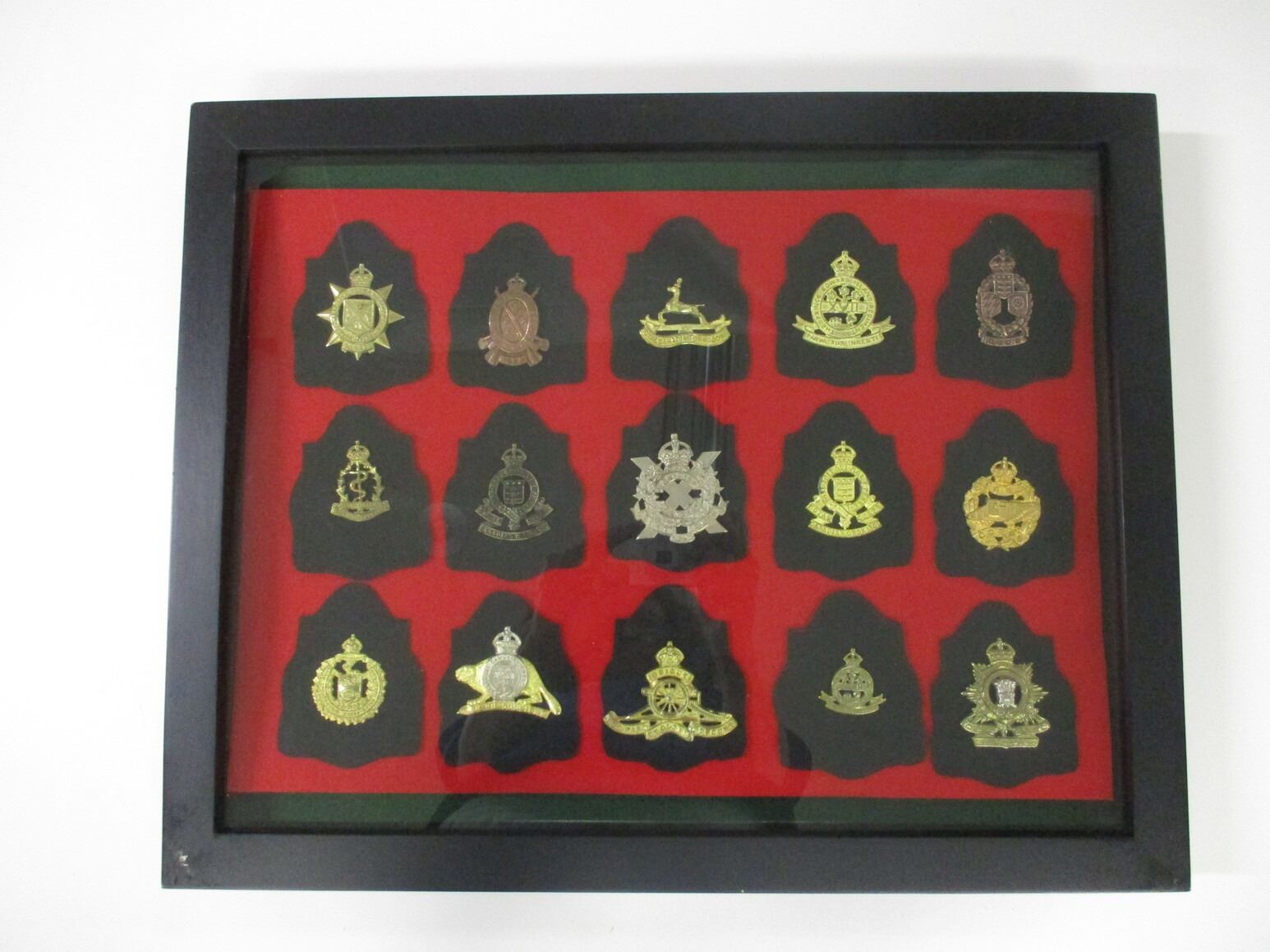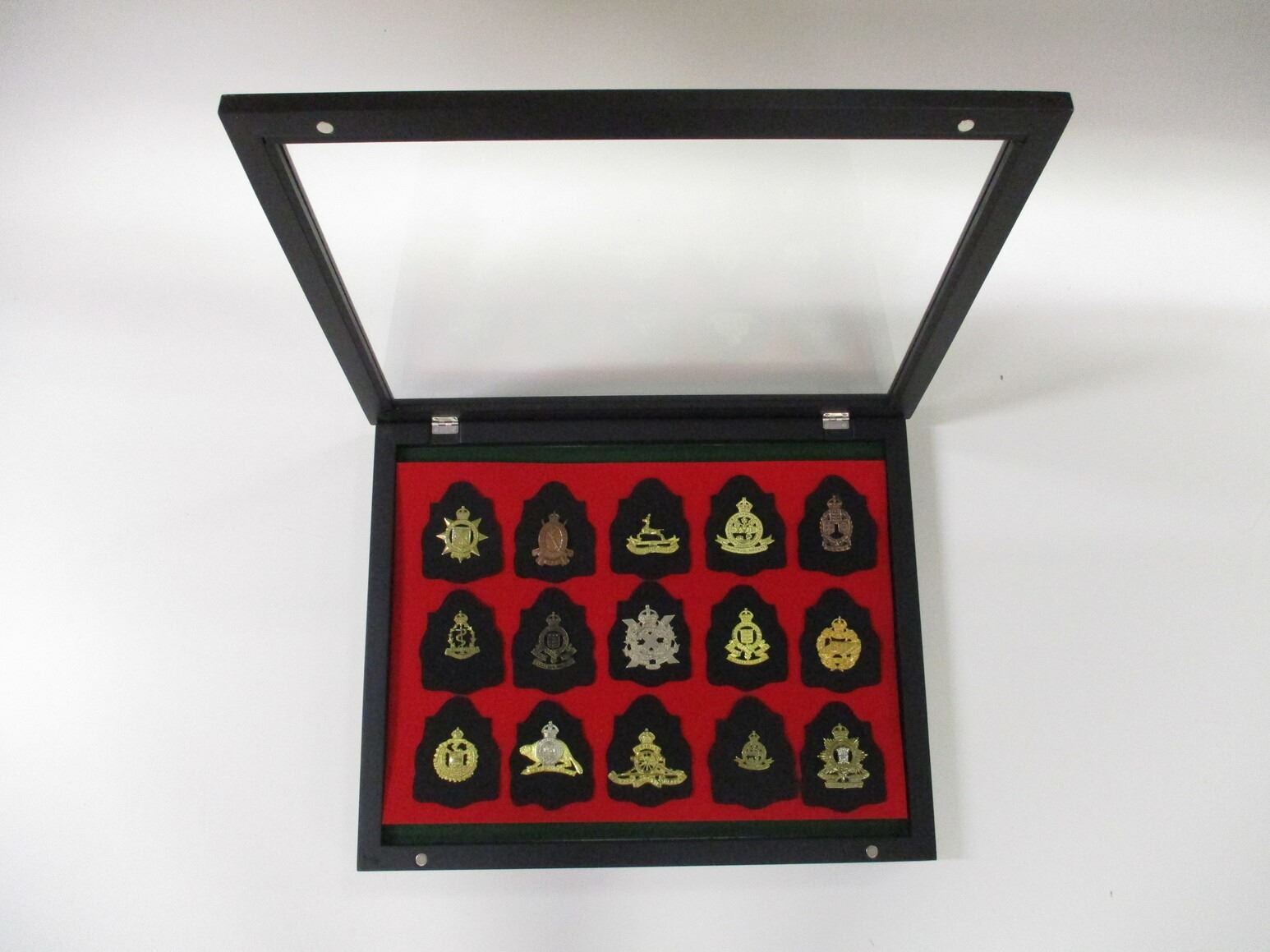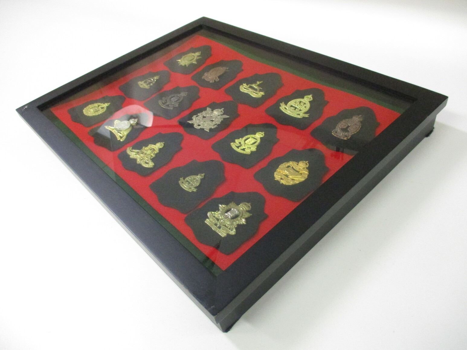 WWII / MODERN CANADIAN MILITARY BADGE LOT, (15) BADGES INCLUDING; WEST NOVA SCOTIA REGIMENT, ROYAL CANADIAN DRAGOONS, PEI REGIMENT, RCAMC, ROYAL CANADIAN ORDNANCE CORP., CANADIAN SCOTTISH, TANK CORPS., ROYALL 22ND, ROYAL CANADIAN ARTILLERY, ROYAL REGIMENT, ETC., CASE IS APPROX. 19.5" X 15.5" X 2". SEE PHOTOS. *NO GUARANTEE ON GLASS FOR SHIPPING*