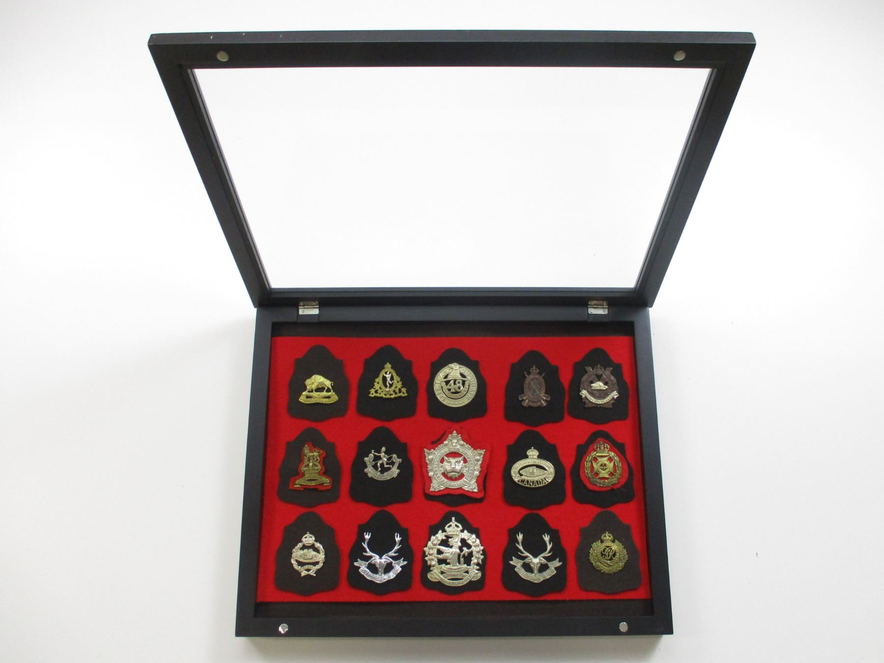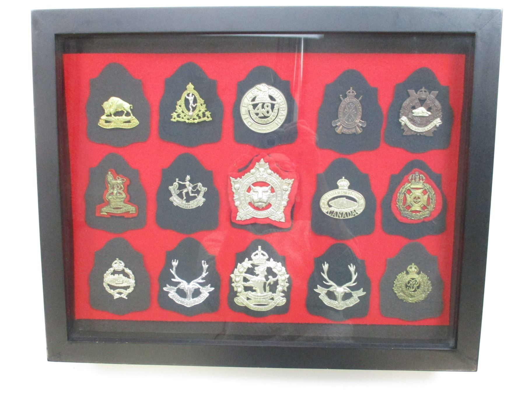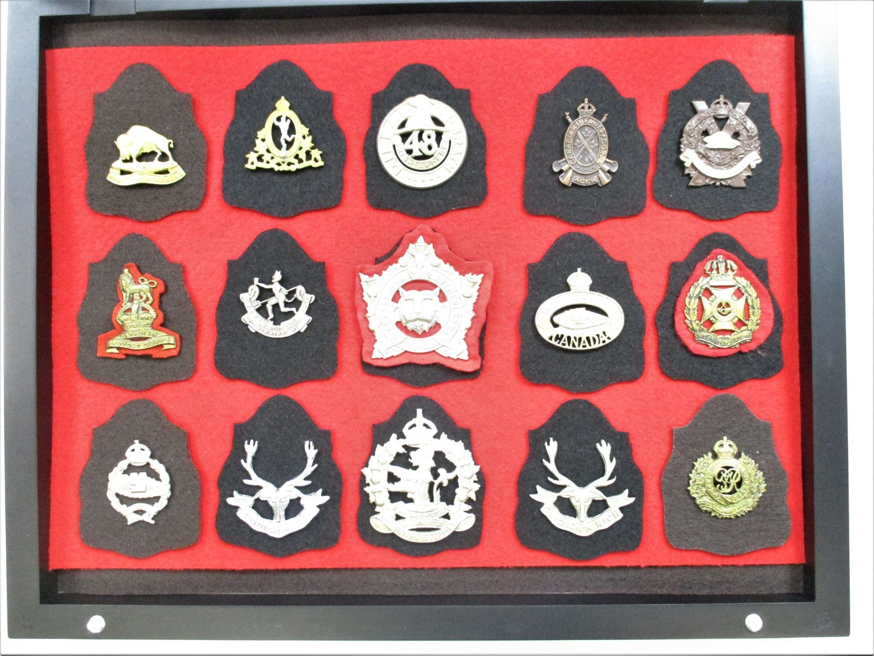 WWII ERA CANADIAN MILITARY BADGE LOT, (15) BADGES INCLUDING; MANITOBA DRAGOONS, RCCS, 48TH HIGHLANDERS, CALGARY HIGHLANDERS, CANADIAN PROVOST CORPS., 90TH WINNIPEG RIFLES, ESSEX TANK, PEEL DUFFERIN HALTON REGIMENT, ETC., CASE IS APPROX. 19.5" X 15.5" X 2". SEE PHOTOS. *NO GUARANTEE ON GLASS FOR SHIPPING*