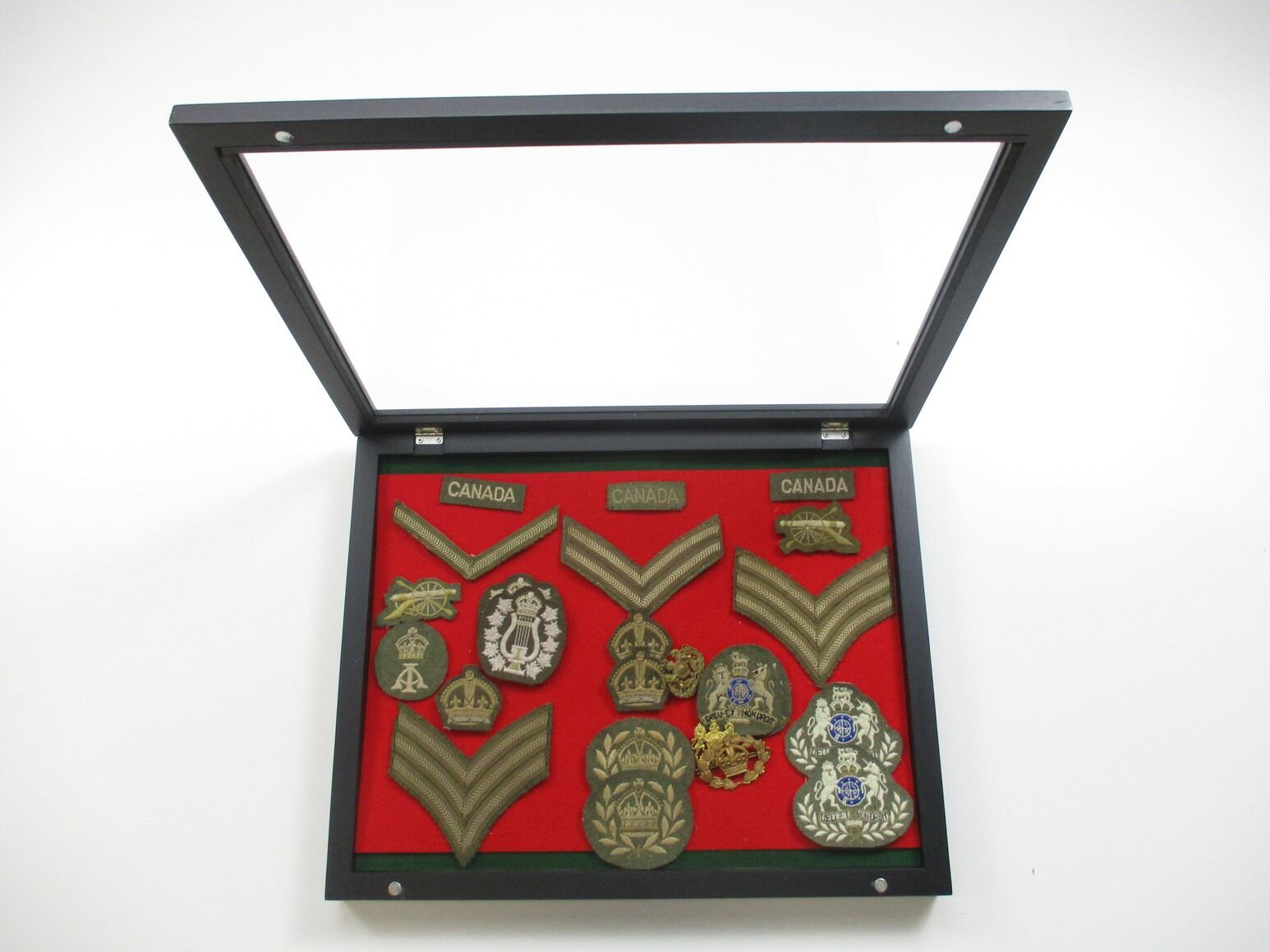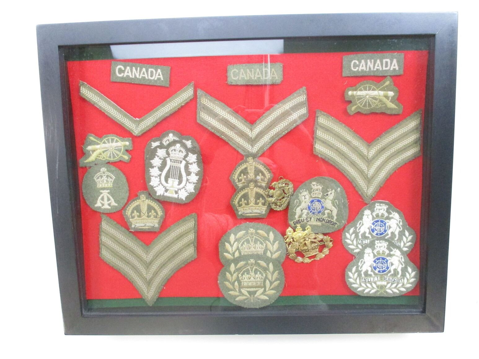 WWII ERA CANADIAN MILITARY BADGE LOT, (26) BADGES INCLUDING; LANCE CORPORAL, CORPORAL, WARRANT OFFICER, RSM RANKS, ARTILLERY, BAND, CROWNS, ETC., CASE IS APPROX. 19.5" X 15.5" X 2". SEE PHOTOS. *NO GUARANTEE ON GLASS FOR SHIPPING*