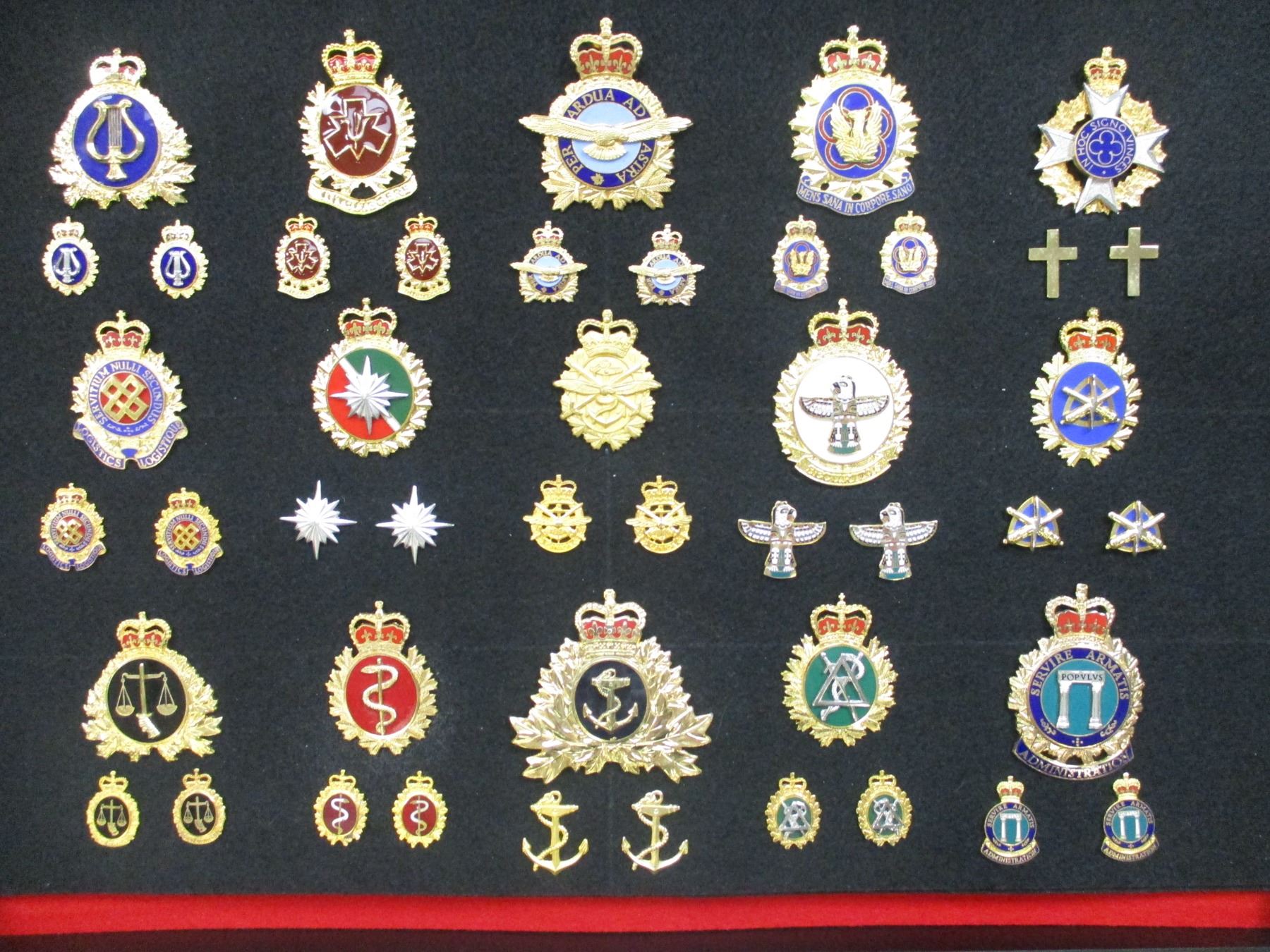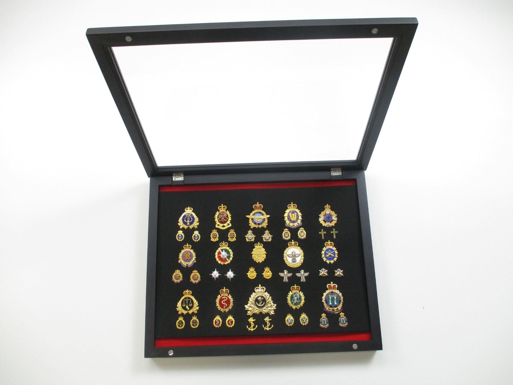 CANADIAN MILITARY BADGE LOT, (45) BADGES INCLUDING; CAP & COLLAR DOGS, BAND, MEDICAL, PADRE, SUPPLY, INTELLIGENCE, MP, EME, NAVY, ADMIN, ETC., CASE IS APPROX. 19.5" X 15.5" X 2". SEE PHOTOS. *NO GUARANTEE ON GLASS FOR SHIPPING*