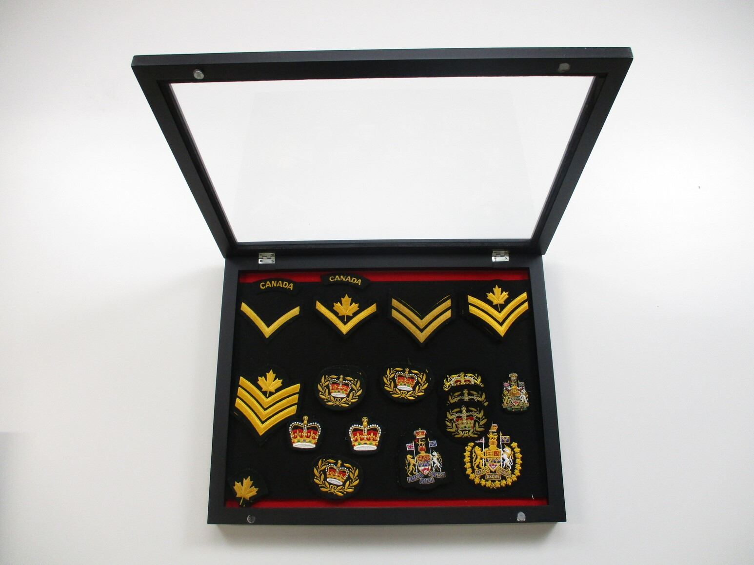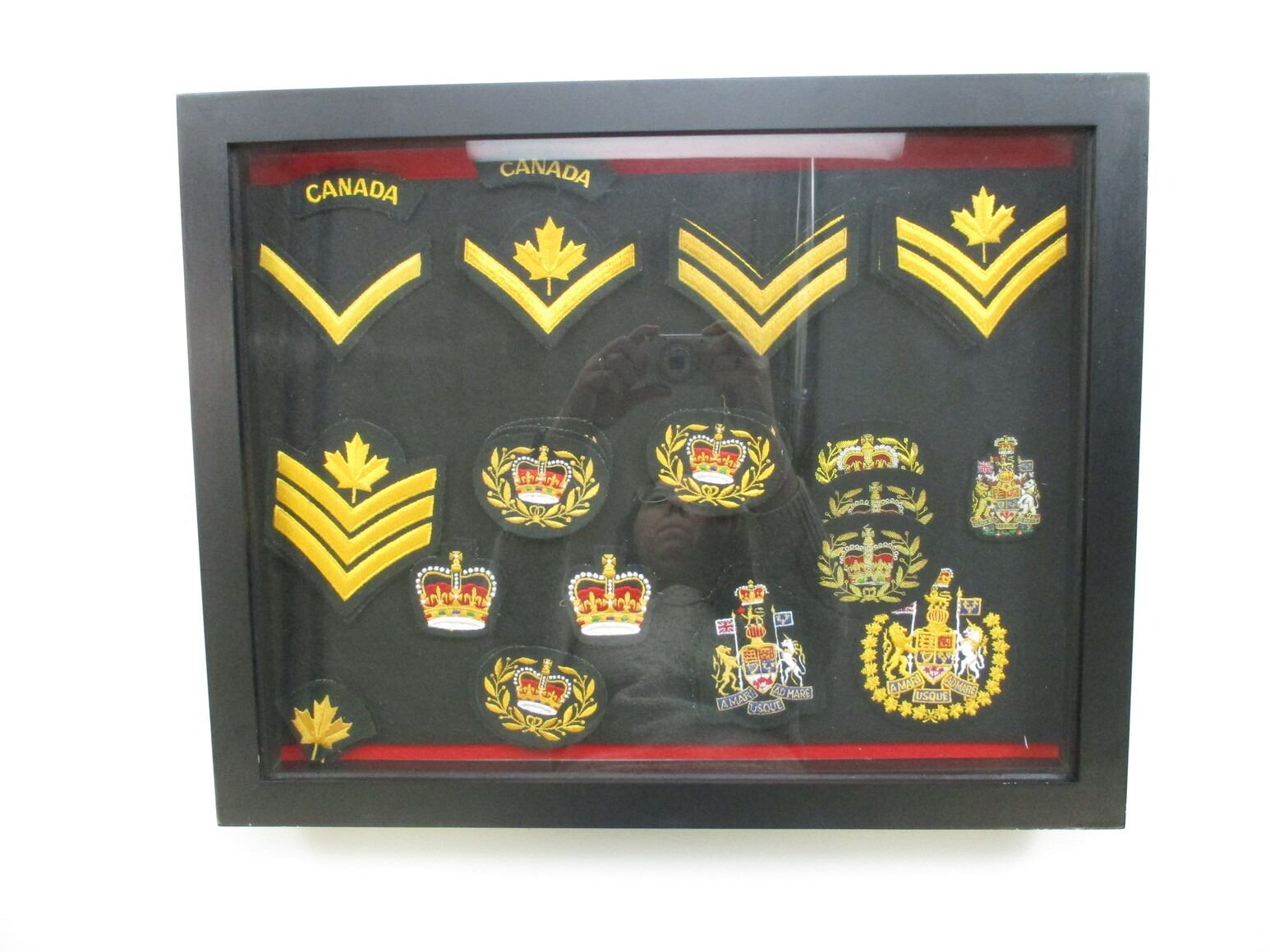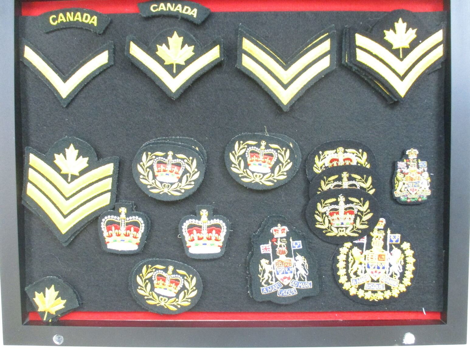 CANADIAN NAVY BADGE LOT, (32) BADGES INCLUDING; SAILOR 2ND CLASS, SAILOR 1ST CLASS, MASTER SAILOR, PETTY OFFICER 2ND, PETTY OFFICER, CHIEF PETTY OFFICER, CANADA TITLES, ETC., CASE IS APPROX. 19.5" X 15.5" X 2". SEE PHOTOS. *NO GUARANTEE ON GLASS FOR SHIPPING*