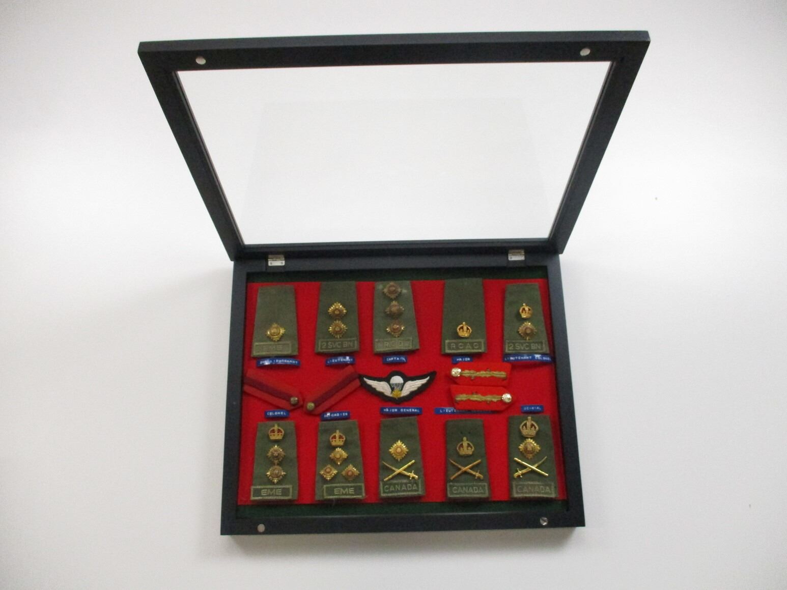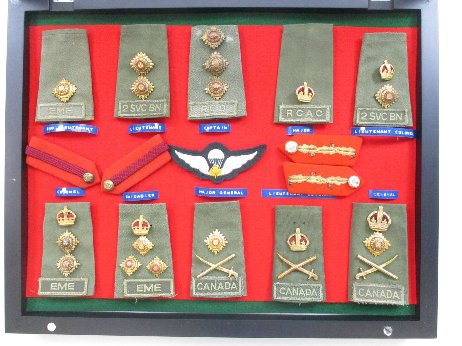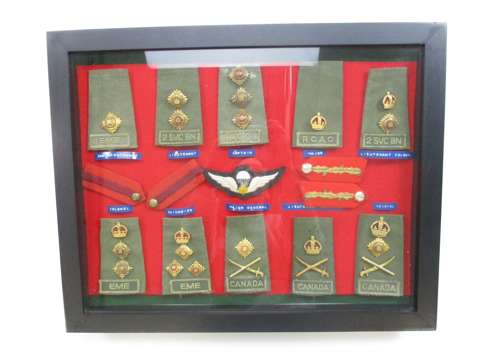 CANADIAN MILITARY BADGE LOT, (15) BADGES INCLUDING COMBAT EPAULETS WITH EME, RCD, 2 SVC BN, RCAC ON THEM, RANK PIPS SHOWING 2ND LIEUTENANT TO GENERAL, JUMPWINGS, ETC., CASE IS APPROX. 19.5" X 15.5" X 2". SEE PHOTOS. *NO GUARANTEE ON GLASS FOR SHIPPING*