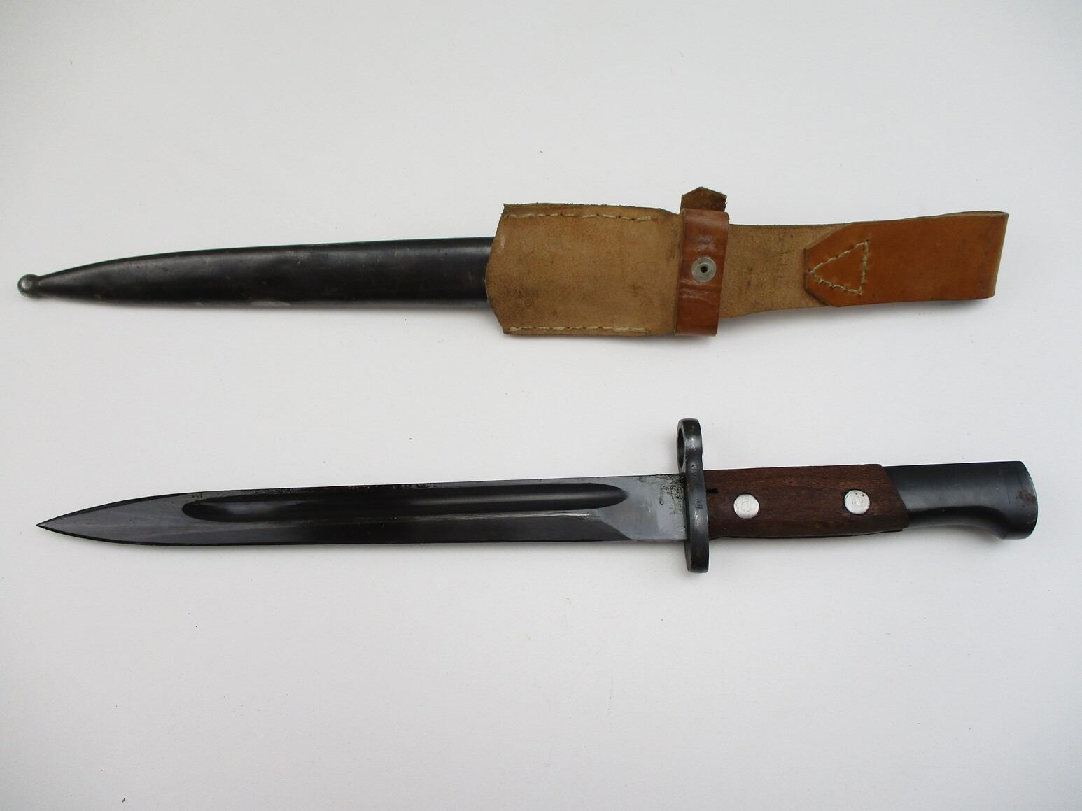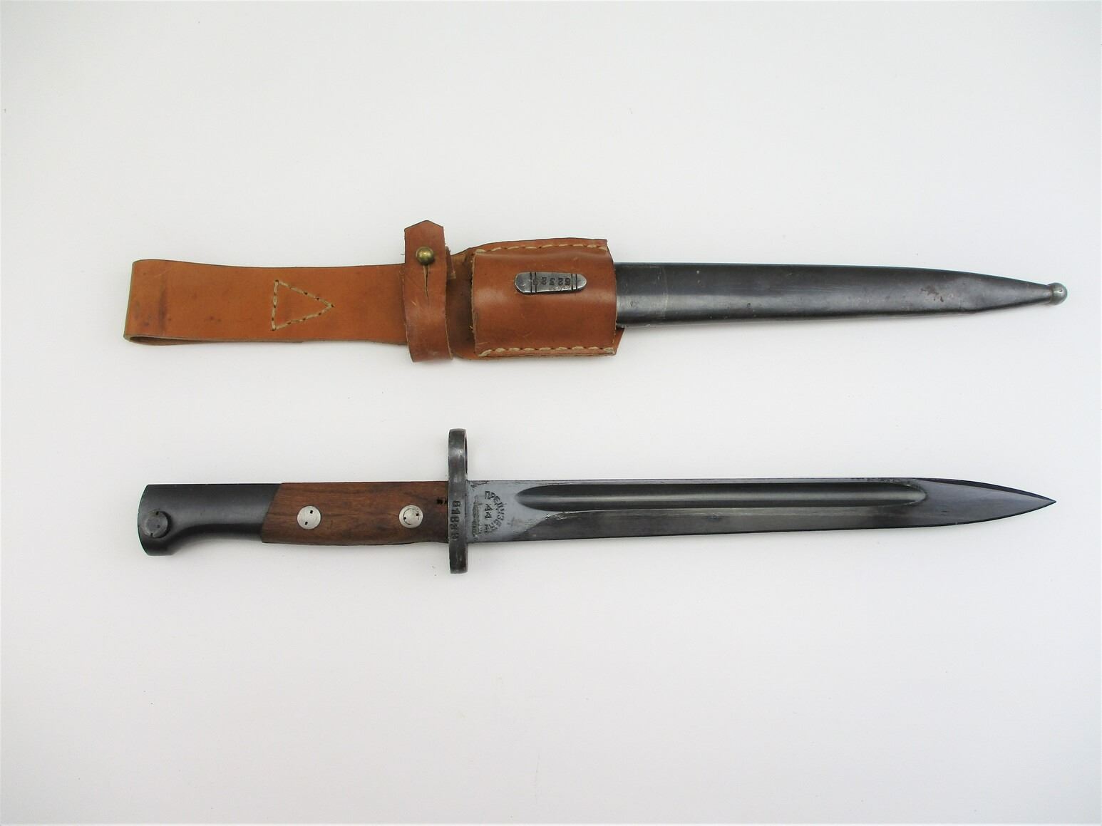 YUGOSLAVIAN M48 MAUSER BAYONET, (1) FITS GERMAN 8MM MAUSER KAR 98K RIFLES, RICASSO MARKED: "FACTORY 44", CROSS-PIECE MARKED: "61839", 2-PIECE WOOD GRIP, METAL POMMEL, NO VISIBLE MARKINGS, METAL SCABBARD MARKED: "62329", BROWN LEATHER FROG, NO VISIBLE MARKINGS, BLADE APPROX. 10" & OAL APPROX. 15".
