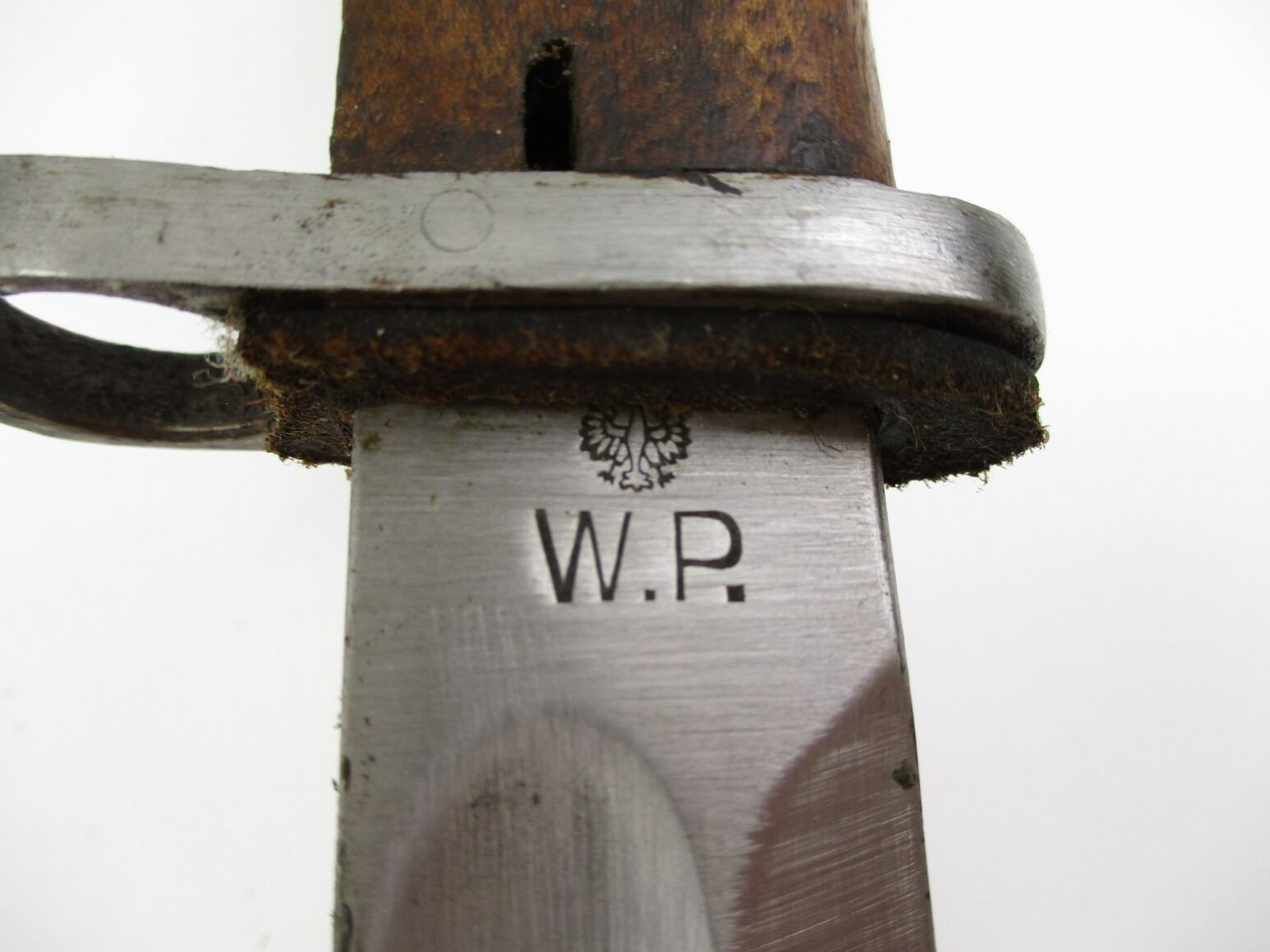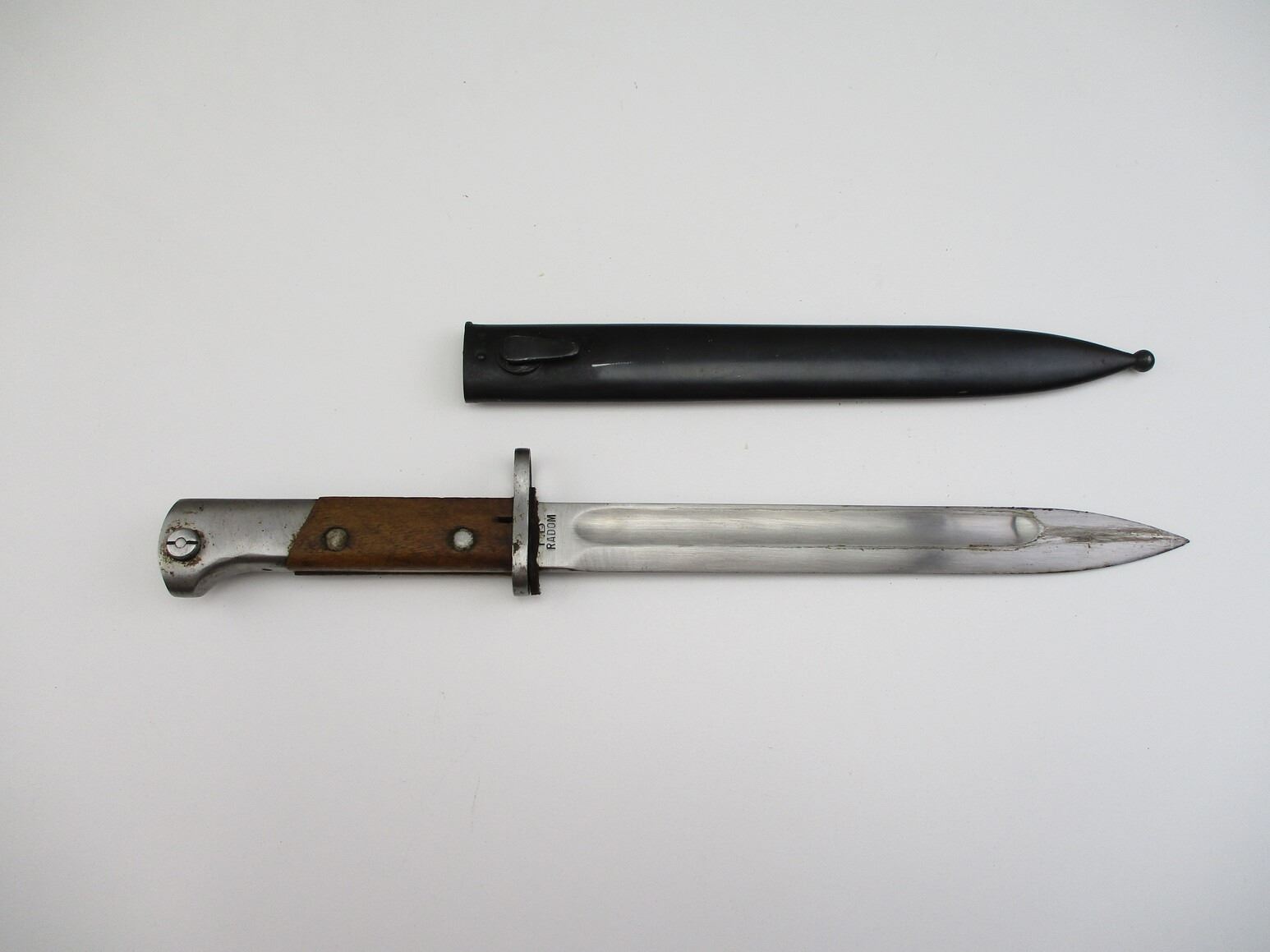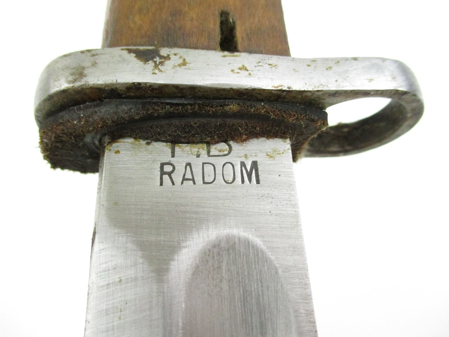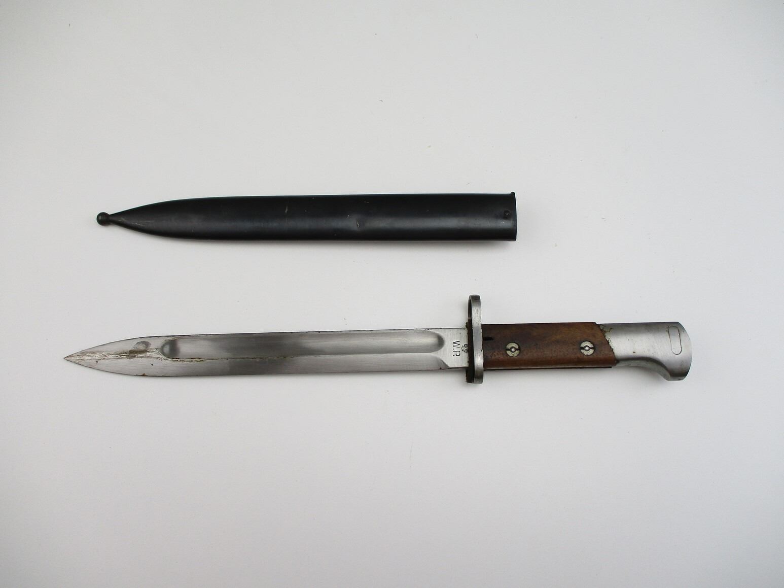 RARE PRE-WWII POLISH M1930 BAYONET, (1) FITS 8MM MAUSER RIFLES, RICASSO MARKED: "FB (FABRYKA BRONI / WEAPONS FACTORY) RADOM", OTHER-SIDE MARKED: "W.P. (WOJSKO POLSKIE / POLISH ARMY)", 2-PIECE WOOD GRIP, METAL POMMEL, NO VISIBLE MARKINGS, METAL SCABBARD WITH MAKER'S MARK, BLADE APPROX. 10" & OAL APPROX. 15 1/8".