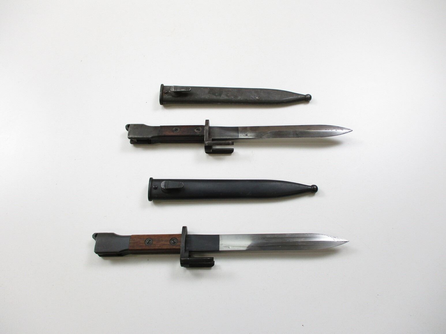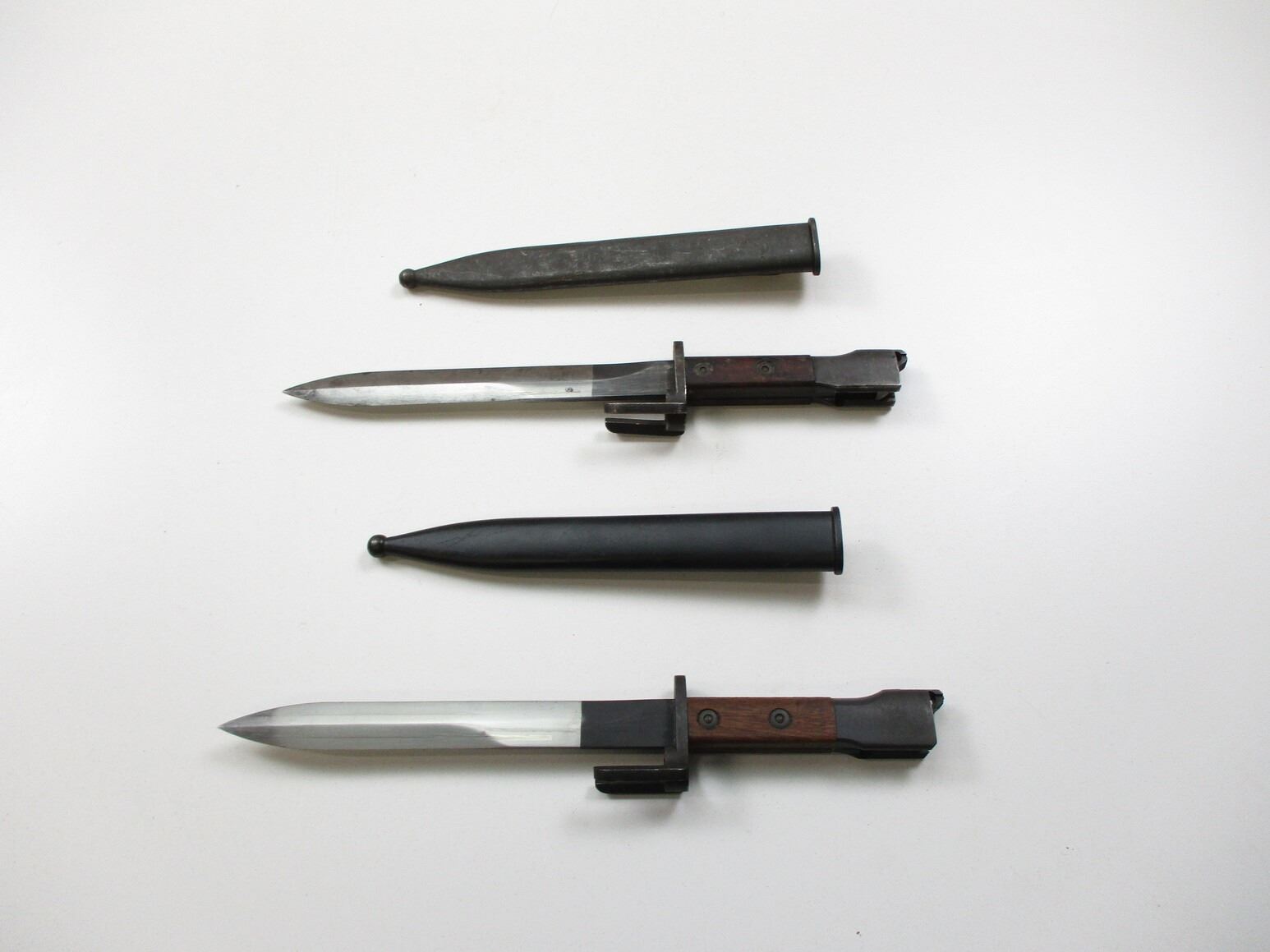 BELGIAN FN FAL TYPE A BAYONET LOT, (2) FITS 7.62 NATO FN FAL RIFLES, SILVER DOUBLE-EDGED BLADES, INTEGRATED FLASH HIDER PRONGS, NO VISIBLE MARKINGS, 2-PIECE WOOD GRIP, METAL POMMEL, NO VISIBLE MARKINGS, STEEL SCABBARDS, NO VISIBLE MARKINGS, BLADE APPROX. 8" & OAL APPROX. 12 3/8".