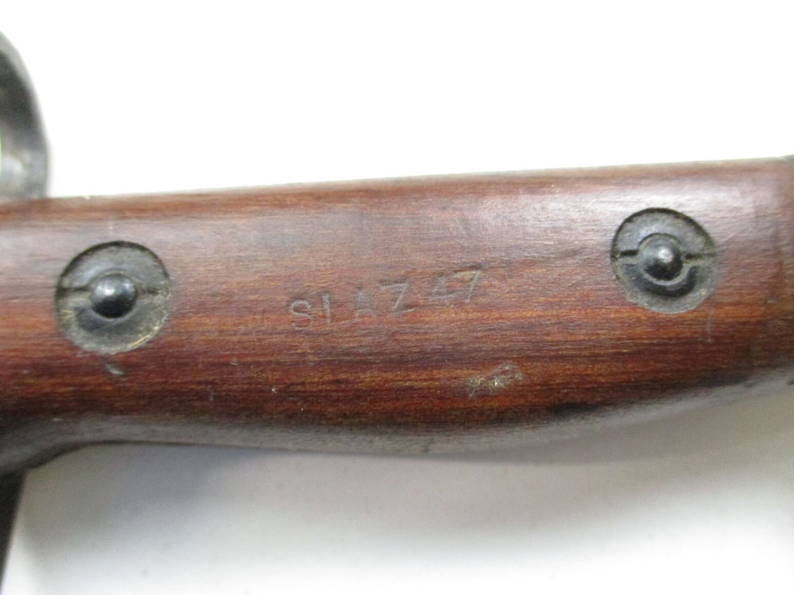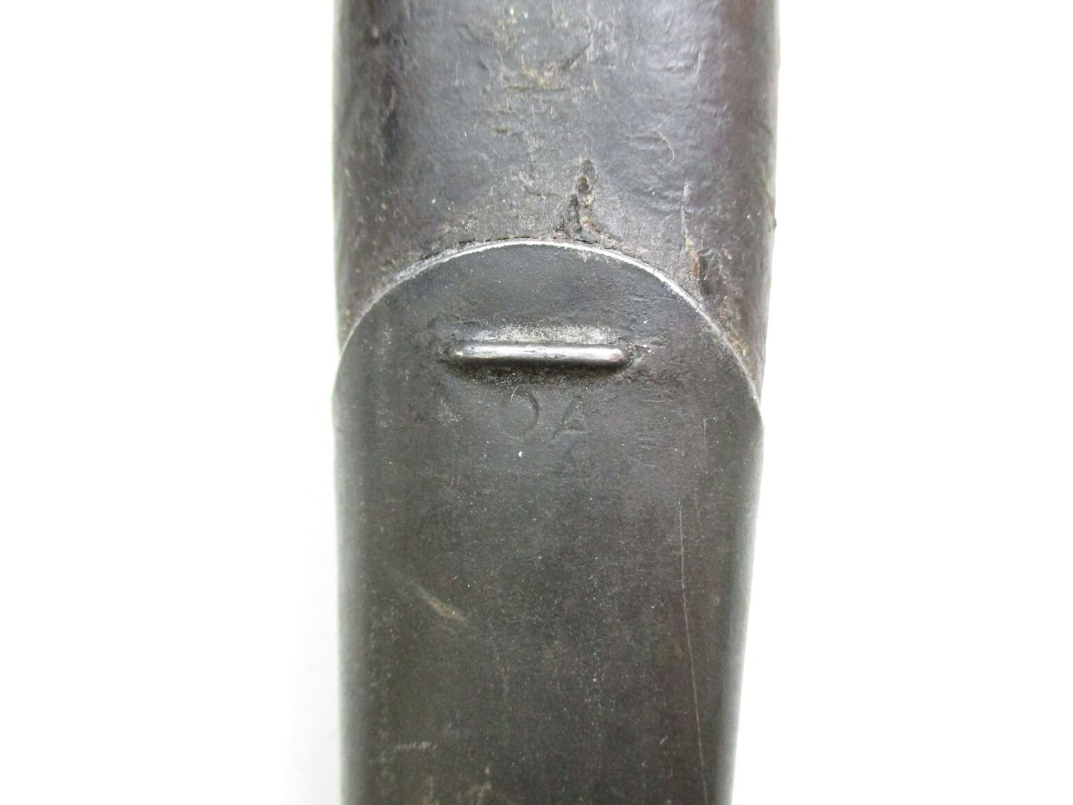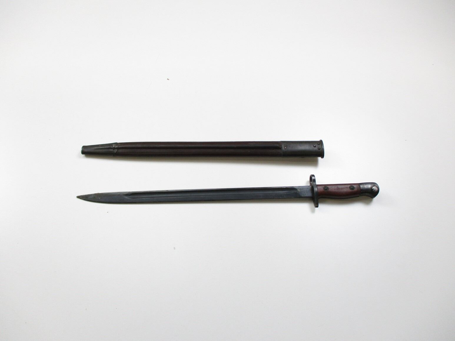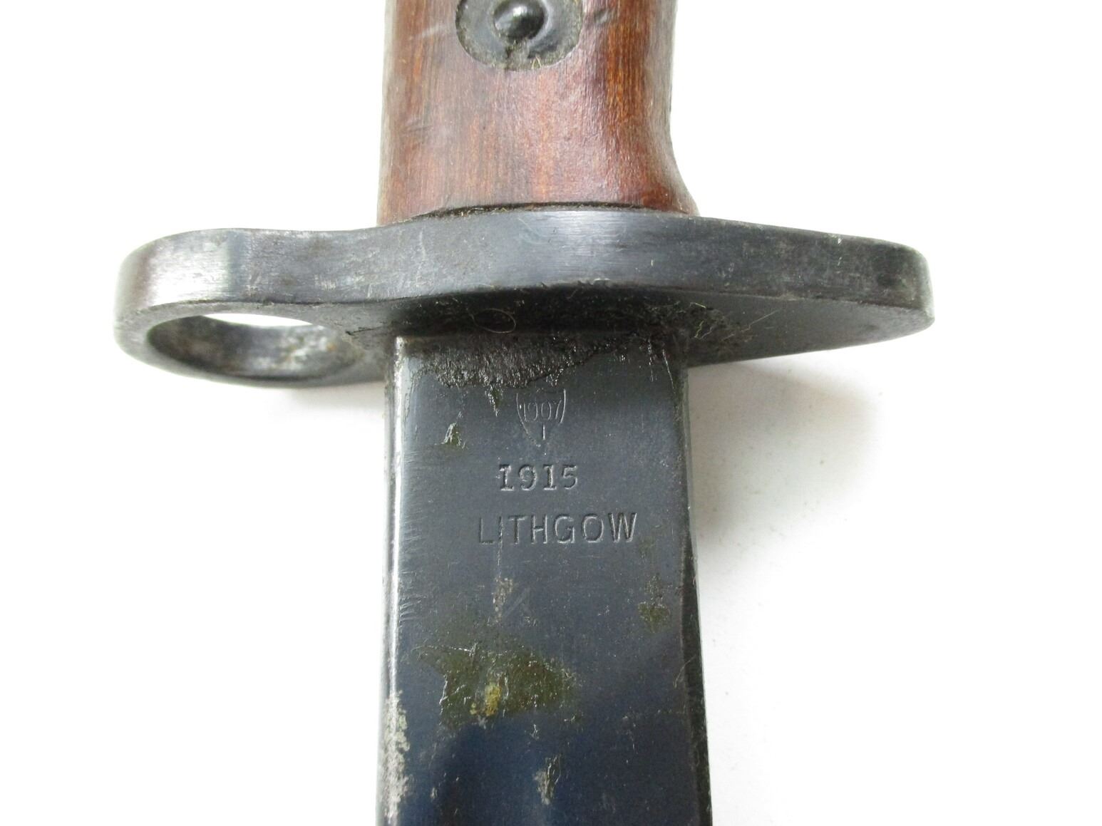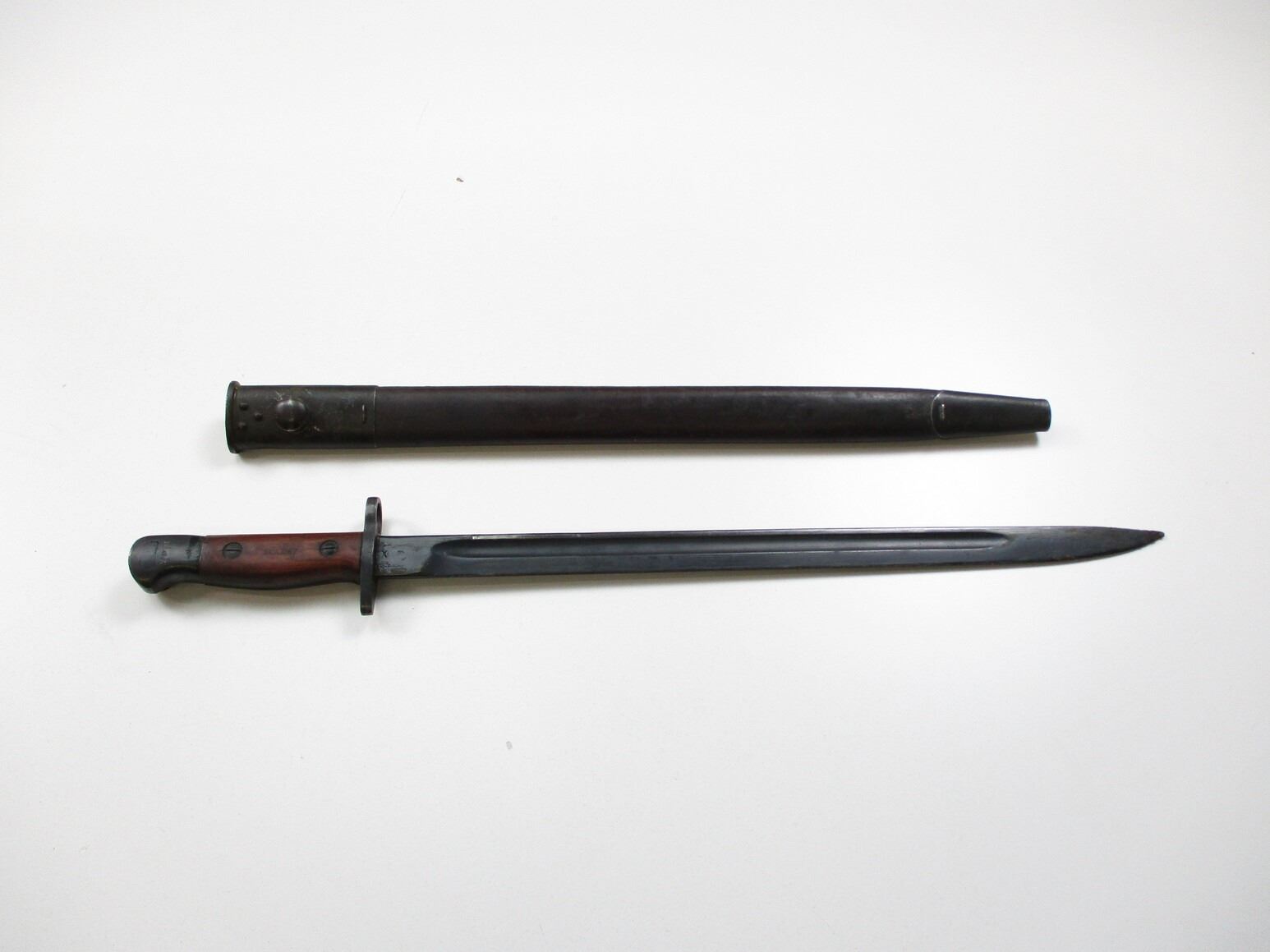 AUSTRALIAN 1907 PATTERN BAYONET, (1) FITS .303 CALIBER SHORT MAGAZINE LEE-ENFIELD NO. I MK.III (SMLE) RIFLE, RICASSO MARKED: "1907", "1915" OVER "LITHGOW", OPPOSITE SIDE MARKED: "X (BEND TEST)" & OTHER PROOF MARKS, CROSS-PIECE MARKED: "3MD 7301", 2-PIECE WOOD GRIP MARKED: "SLAZ47", METAL POMMEL MARKED: "31026", "10/47/R" & BROAD ARROW, LEATHER & METAL SCABBARD MARKED: "OA" & CROWN OVER "20" OVER "E", BLADE APPROX. 17" & OAL APPROX. 21 5/8".