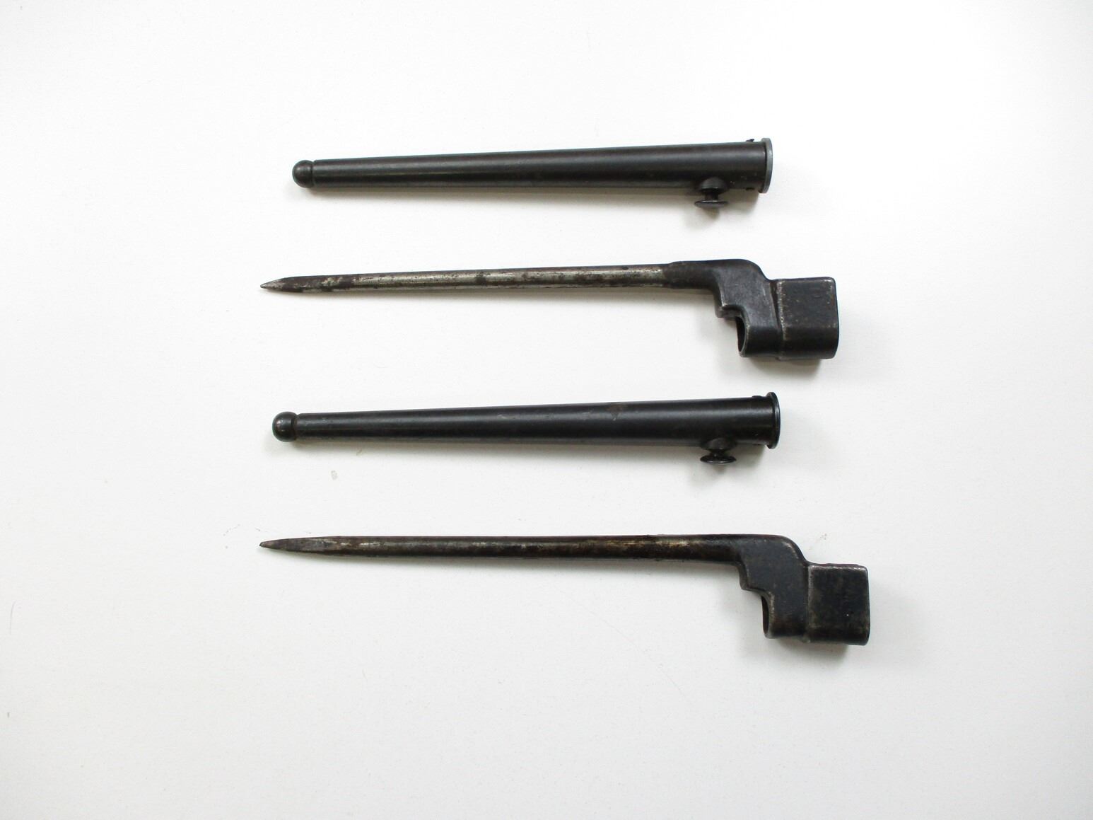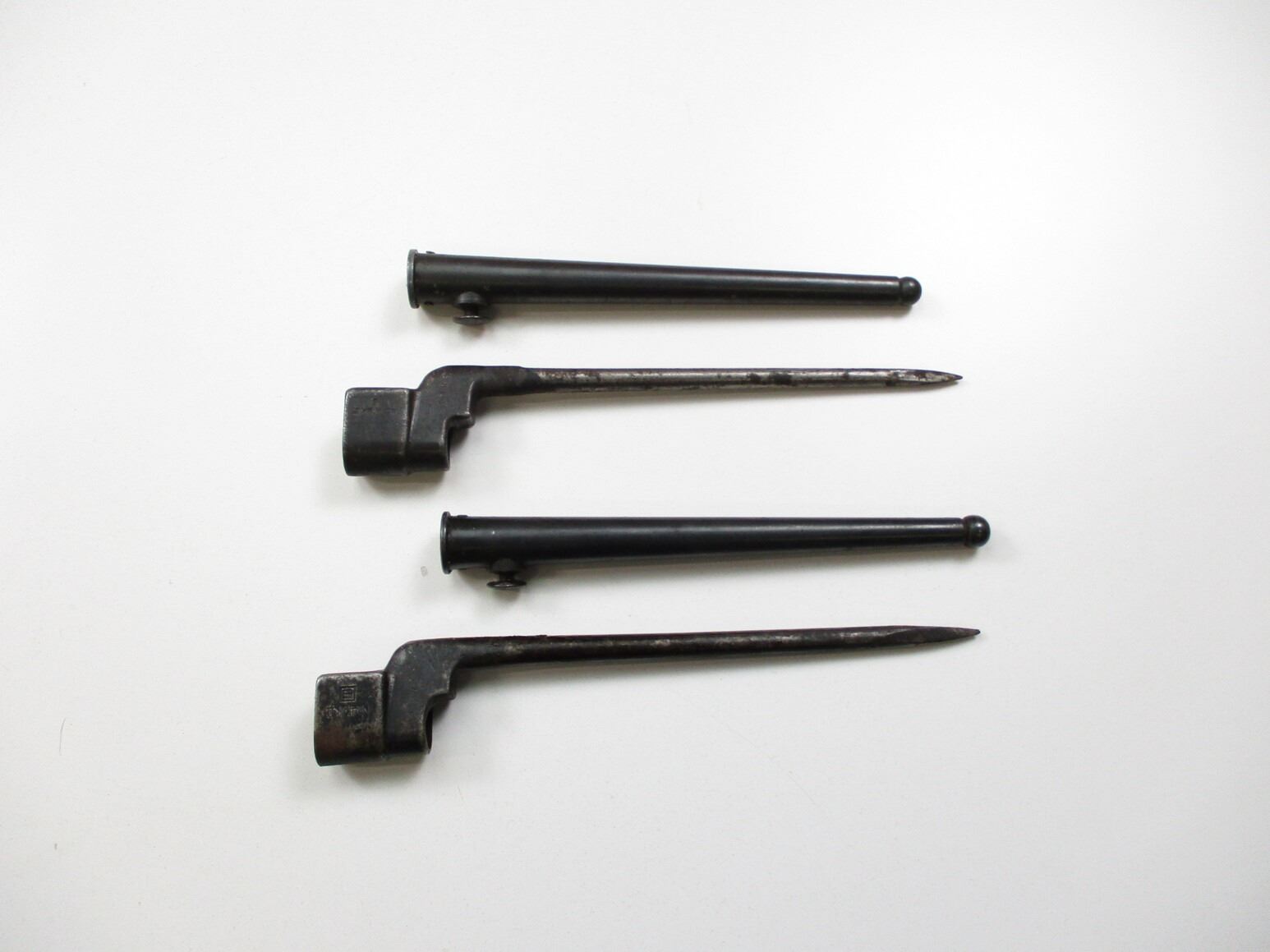 LEE ENFIELD NO.4 MKII SOCKET BAYONET LOT, (2) FITS LEE ENFIELD NO.4 MKII RIFLES, INCLUDES; (1) SOCKET MARKED: "NO4 MKII" & "S" IN A SQUARE (SAVAGE), METAL SCABBARD MARKED: "NO4 MKI" & (1) SOCKET MARKED: "NO4 MKII", "S" & "3403", METAL SCABBARD, NO VISIBLE MARKINGS. EACH BLADE APPROX. 8" & OAL APPROX. 9 7/8".