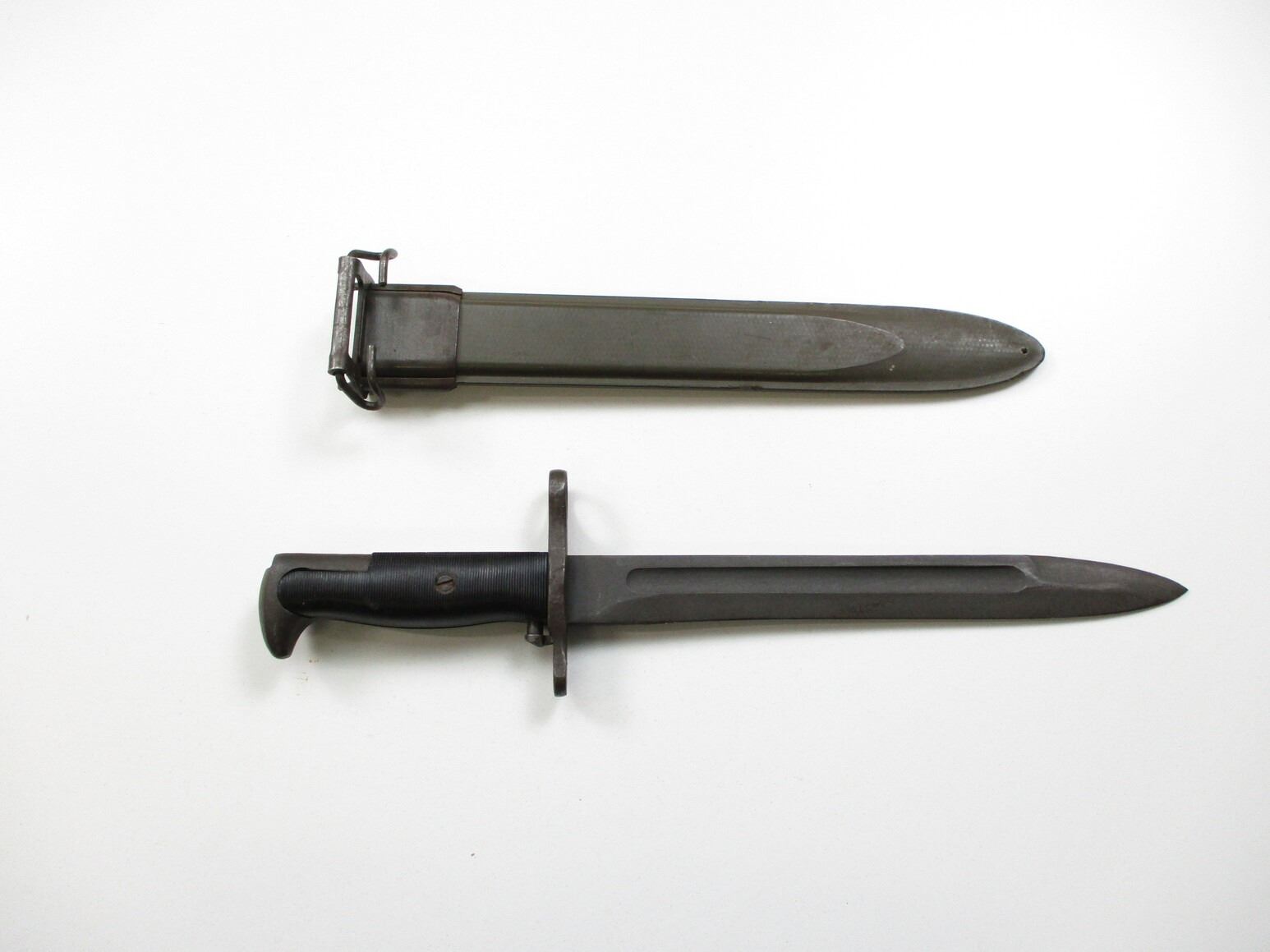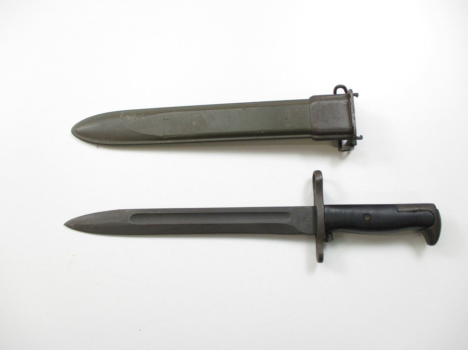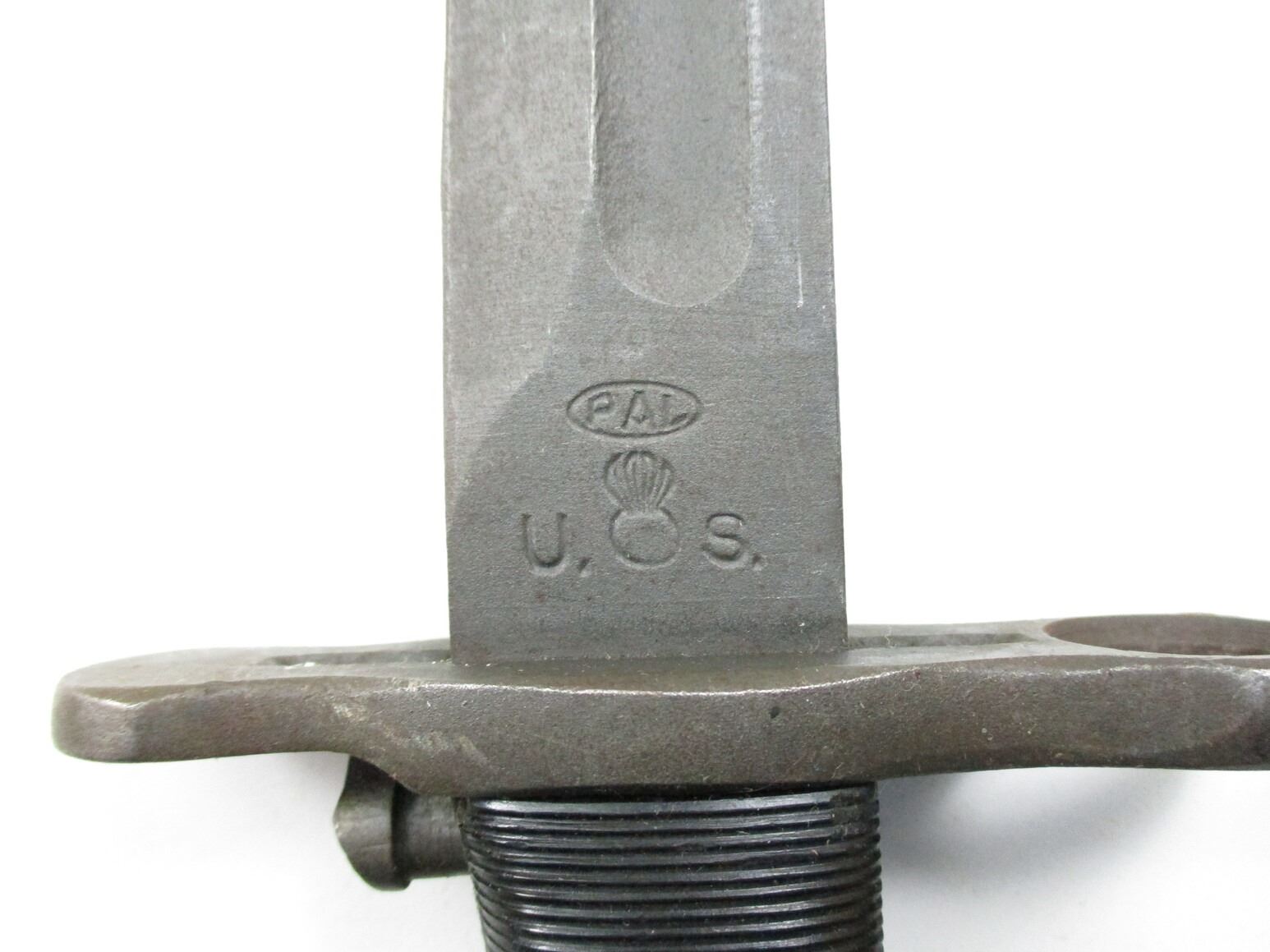 WWI U.S. M1 GARAND BAYONET, (1) FITS .30-06 M1 & 1903 SPRINGFIELD RIFLES, RICASSO MARKED: "PAL" IN A CIRCLE & "U" ORDNANCE BOMB "S", BLACK POLYMER GRIP, METAL IN-BETWEEN GRIP MARKED: "H", METAL POMMEL, FIBERGLASS SCABBARD WITH METAL BELT HOOKS, MARKED: "US" INSIDE ORDNANCE BOMB, BLADE APPROX. 9 7/8 " & OAL APPROX. 14.25".