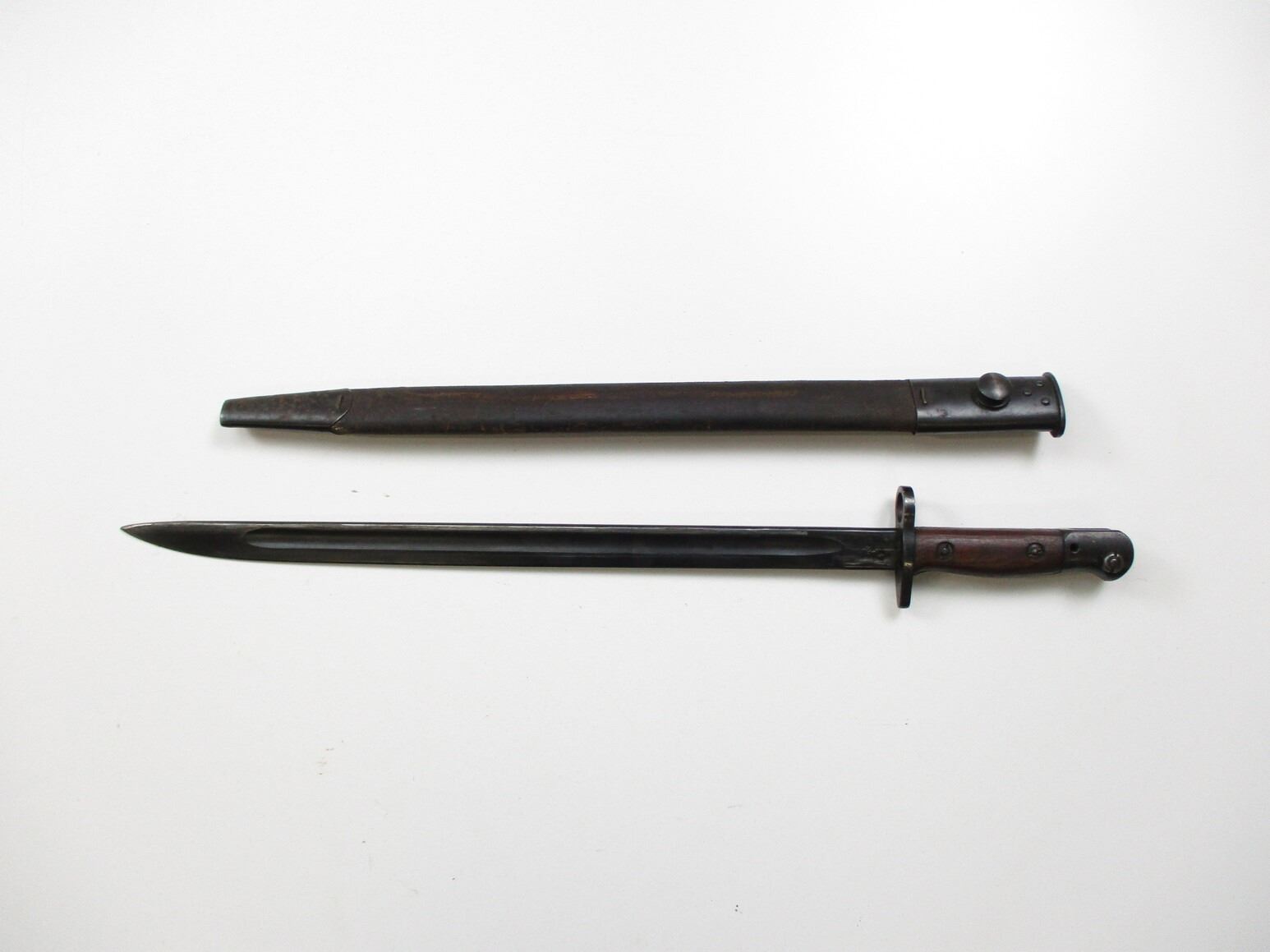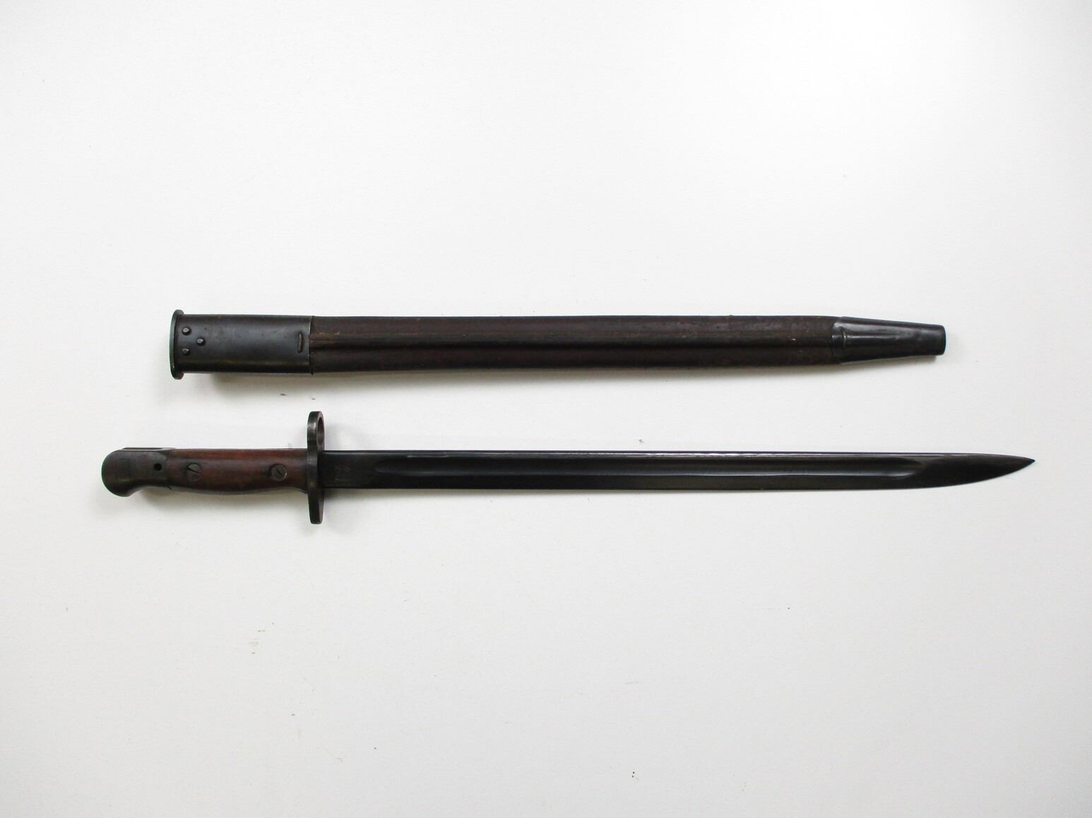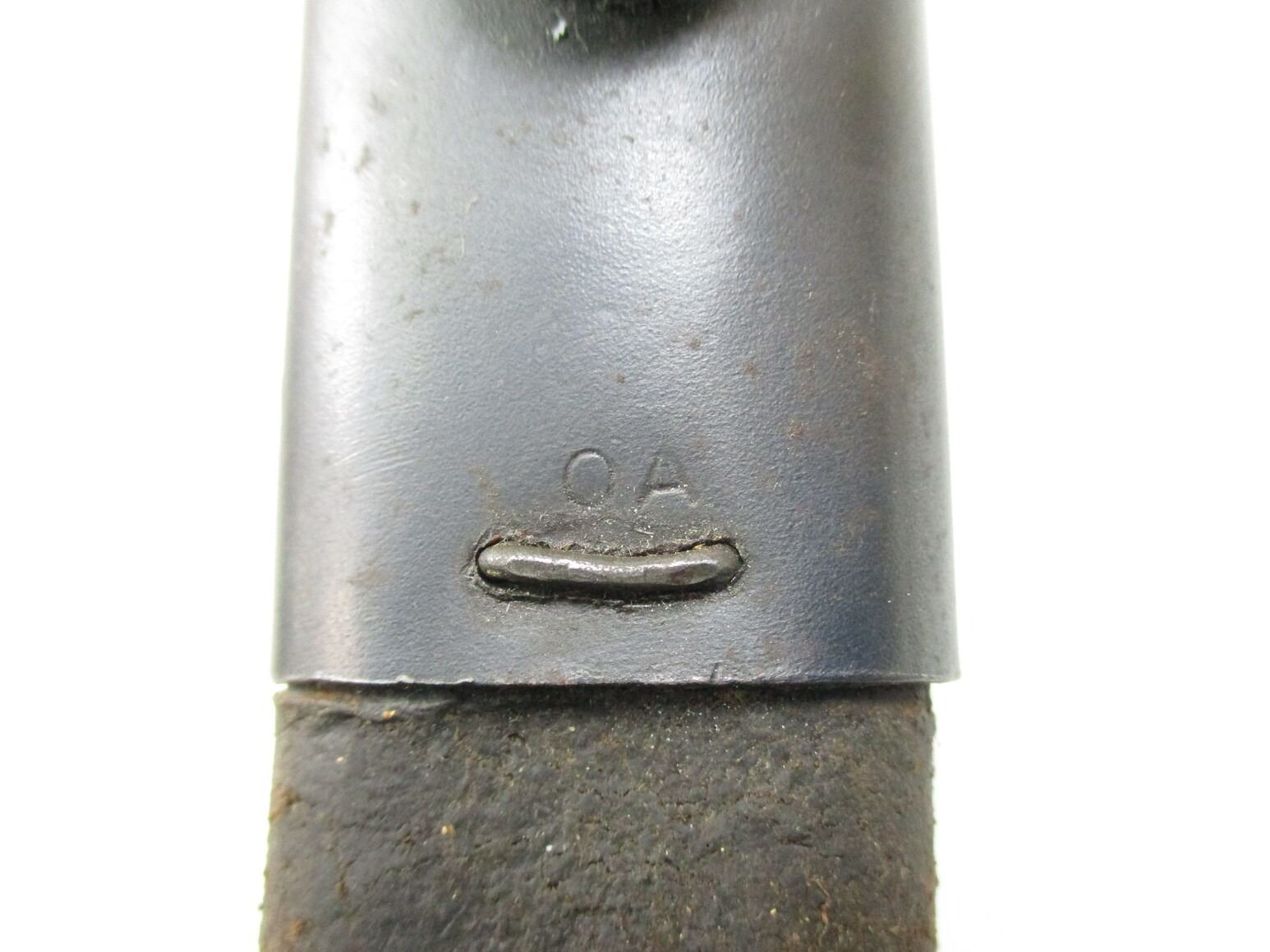 WWII AUSTRALIAN 1907 PATTERN BAYONET, (1) FITS .303 CALIBER SHORT MAGAZINE LEE-ENFIELD NO. I MK.III (SMLE) RIFLE, RICASSO MARKED: "A" OVER "1907" OVER "1" OVER "4" & "13", OPPOSITE SIDE MARKED: "X (BEND TEST)", "OA" & BROAD ARROW, 2-PIECE WOOD GRIP MARKED: "SLAZ44", METAL POMMEL MARKED: "40180" & "C", LEATHER & METAL SCABBARD MARKED: "OA", BLADE APPROX. 17" & OAL APPROX. 21 5/8".