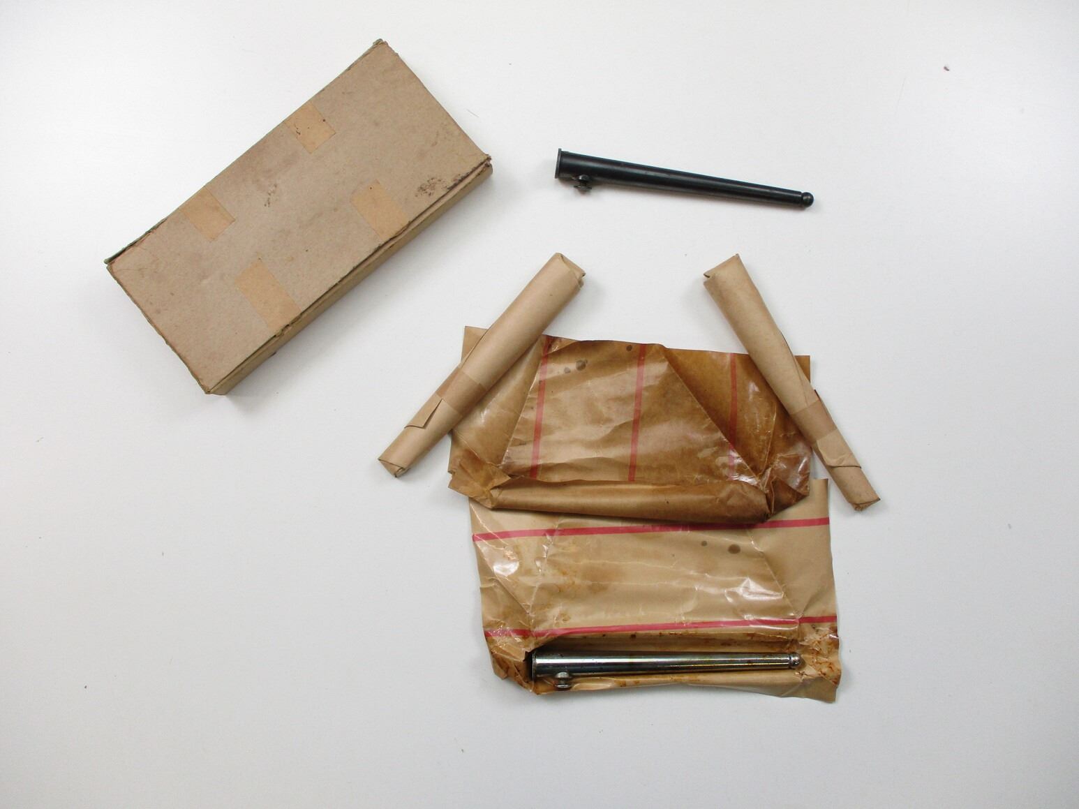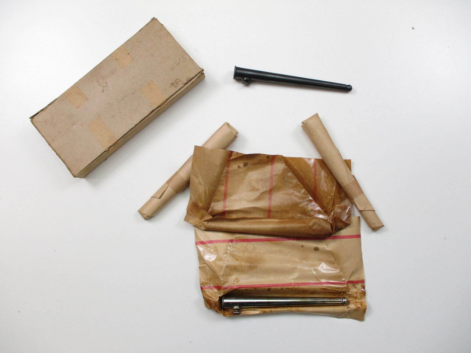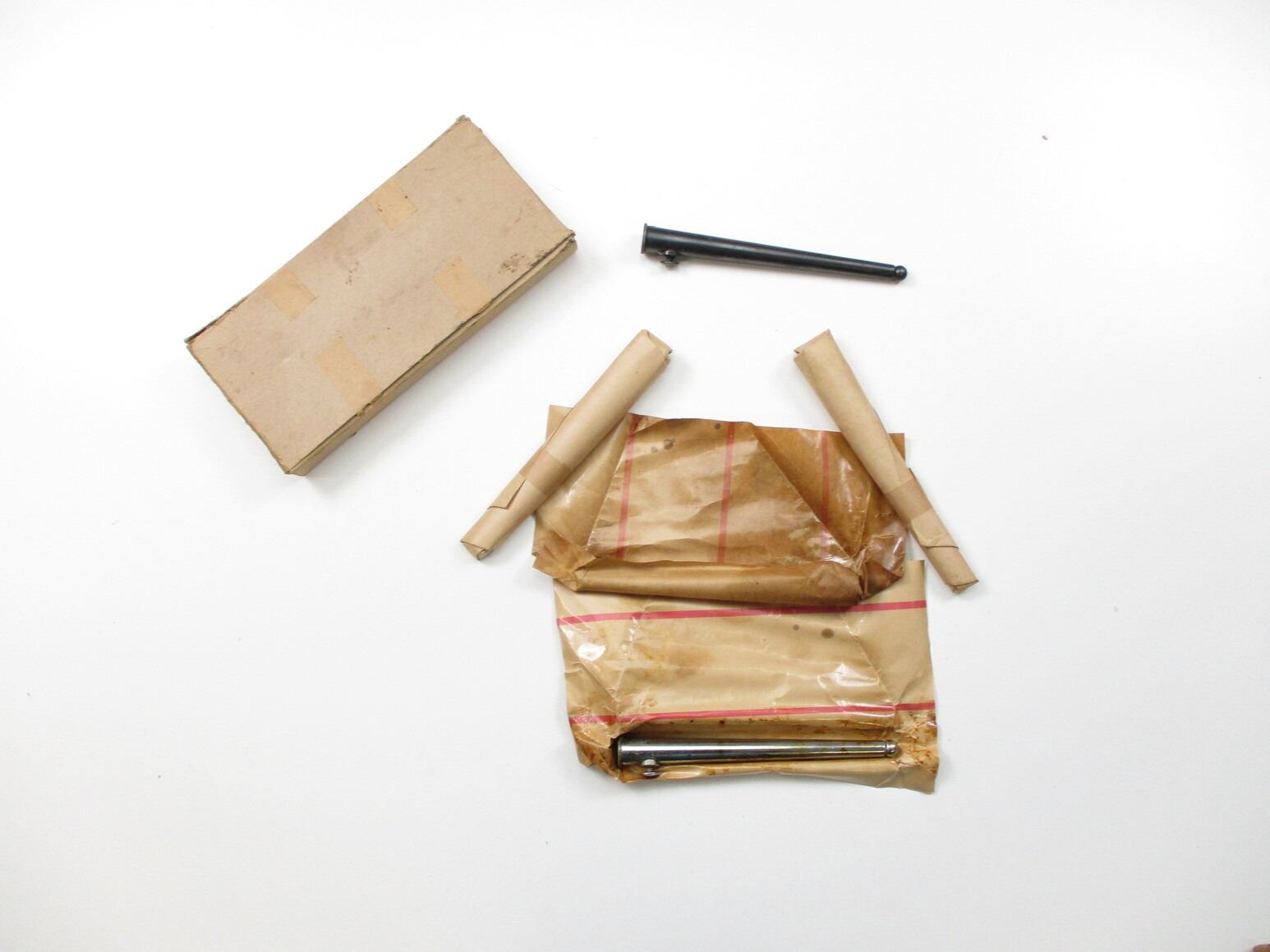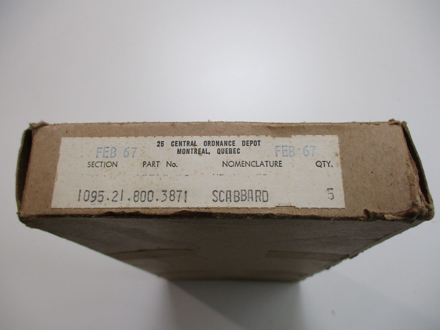 CANADIAN NO.4 SPIKE BAYONET SCABBARD LOT, (5) SCABBARDS IN ORIGINAL PACKAGING, FOUR NOS IN WRAP, ONE USED OUT OF WRAP, NO VISIBLE MARKINGS, BOX MARKED: "FEB 67". SEE PHOTOS.