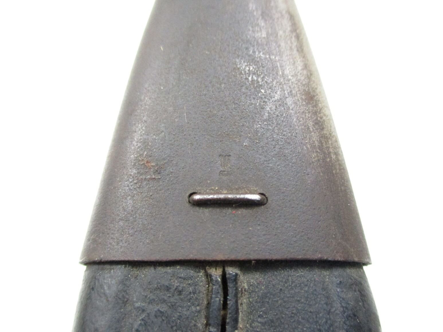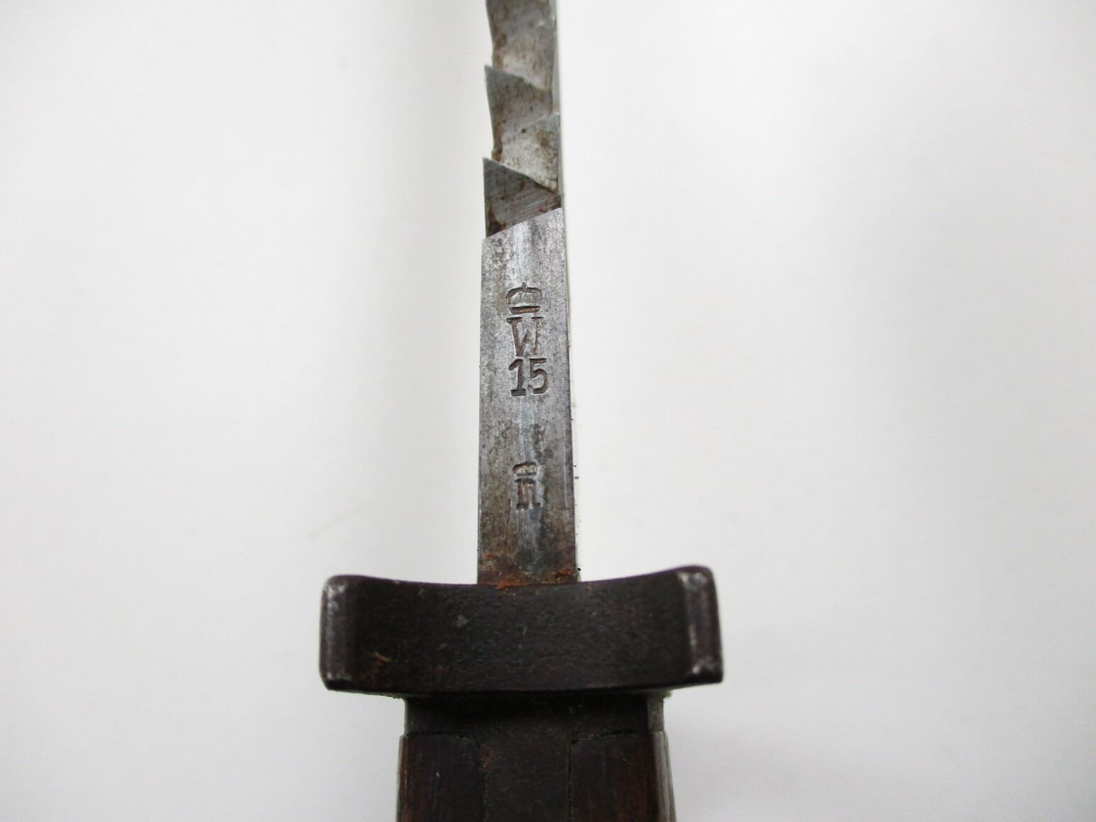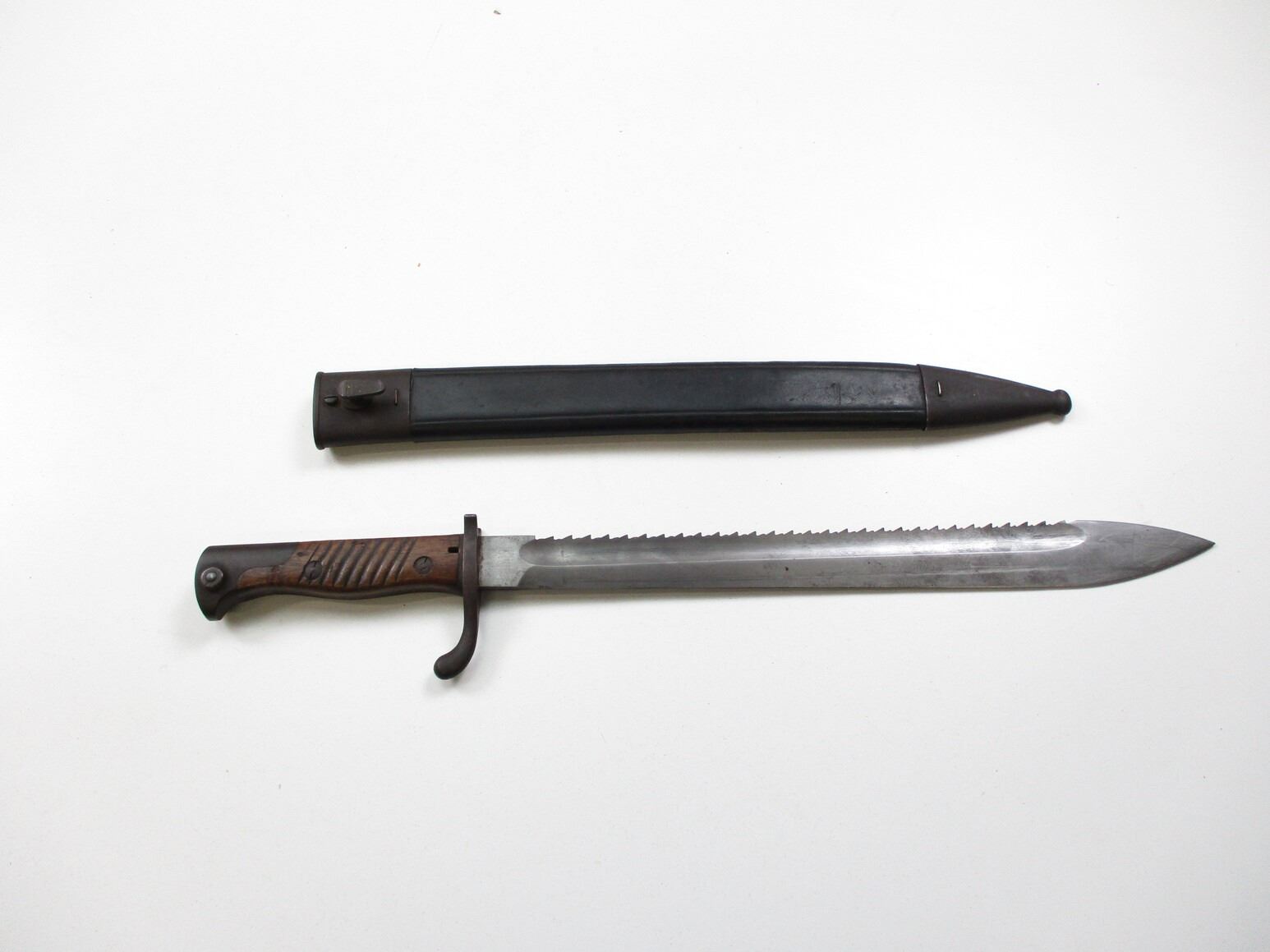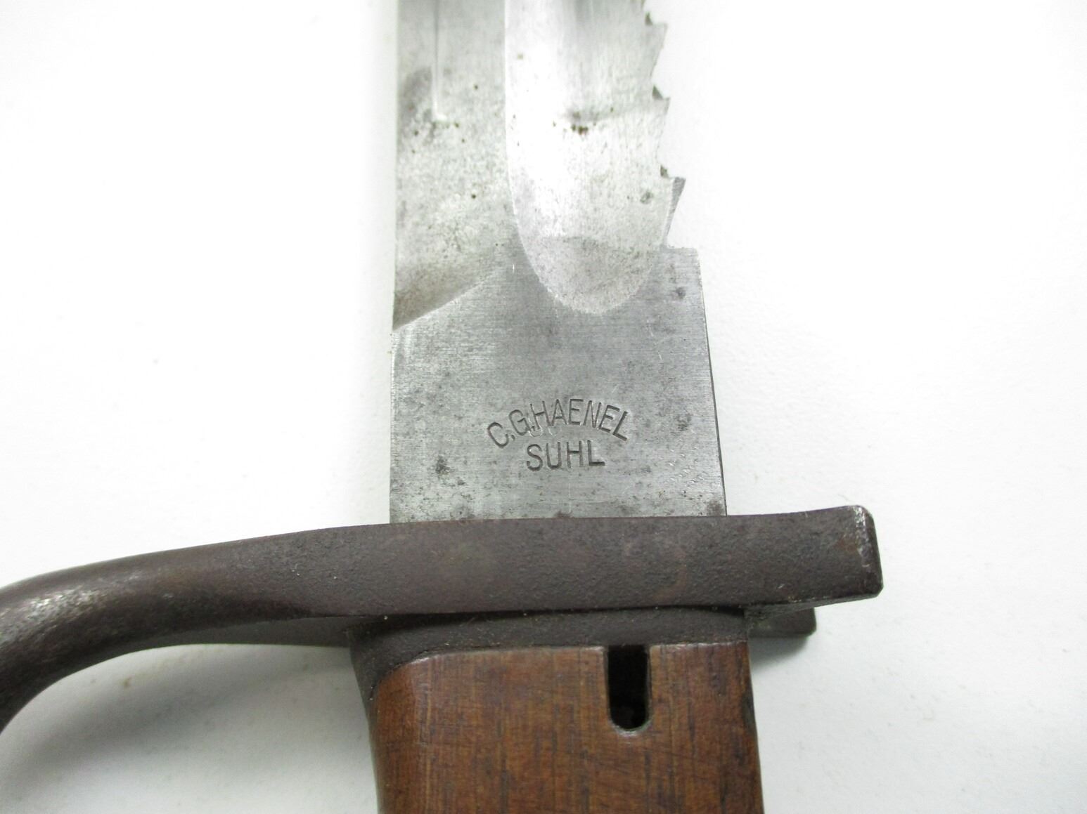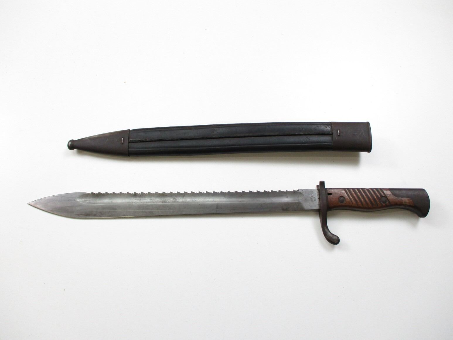 WWI GERMAN M1898/05 N/A SAWBACK BAYONET, (1) FITS 8MM MAUSER GEW 98 RIFLES, RICASSO MARKED: "C.G.HAENEL, SUHL", , BLADE SPINE MARKED: CROWN OVER "W" OVER "15", WITH FLASHGUARD, 2-PIECE WOOD GRIP, METAL POMMEL, FAINT / UN-CLEAR MARKINGS, LEATHER & METAL SCABBARD, NO VISIBLE MARKINGS, BLADE APPROX. 14 5/8" & OAL APPROX. 19 5/8".