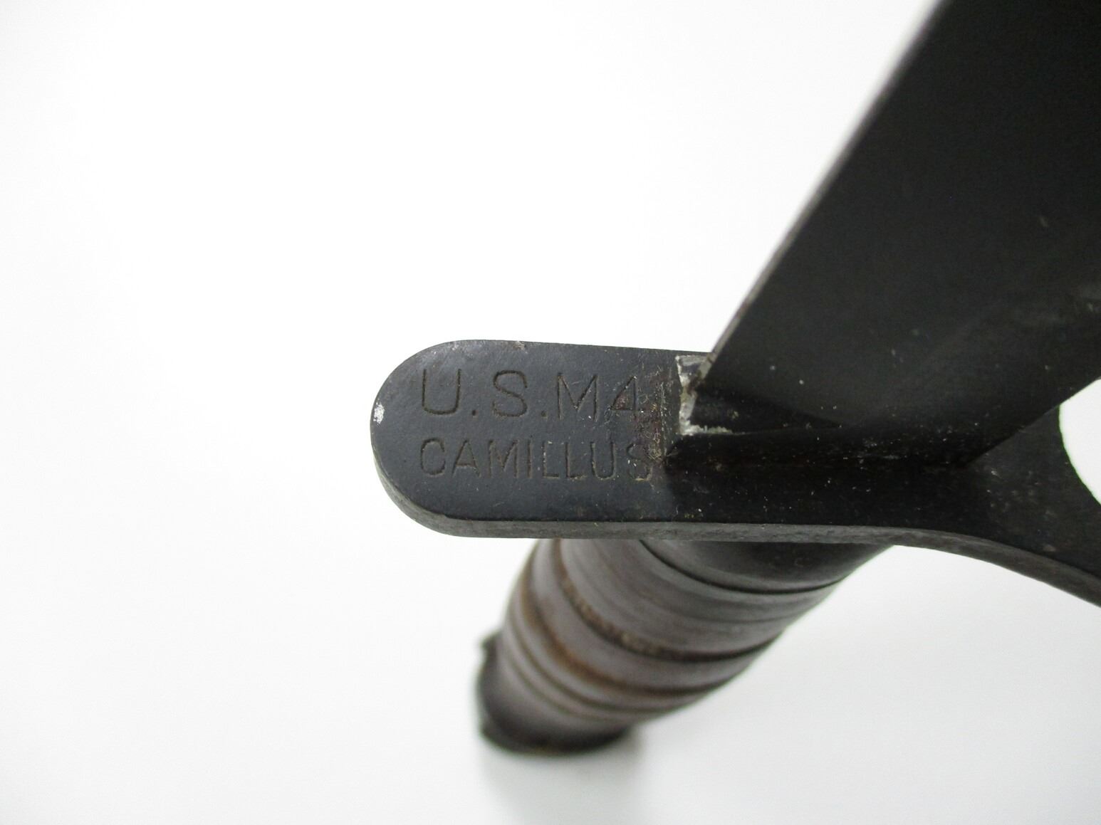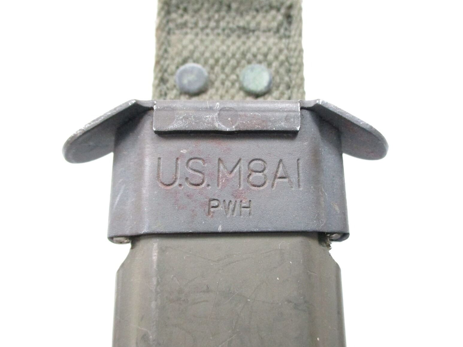 U.S. M4 KNIFE BAYONET, (1) FITS .30 U.S. CARBINE M1 RIFLES, CROSS-PIECE MARKED: ORDNANCE BOMB, "U.S. M4" & "CAMILLUS", HARD RUBBER GRIPS, METAL POMMEL MARKED: "SP" & 1 ?", FIBERGLASS SCABBARD MARKED: "U.S. M8A1" OVER "PWH", GREEN FROG WITH METAL BELT HANGER, NO VISIBLE MARKINGS, BLADE APPROX. 6.75" & OAL APPROX. 11 5/8".