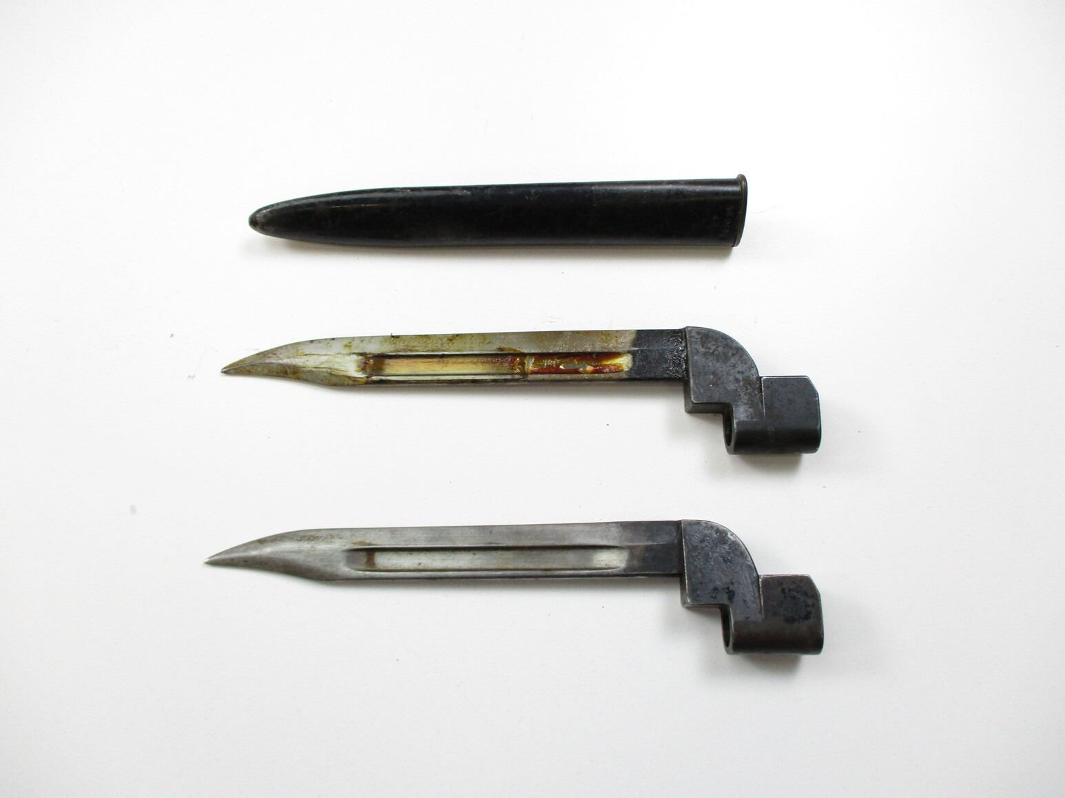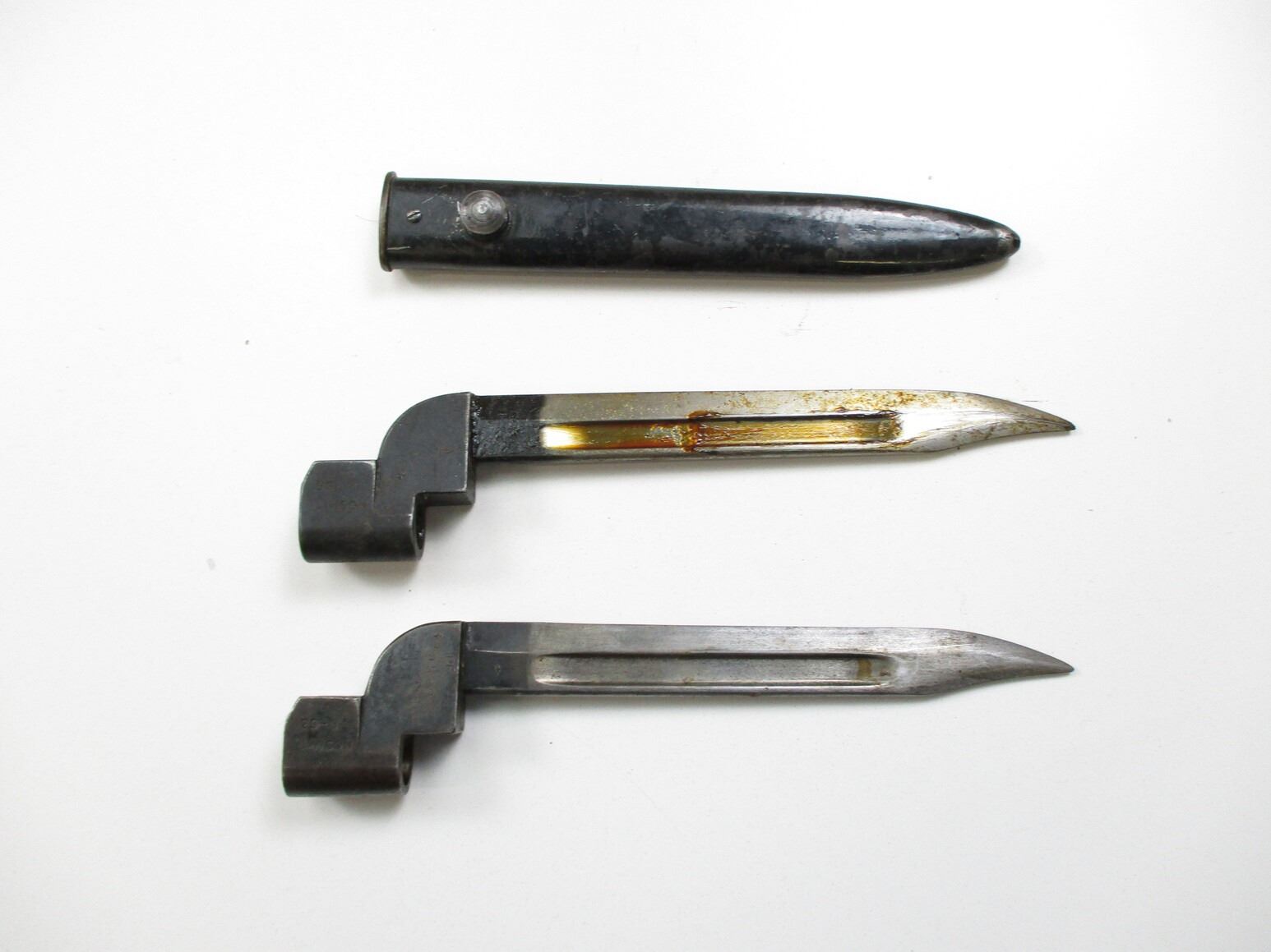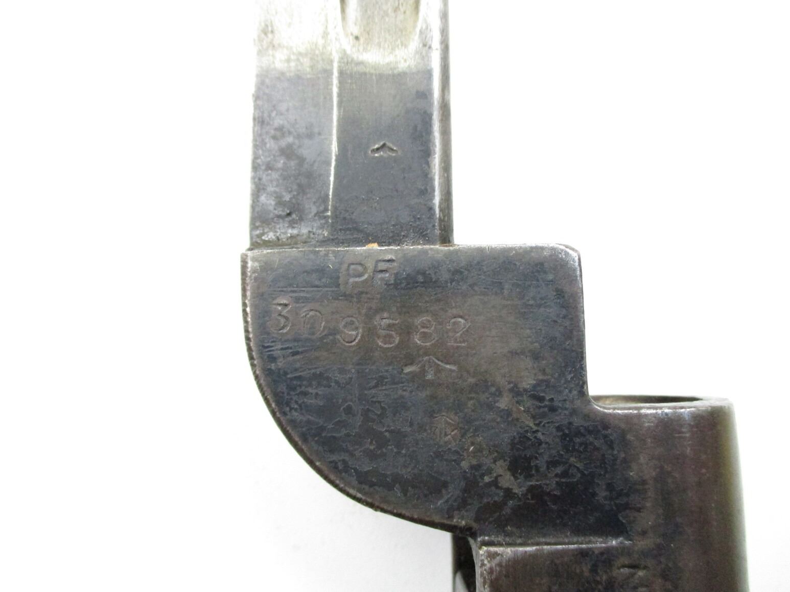 BRITISH NO.9 MKI BAYONET LOT, (2) FITS .303 LEE ENFIELD NO.4 MKI RIFLES, INCLUDES; (1) RICASSO MARKED: "NO9 MKI" OVER "D-53", "PF, 309583" & BROAD ARROW, NO SCABBARD & (1) I1) RICASSO MARKED: "NO9 MKI" OVER "D-55", METAL SCABBARD MARKED: "PF, 329035". EACH BLADE APPROX. 8" & OAL APPROX. 10 1/8".