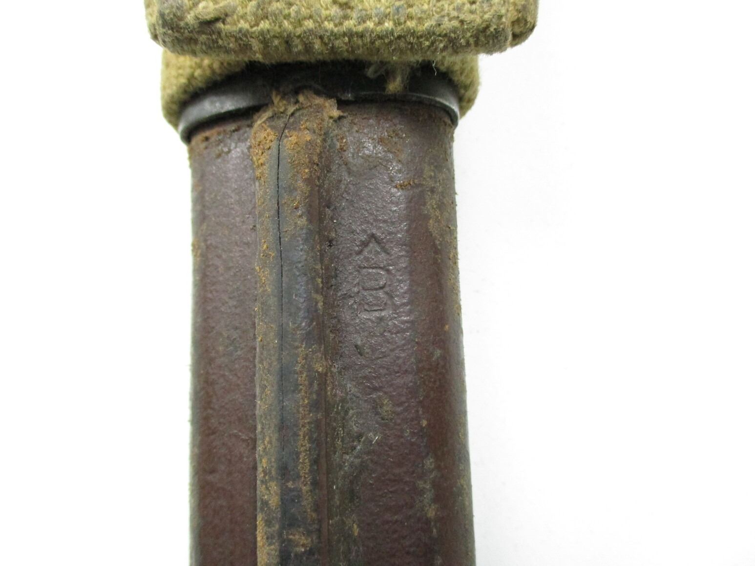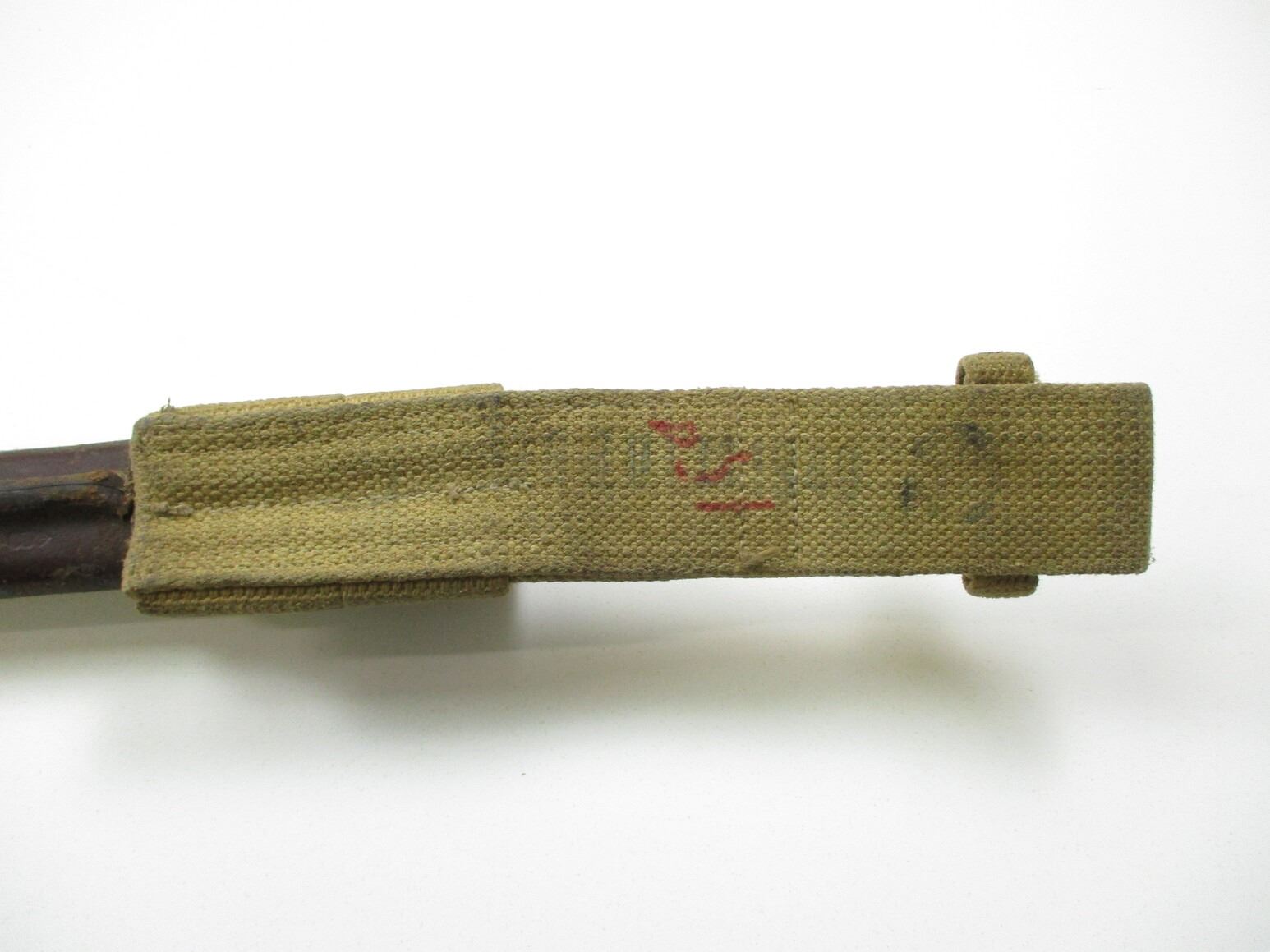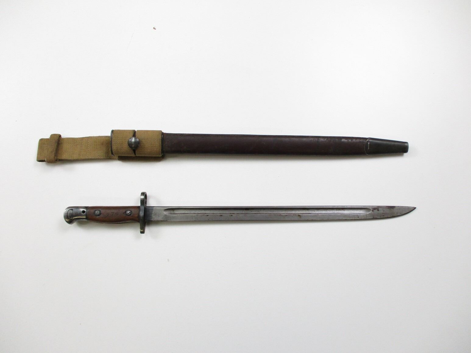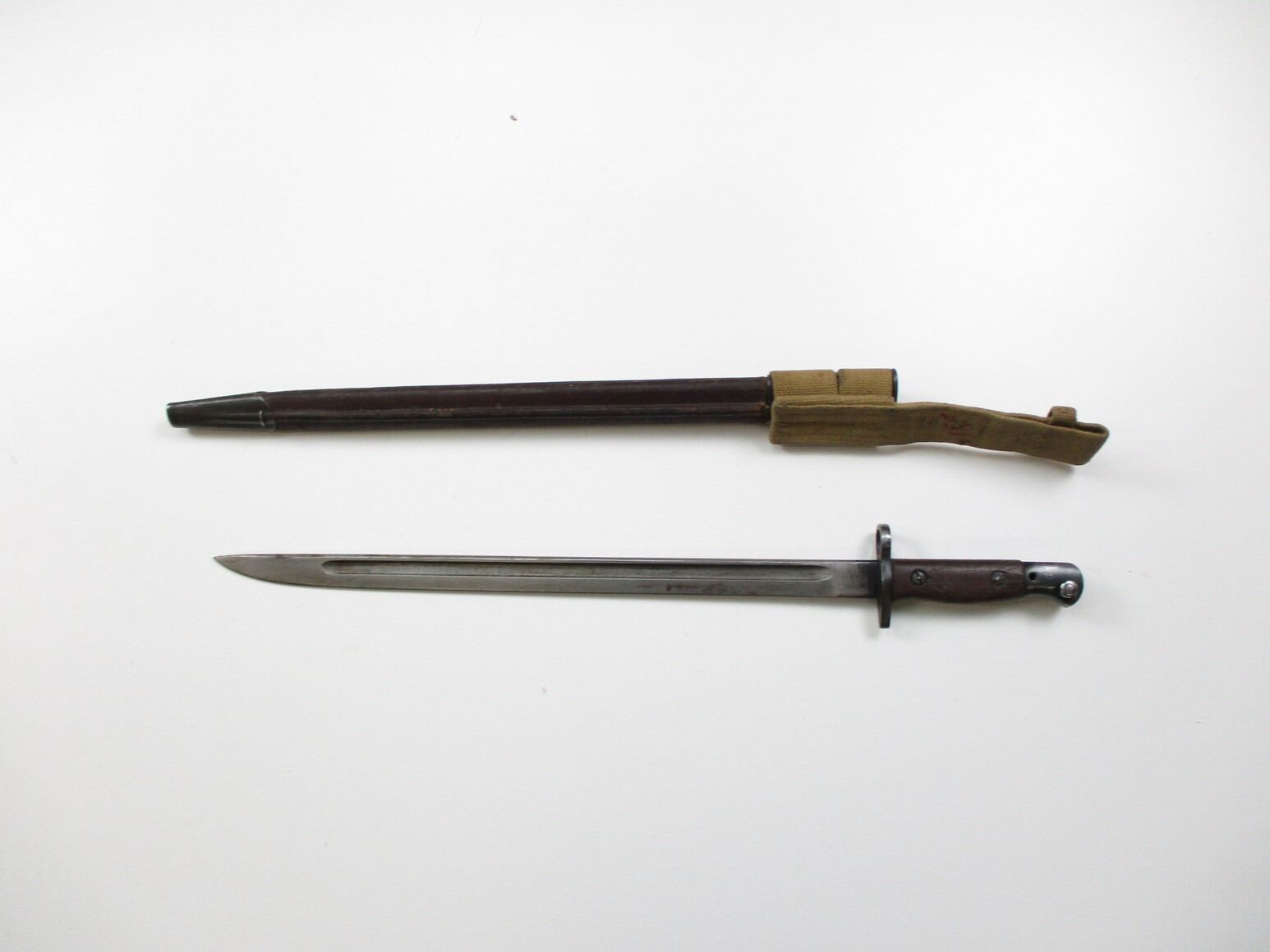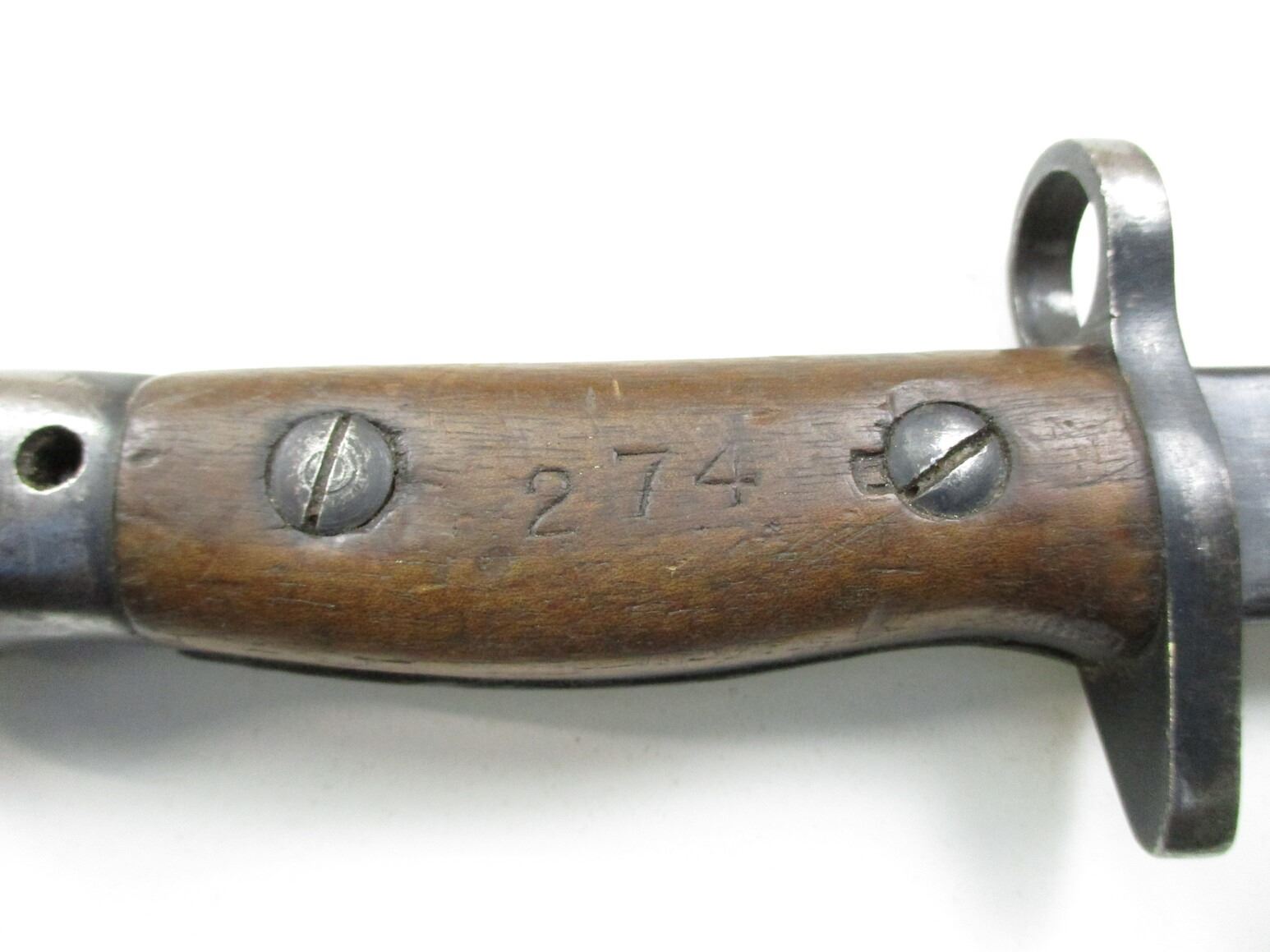 WWI CANADIAN 1907 PATTERN BAYONET, (1) FITS .303 CALIBER SHORT MAGAZINE LEE-ENFIELD NO. I MK.II RIFLE, RICASSO MARKED: "1907" OVER "SANDERSON", OTHER-SIDE MARKED: "2D" OVER "E", NO QUILLON, 2-PIECE WOOD GRIP MARKED: "274", METAL POMMEL WITH C-BROAD ARROW, LEATHER & METAL SCABBARD, NO VISIBLE MARKINGS, CANVAS FROG WITH C-BROAD ARROW, BLADE APPROX. 16.75" & OAL APPROX. 21 3/8".