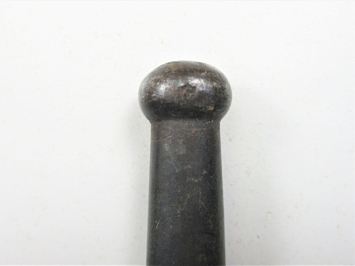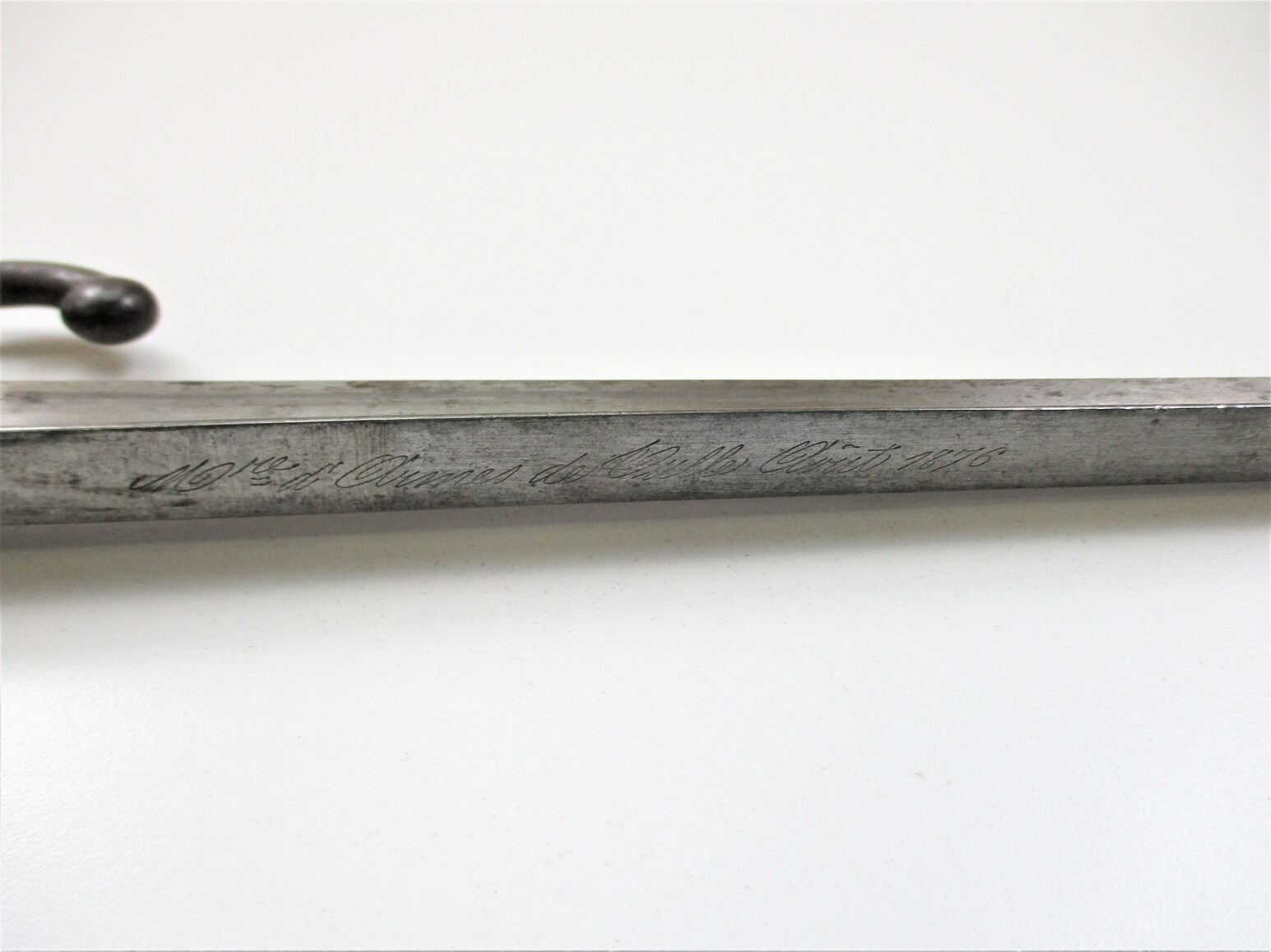 FRENCH M1874 T-BACK SWORD BAYONET, (1) FITS 11MM M1874 GRAS RIFLES, RICASSO WITH MAKER'S MARK, BLADE SPINE MARKED: "MRE D'ARMES DE TULLE AOUT 1876", CROSS-PIECE MARKED: "P 73320" & VARIOUS UN-CLEAR MARKINGS, BENT QUILLON, 2-PIECE WOOD GRIP, METAL POMMEL, NO VISIBLE MARKINGS, METAL SCABBARD MARKED: "H 95554", BLADE APPROX. 20.75" & OAL APPROX. 25 3/8".