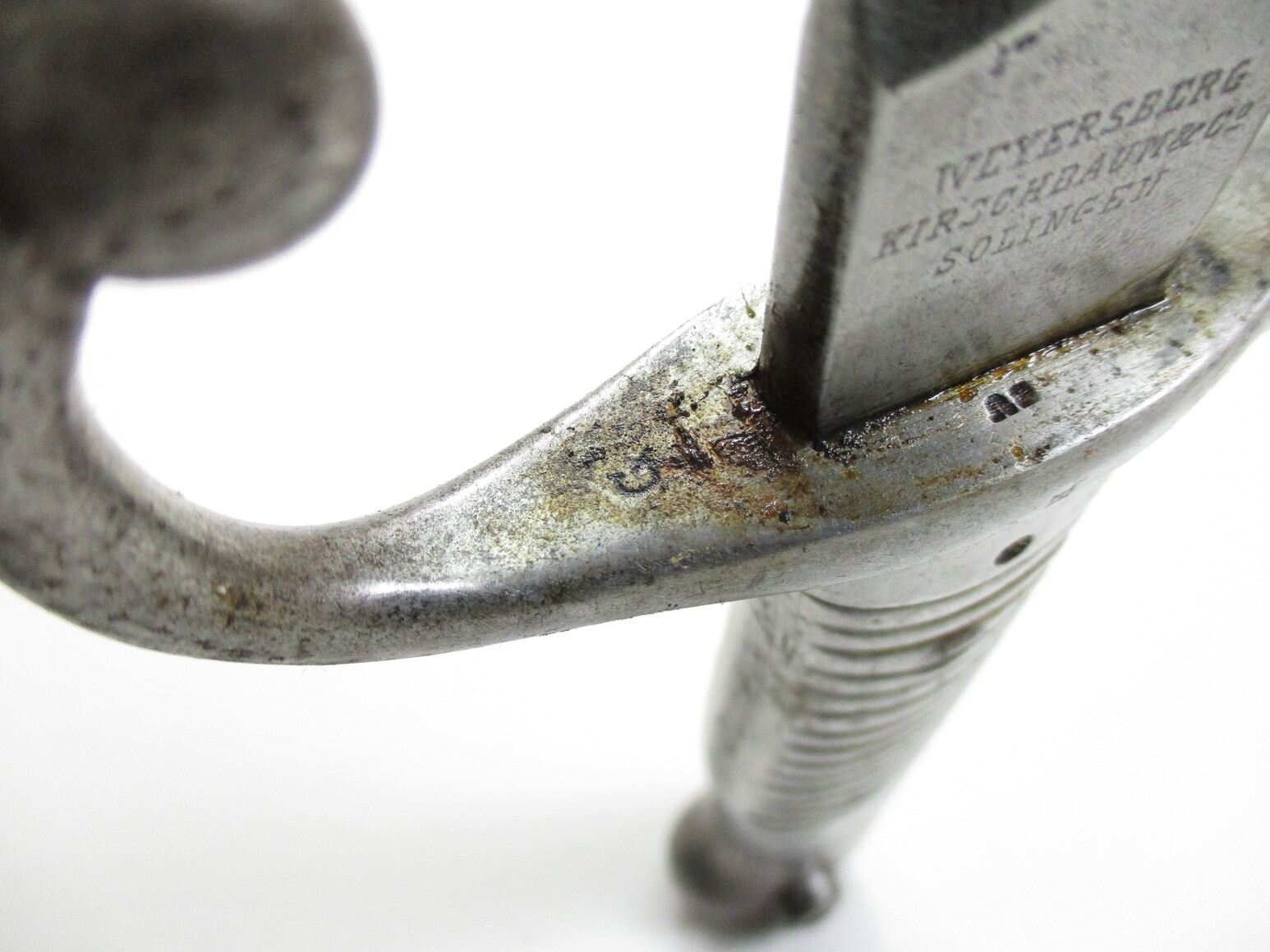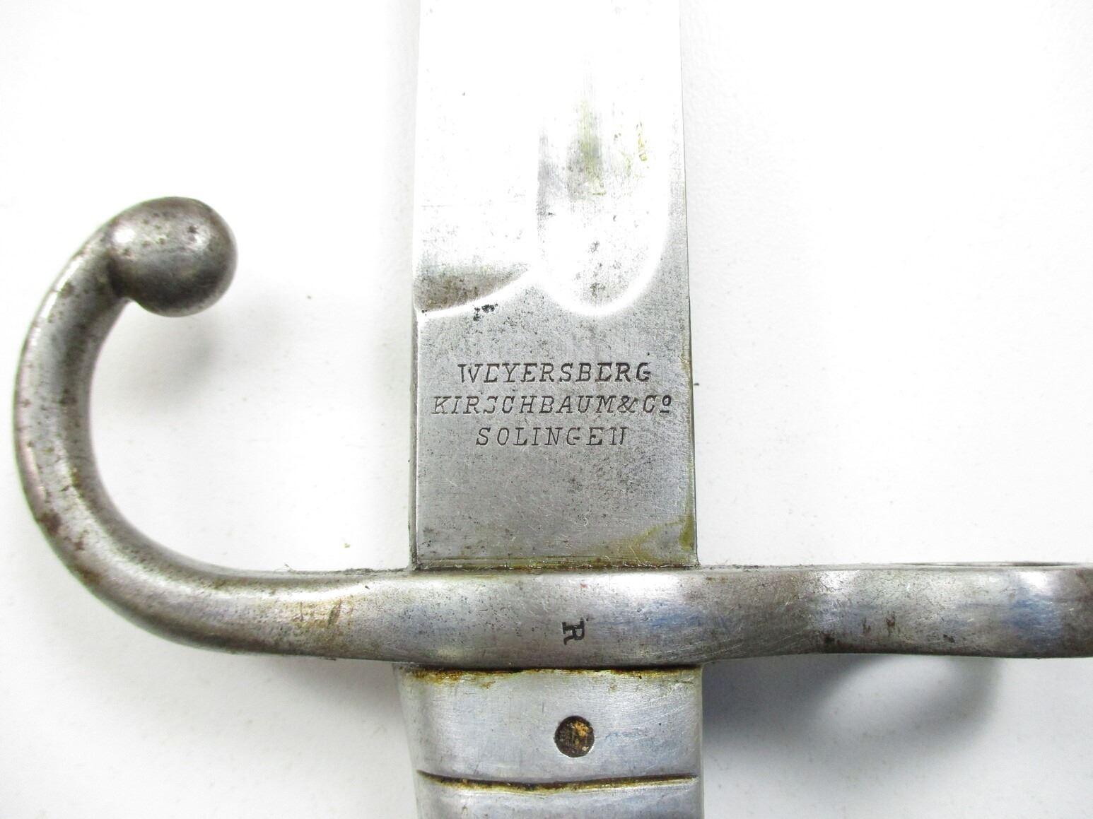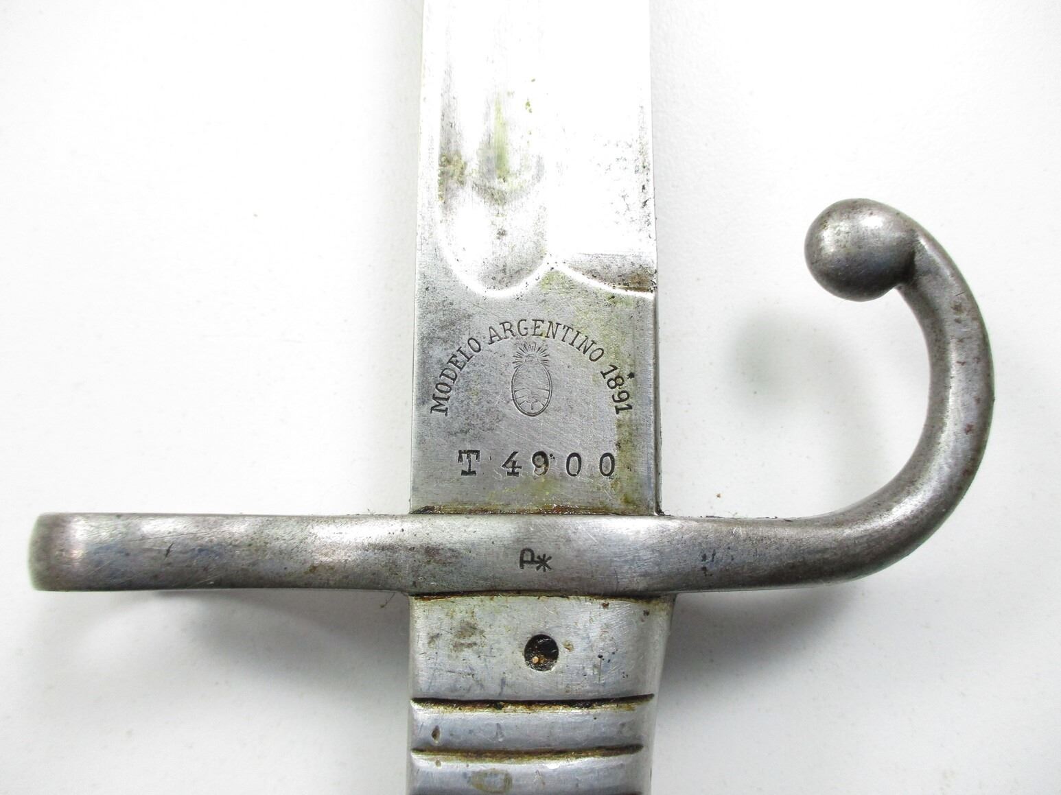 ARGENTINE M1891 SWORD BAYONET, (1) FITS 7.65MM ARGENTINE M1891 MAUSER RIFLES, RICASSO MARKED: "MODELO ARGENTINO 1891" OVER PROOF MARK OVER "T4900", OTHER-SIDE MARKED: "WEYERSBERG, KIRSCHBAUM & CO., SOLINGEN", METAL GRIP & POMMEL, NO VISIBLE MARKINGS, METAL SCABBARD MARKED: "E", BLADE APPROX. 15.75" & OAL APPROX. 20 3/867".