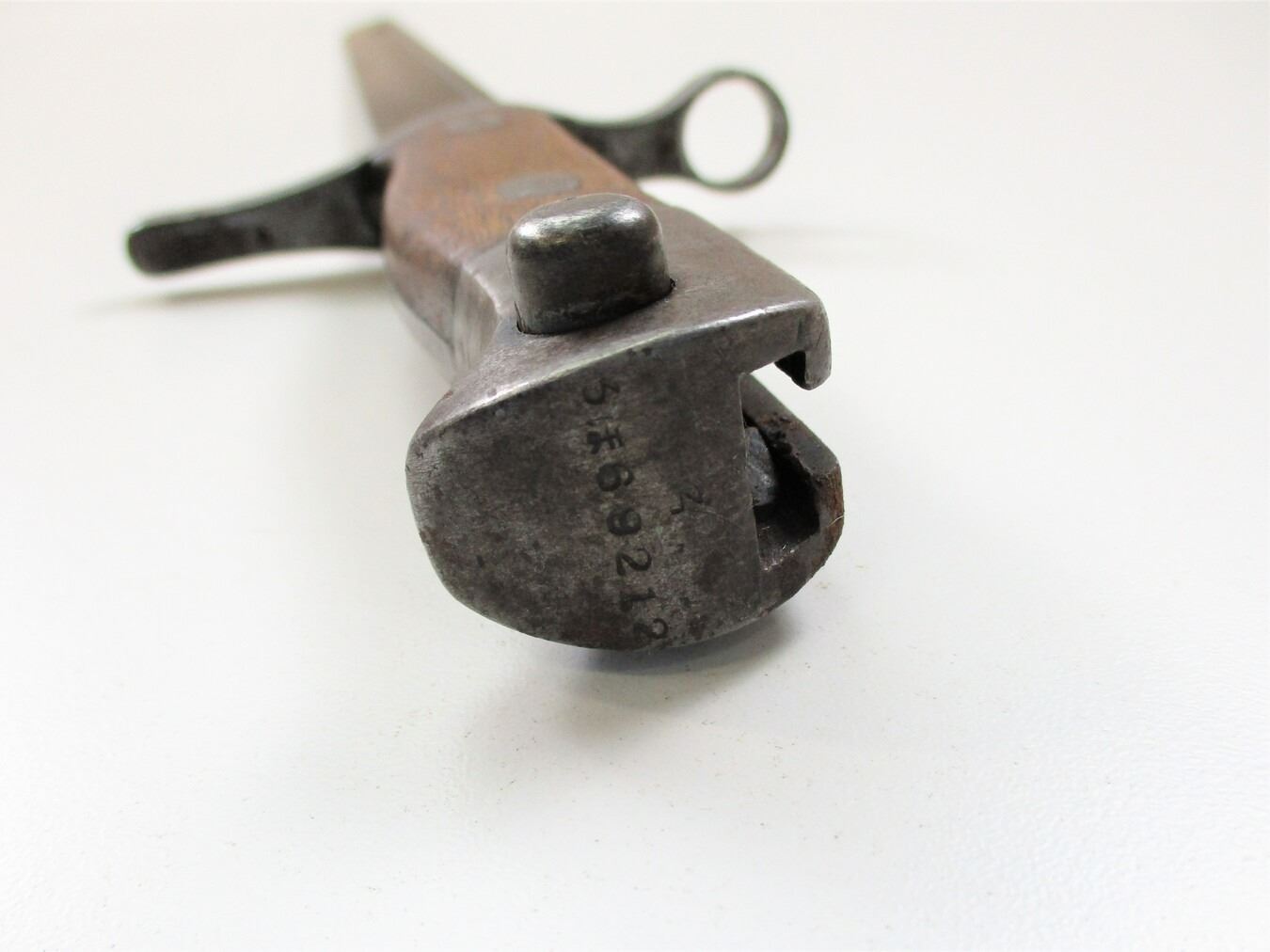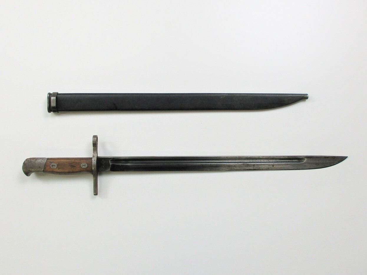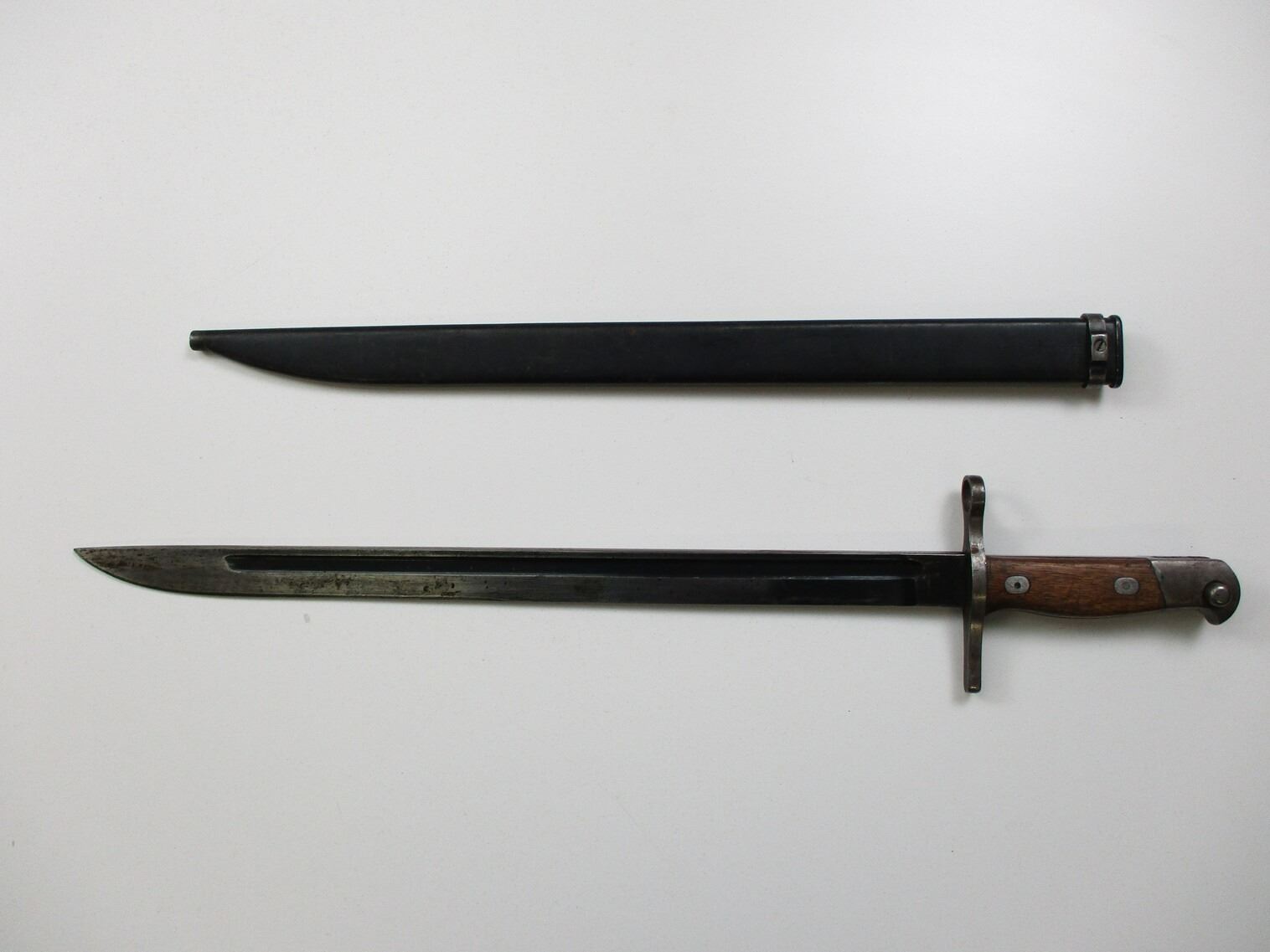 WWII JAPANESE TYPE 30 MID-WAR BAYONET, (1) FITS THE MID-WAR 7.7MM TYPE 99 SHORT RIFLE, BLUED BLADE, RICASSO ARSENAL MARKED, 2-PIECE WOOD GRIPS, METAL POMMEL MARKED: "69212" & OTHER MARKINGS, METAL SCABBARD, NO VISIBLE MARKINGS, BLADE APPROX. 15.75" & OAL APPROX. 20".