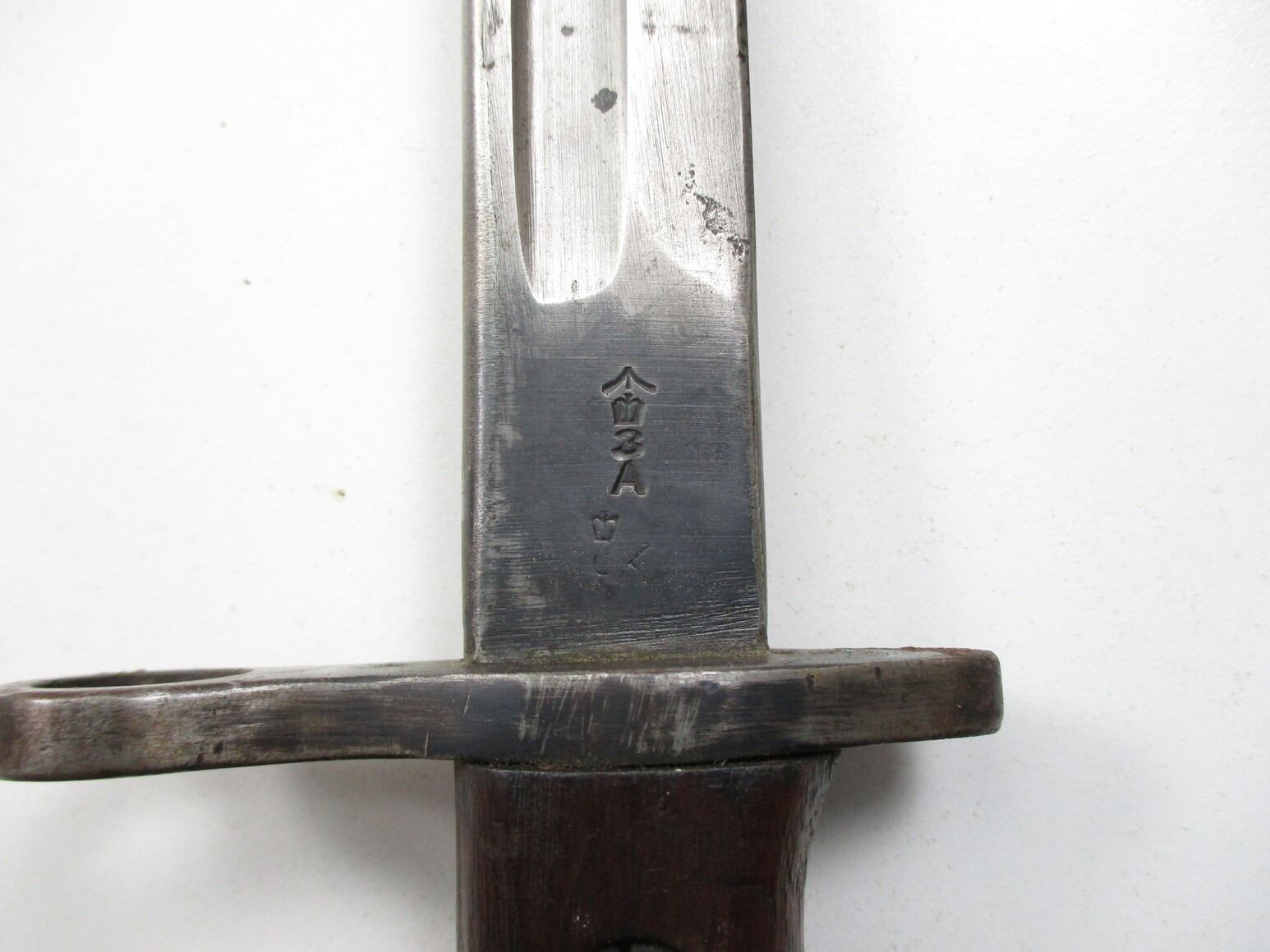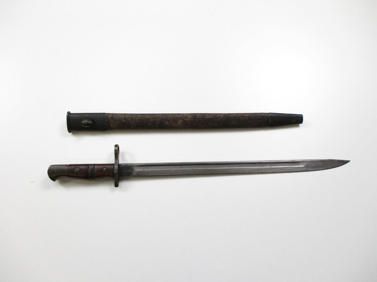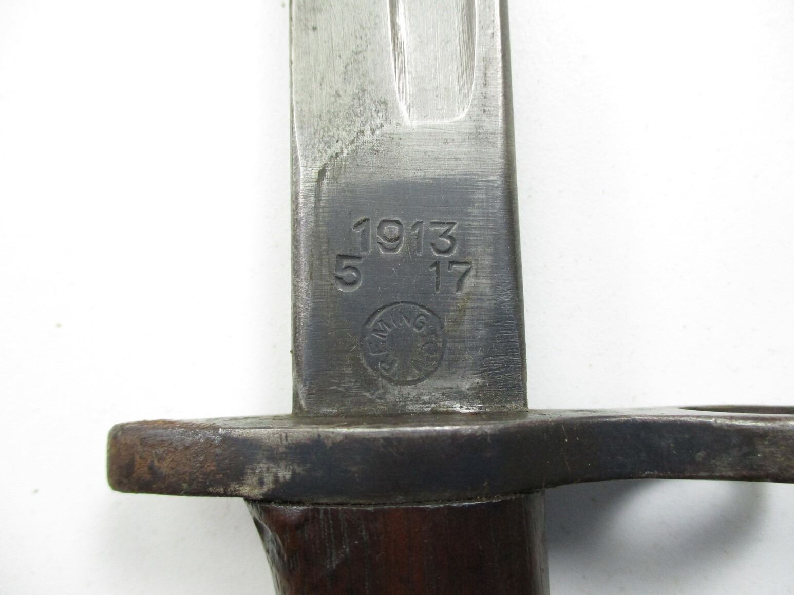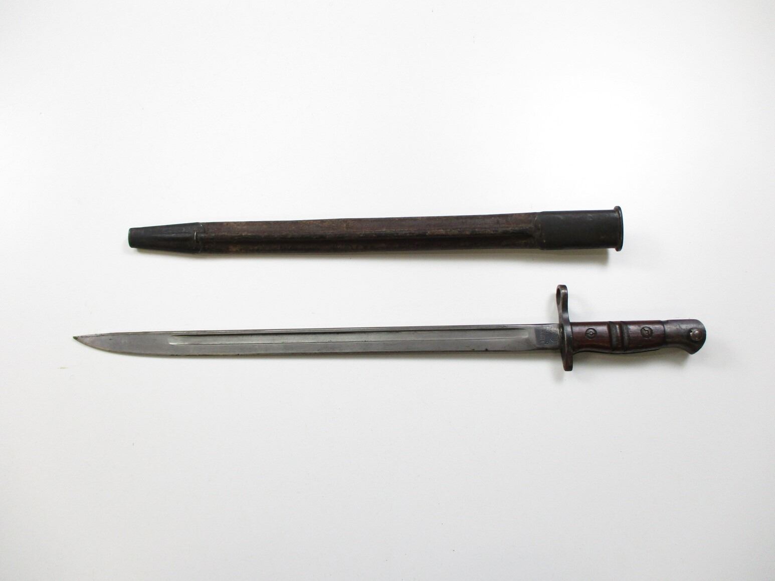 WWI BRITISH ENFIELD 1913 PATTERN BAYONET, (1) FITS 1914 PATTERN ENFIELD RIFLES, RICASSO MARKED: "1913, 5 17, REMINGTON", OTHER-SIDE MARKED: CROWN OVER "3" OVER "A" & BROAD ARROW, 2-PIECE GROOVED WOOD GRIP, METAL POMMEL, NO VISIBLE MARKINGS, LEATHER & METAL SCABBARD, NO VISIBLE MARKINGS, BLADE APPROX. 17 1/8" & OAL APPROX. 22.75".