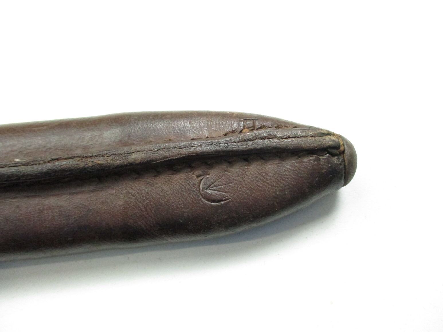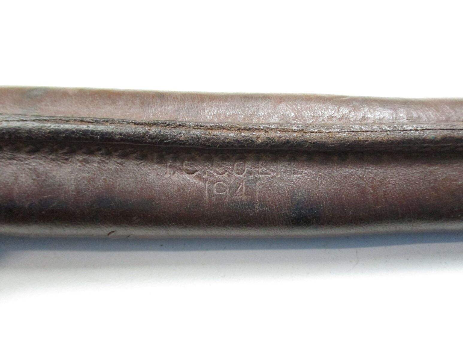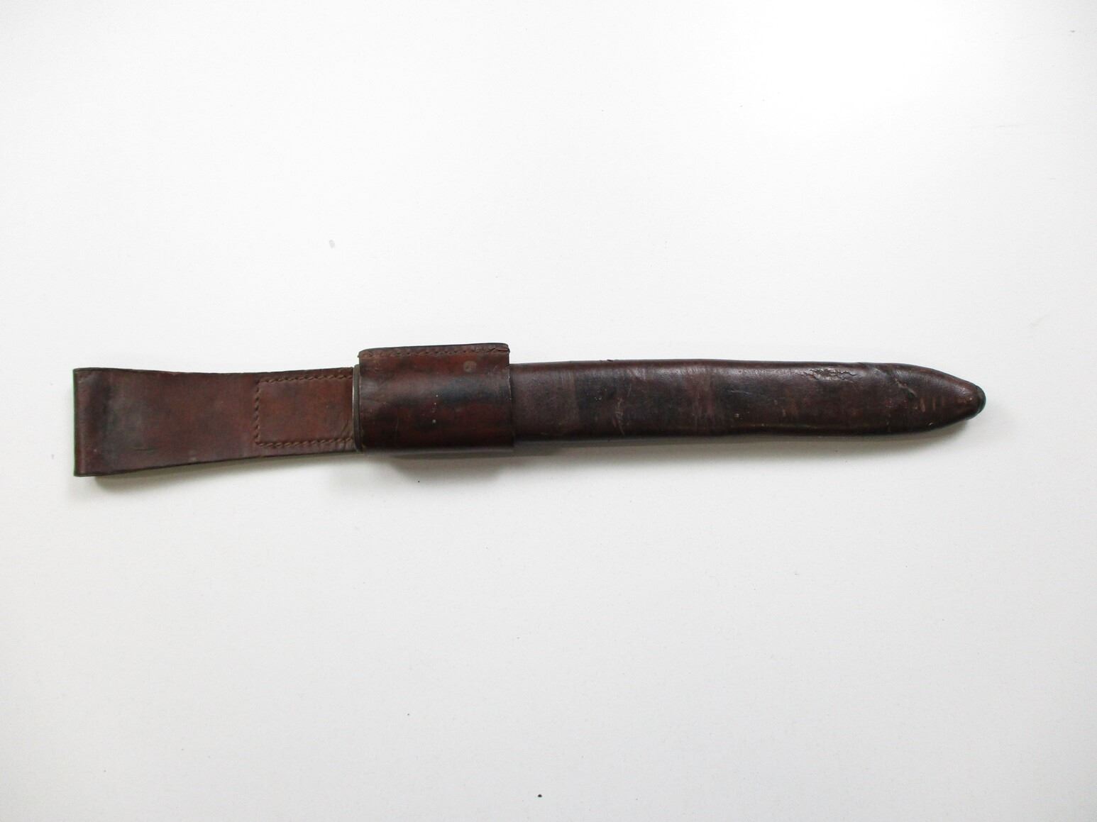 WWII ROSS RIFLE BAYONET SCABBARD, (1) FITS BOTH ROSS RIFLE PATTERN BAYONETS, BROWN LEATHER WITH METAL THROAT & BELT LOOP, MARKED: "H.C.CO.LTD, 1941", OAL APPROX. 16.5" (BELT LOOP INCLUDED). SEE PHOTOS.