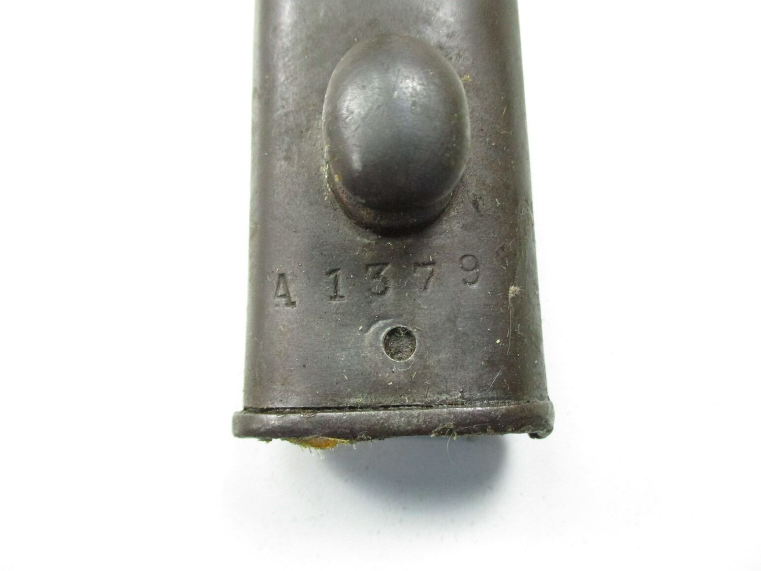 ARGENTINE M1891/31 ENGINEER'S BAYONET, (1) FITS 7.65MM M1891/31 ENGINEER'S CARBINES, RICASSO MARKED: "?. KIRSCHBAUM, SOLINGEN", OTHER-SIDE MARKED: "A1379", HOOKED QUILLON, BRASS GRIP / POMMEL, NO VISIBLE MARKINGS, METAL SCABBARD WITH MATCHING NUMBERS, MARKED: "A1379", BLADE APPROX. 10" & OAL APPROX. 14 5/8".