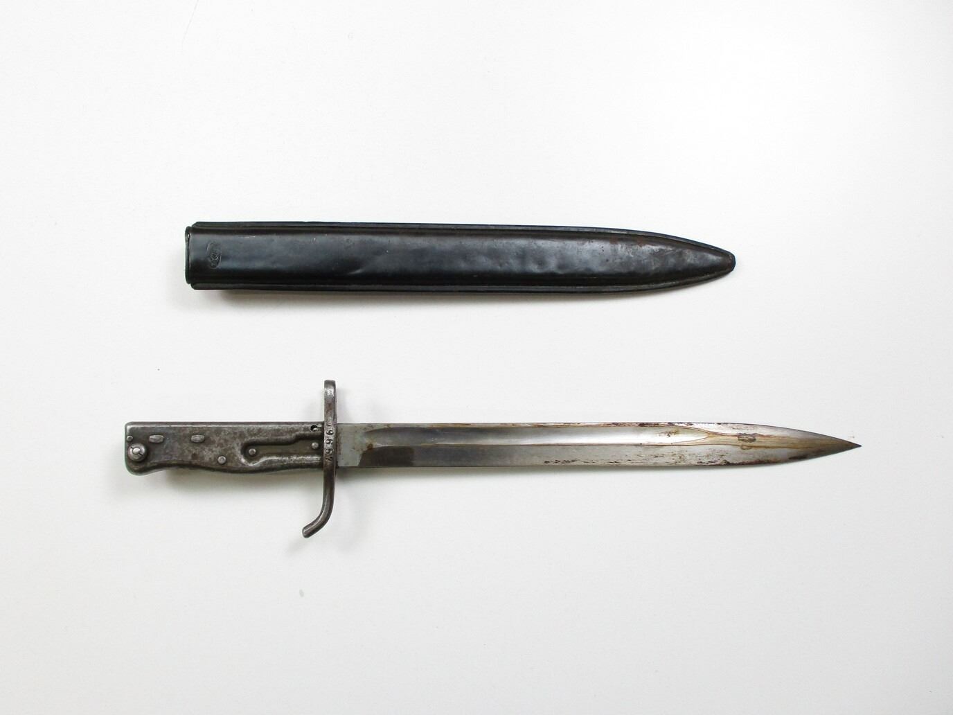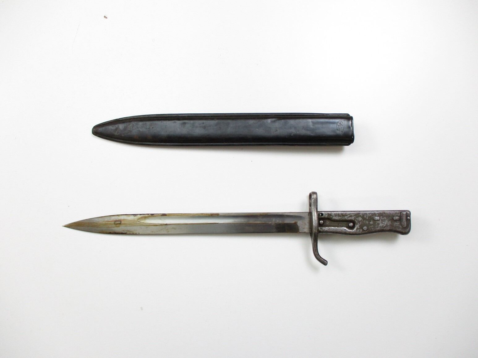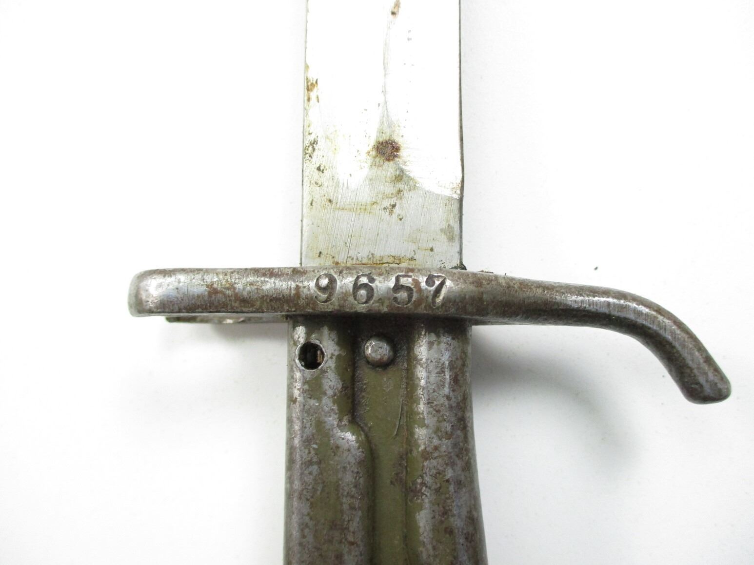 WWI GERMAN ERSATZ BAYONET, (1) FITS 8MM MAUSER GEW 98 & EARLIER M1888 COMMISSION RIFLES DUE TO TWO-STEP MUZZLE RING, RICASSO WITH CROWN & FAINT MARKING, CROSS-PIECE MARKED: "9657", METAL GRIP / POMMEL, NO VISIBLE MARKINGS, METAL SCABBARD WITH BLACK RUBBER COVER MARKED: "FAG (FISCHERS ASTIEN-GESELLSCHAFT)", BLADE APPROX. 12.5" & OAL APPROX. 17".